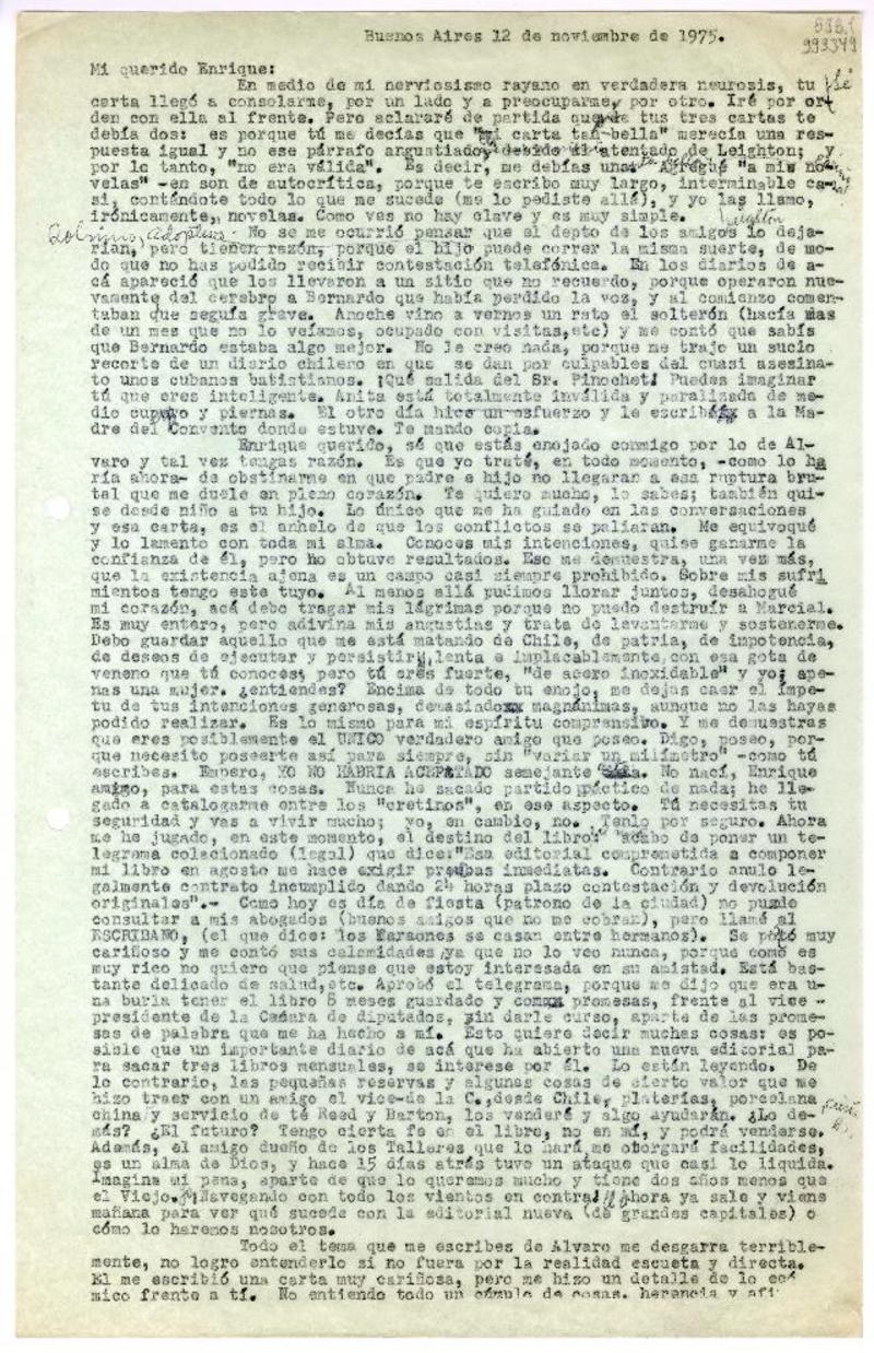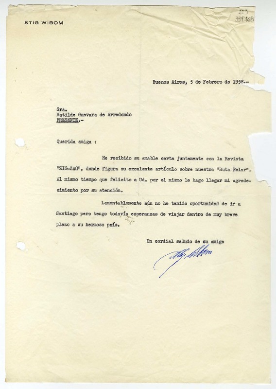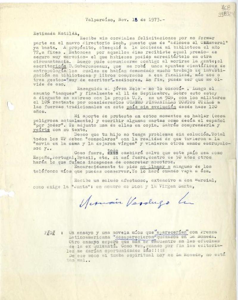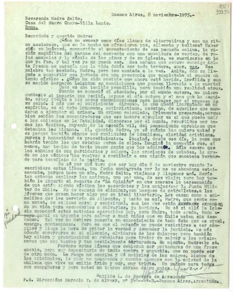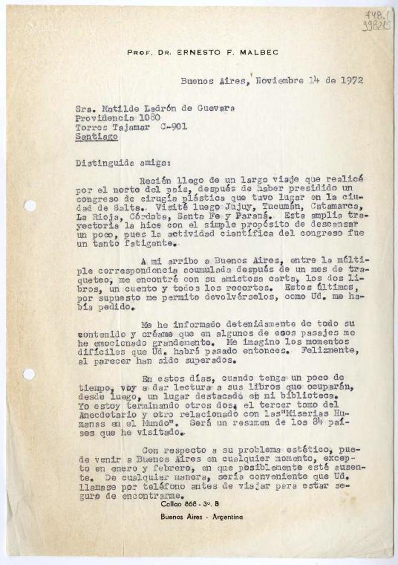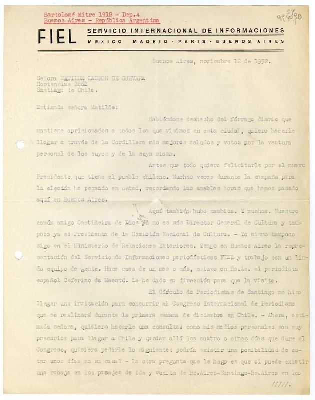 [Carta] 1952 noviembre 12, Buenos Aires, República Argentina [a la] Señora Matilde Ladrón de Guevara, Santiago de Chile [manuscrito] Hellmuth von Engels.