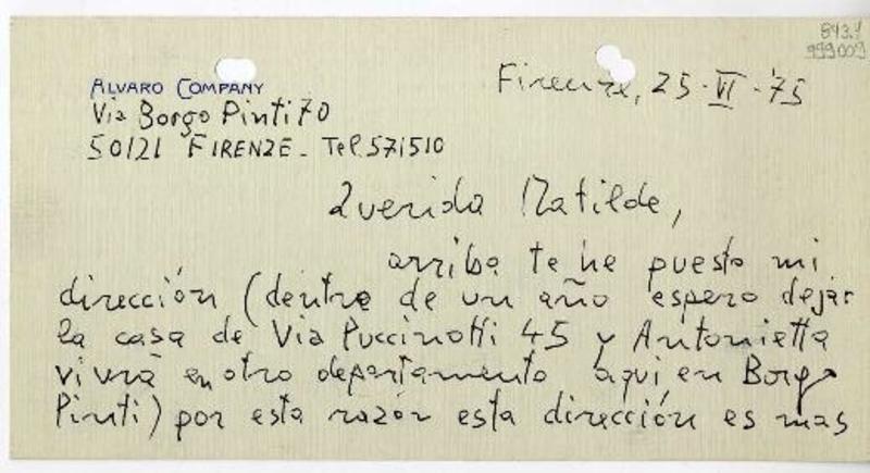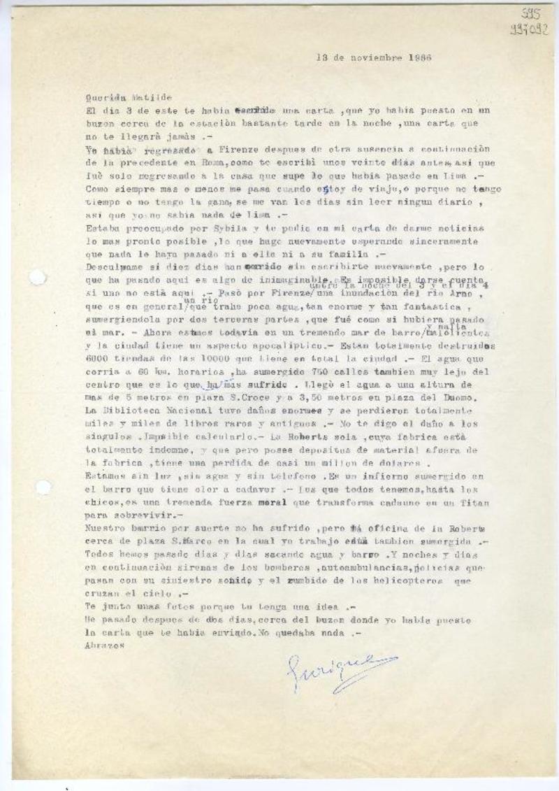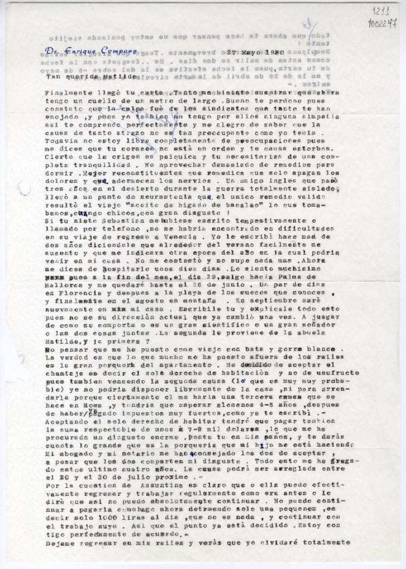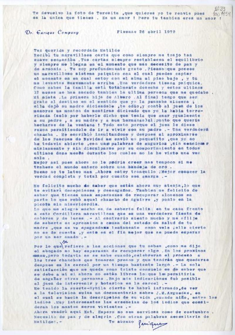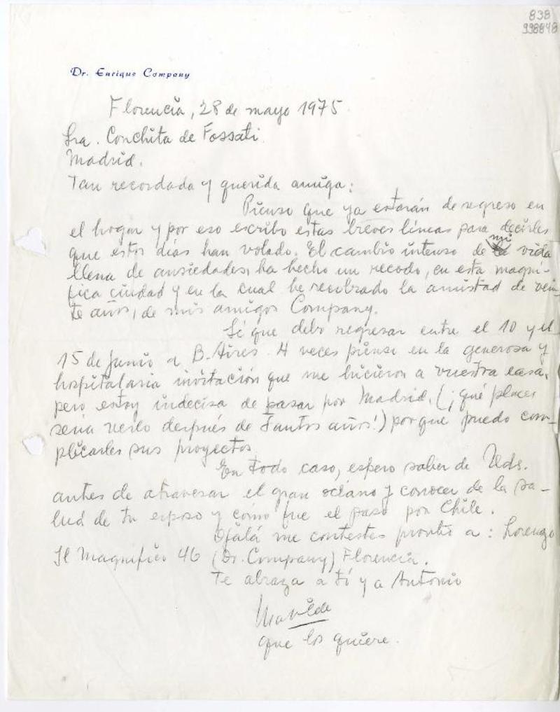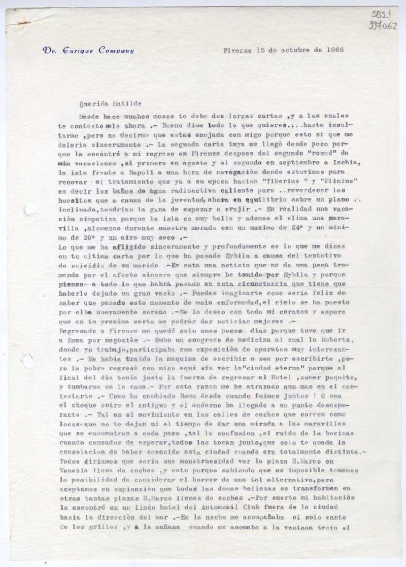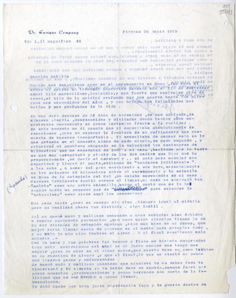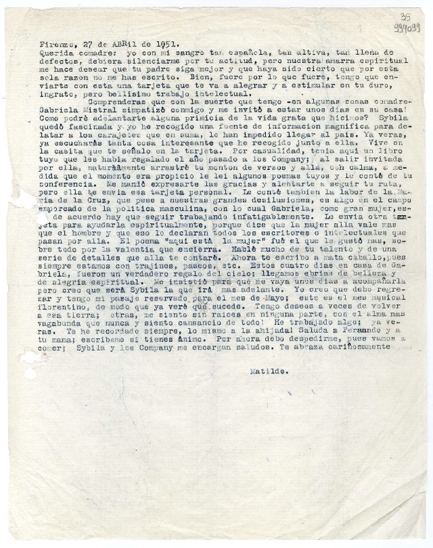 [Carta] 1951 abril 27, Firenze, [Italia] [a] Querida comadre [María de la Cruz] [manuscrito] Matilde Ladrón de Guevara.