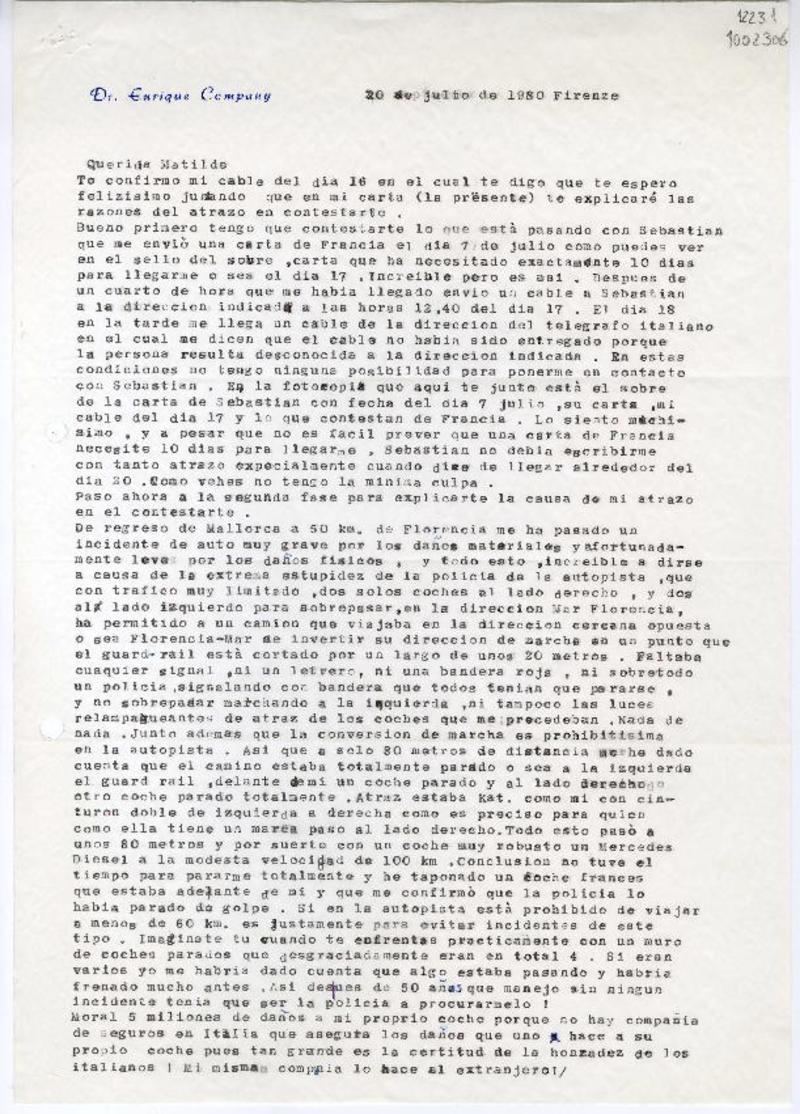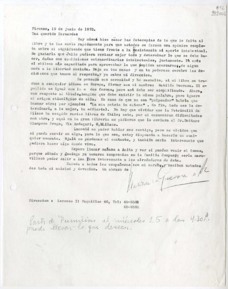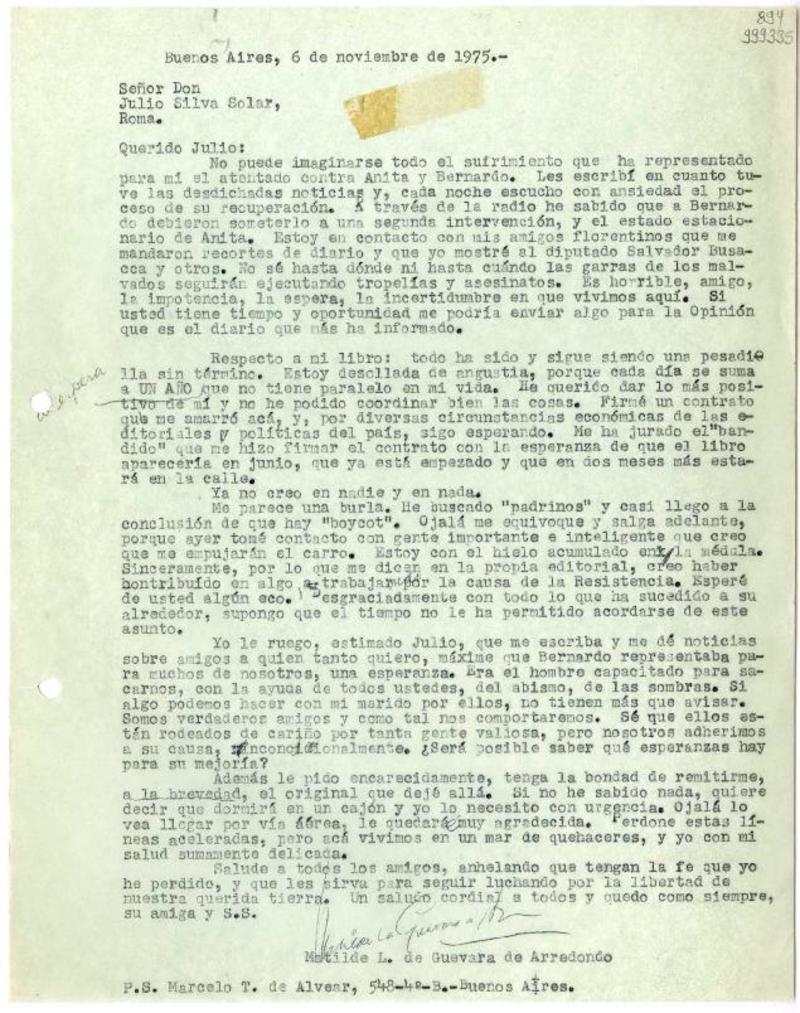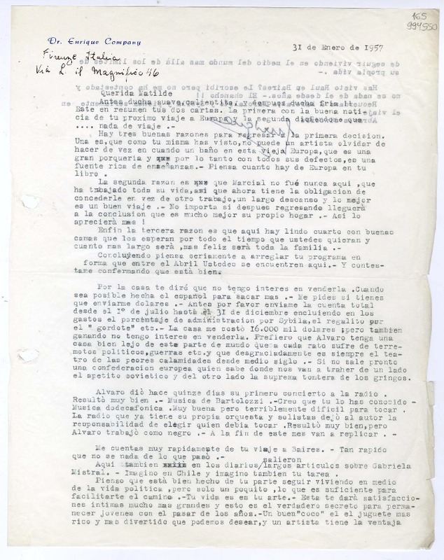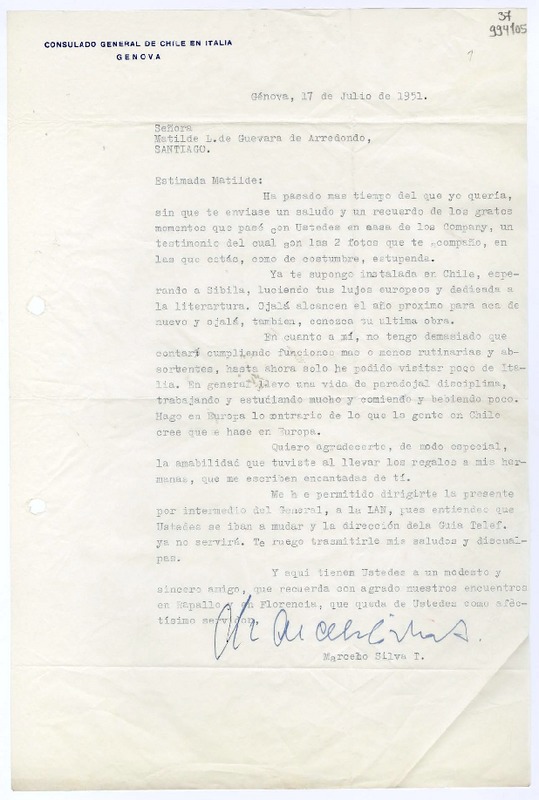 [Carta] 1951 julio 17, Génova, [Italia] [a] Matilde L. de Guevara de Arredondo, Santiago [manuscrito] Marcelo Silva Temme.
