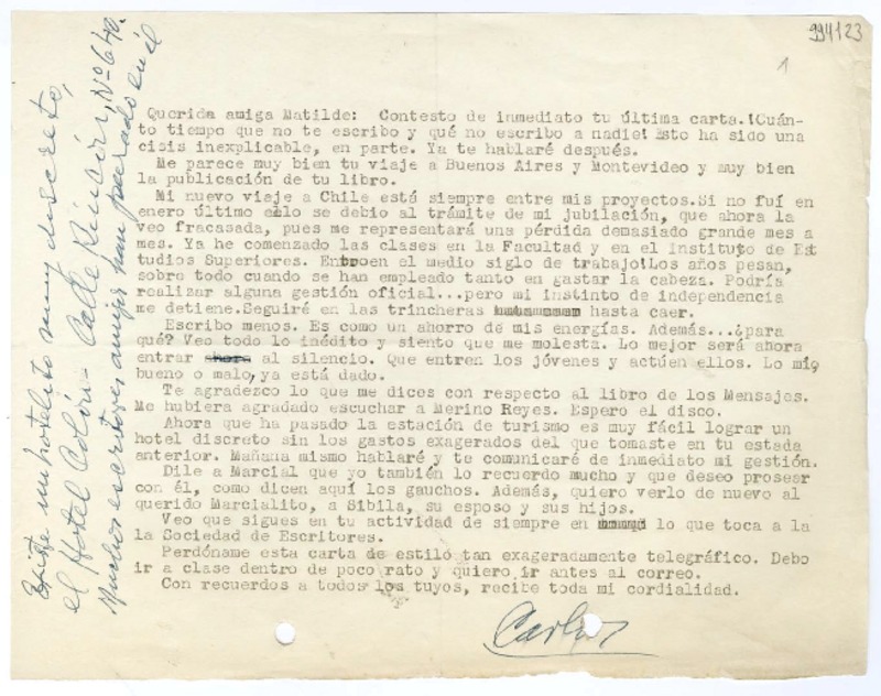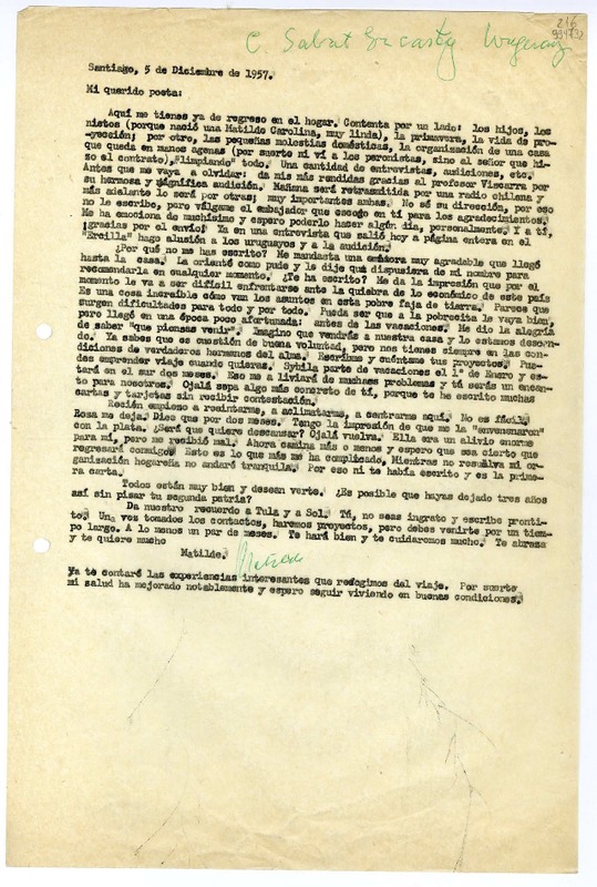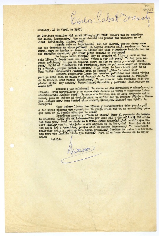 [Carta] 1951, Argentina [a] Querida amiga Matilde [manuscrito] Carlos [Sabat].