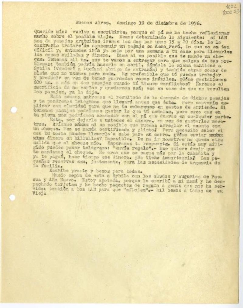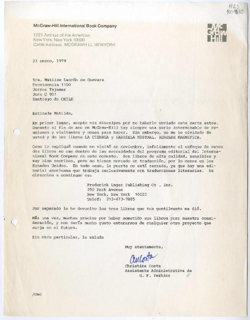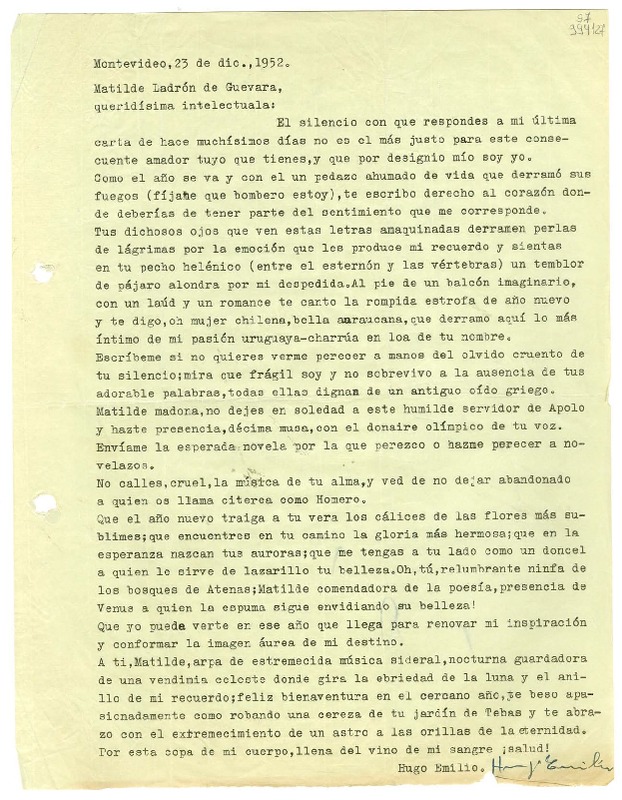 [Carta] 1952 diciembre 23, Montevideo, [Uruguay] [a] Matilde Ladrón de Guevara [manuscrito] Hugo Emilio Pedemonte.