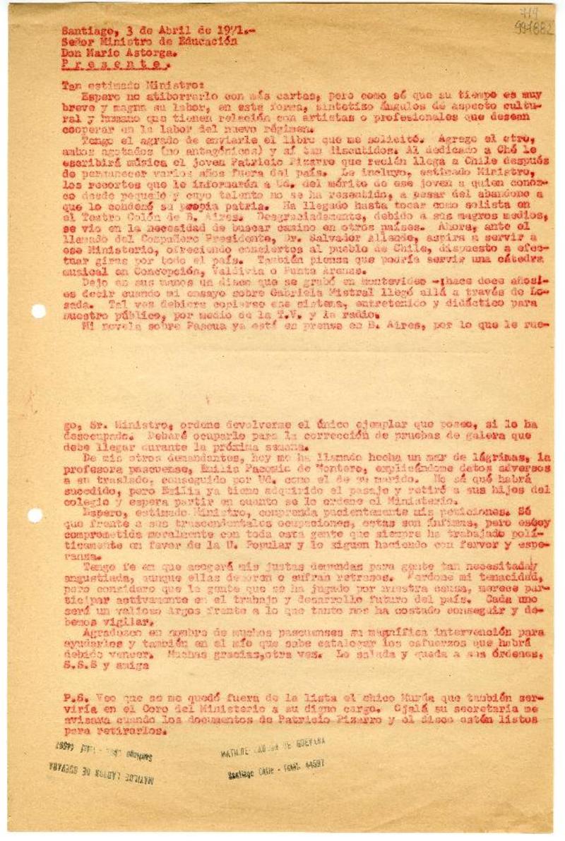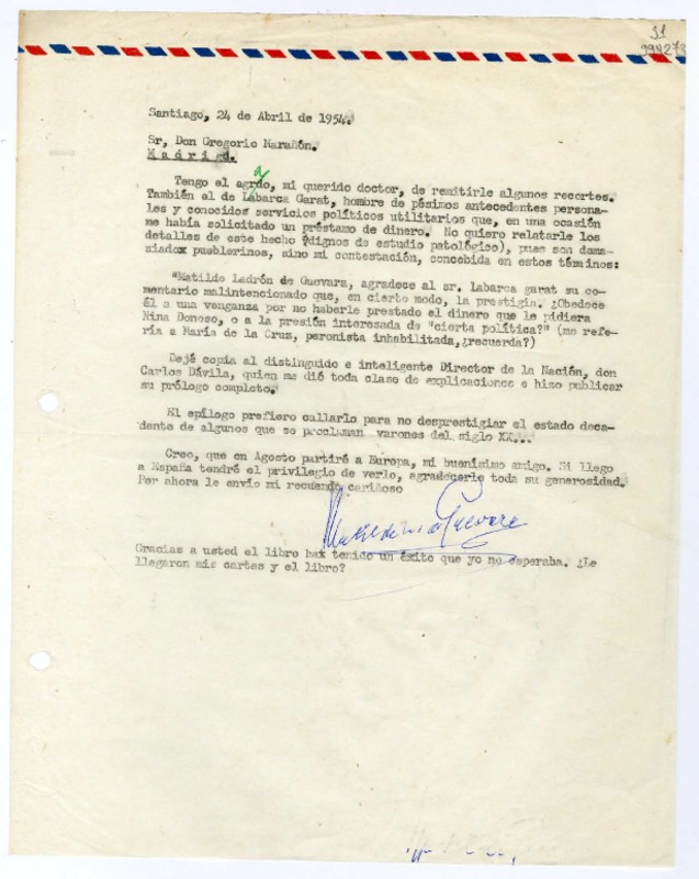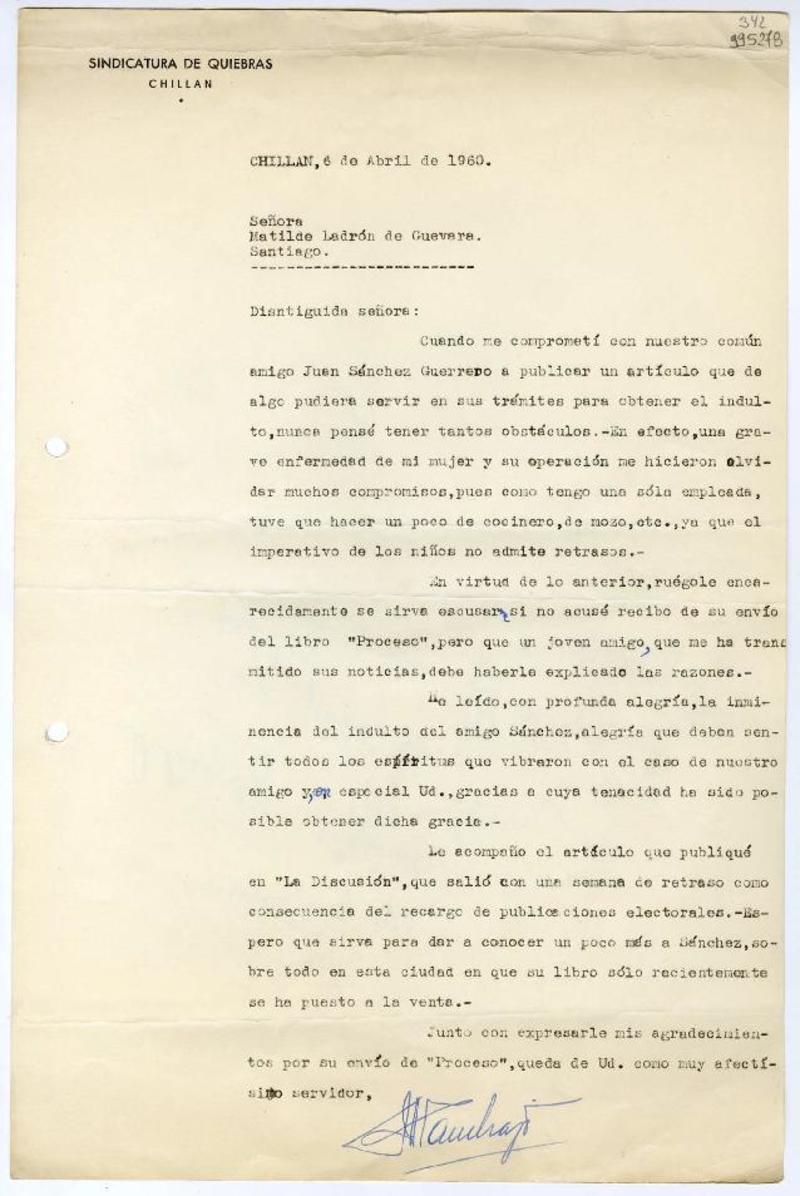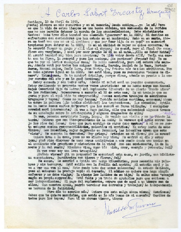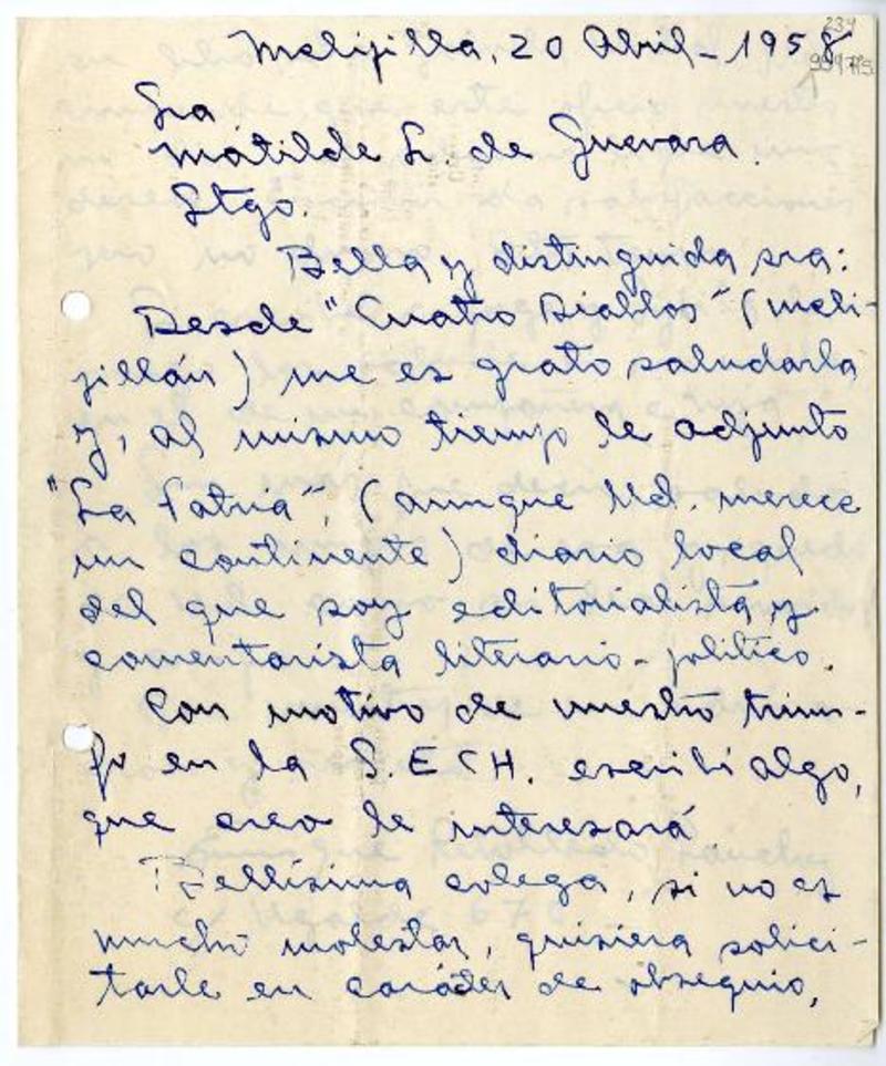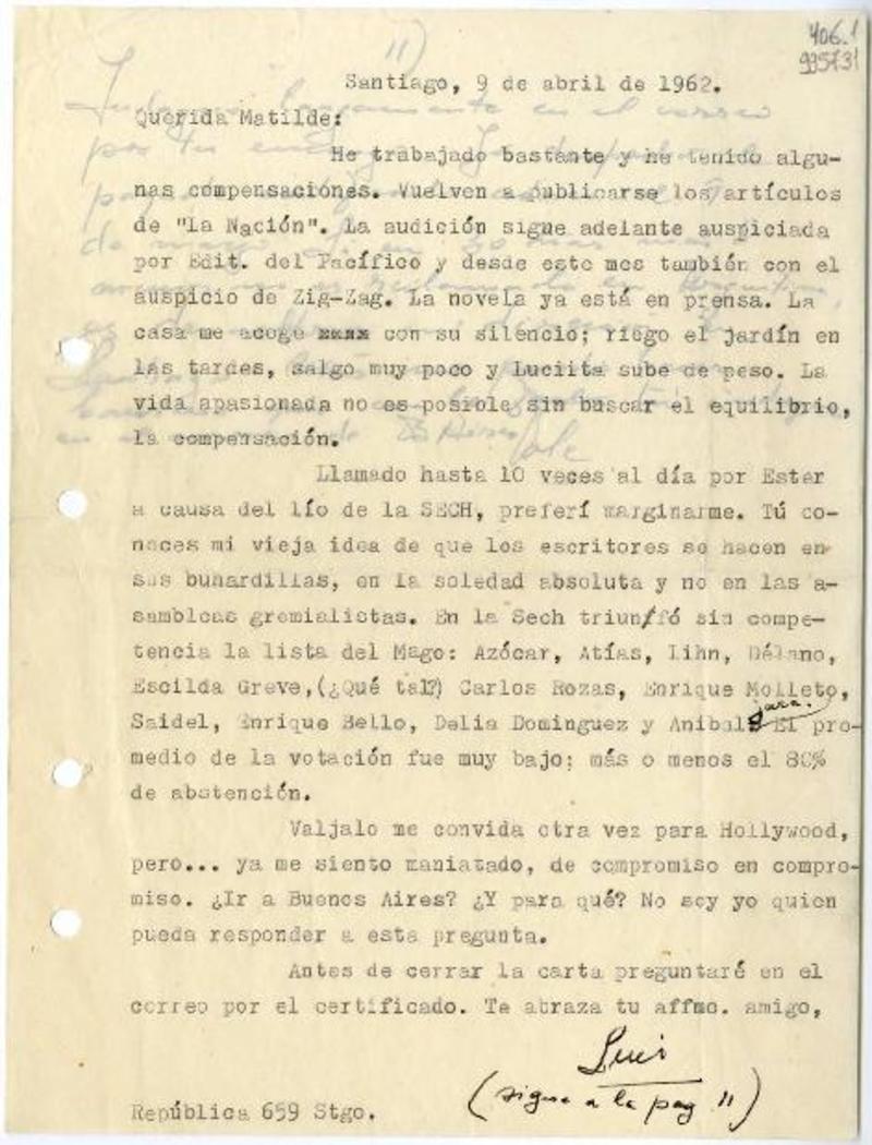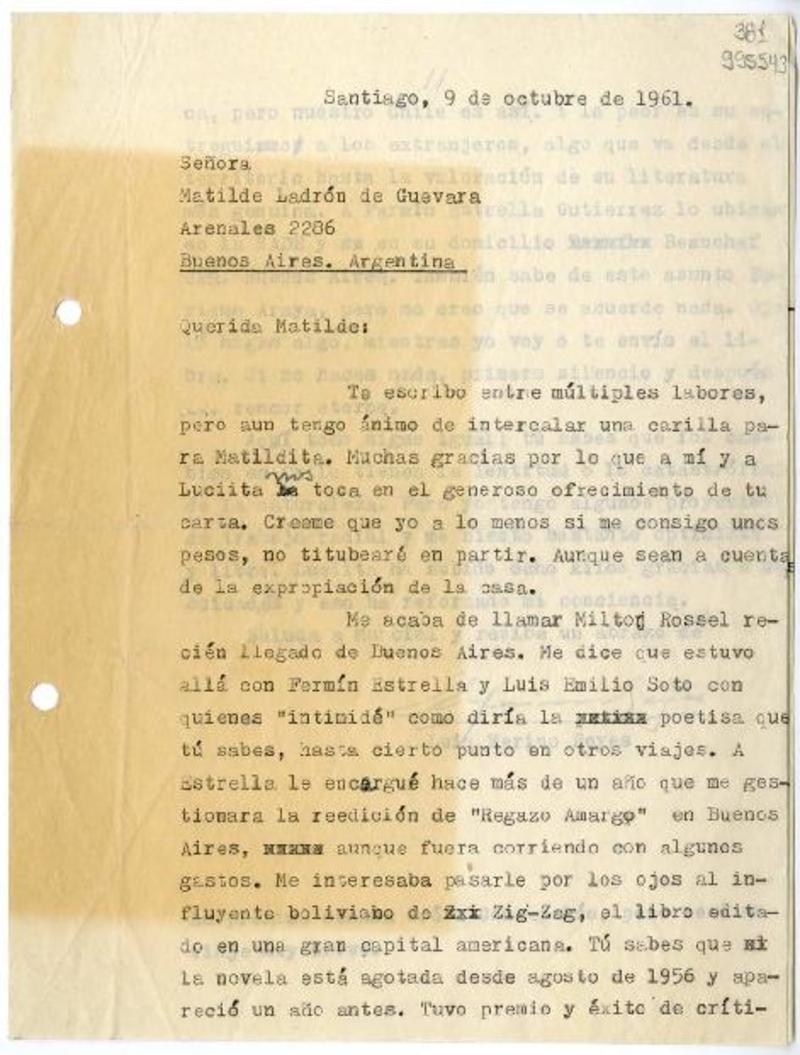 [Carta] 1953 abril 8, Santiago, [Chile] [a] Matilde Ladrón de Guevara [manuscrito] Raúl Hidalgo.