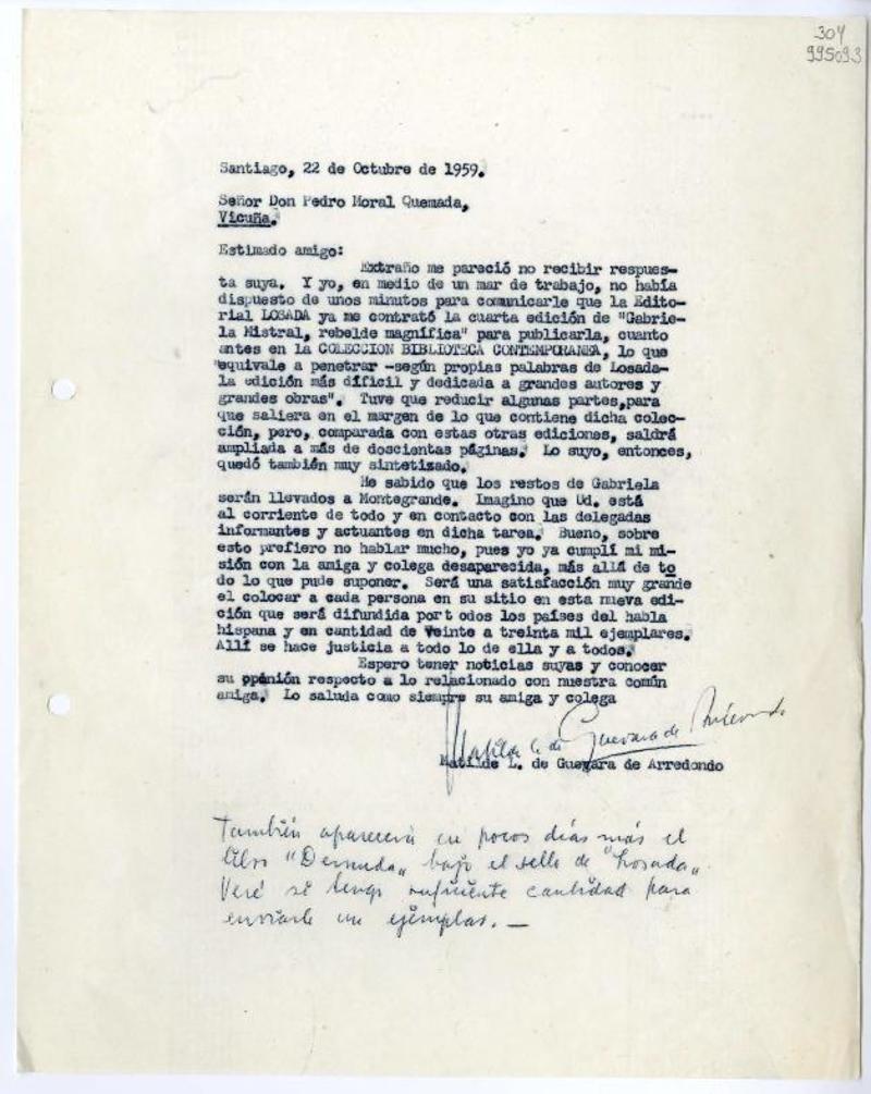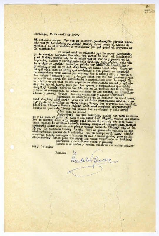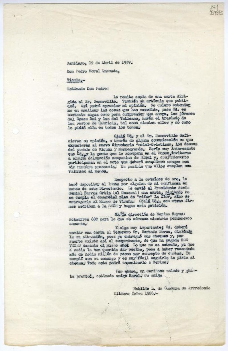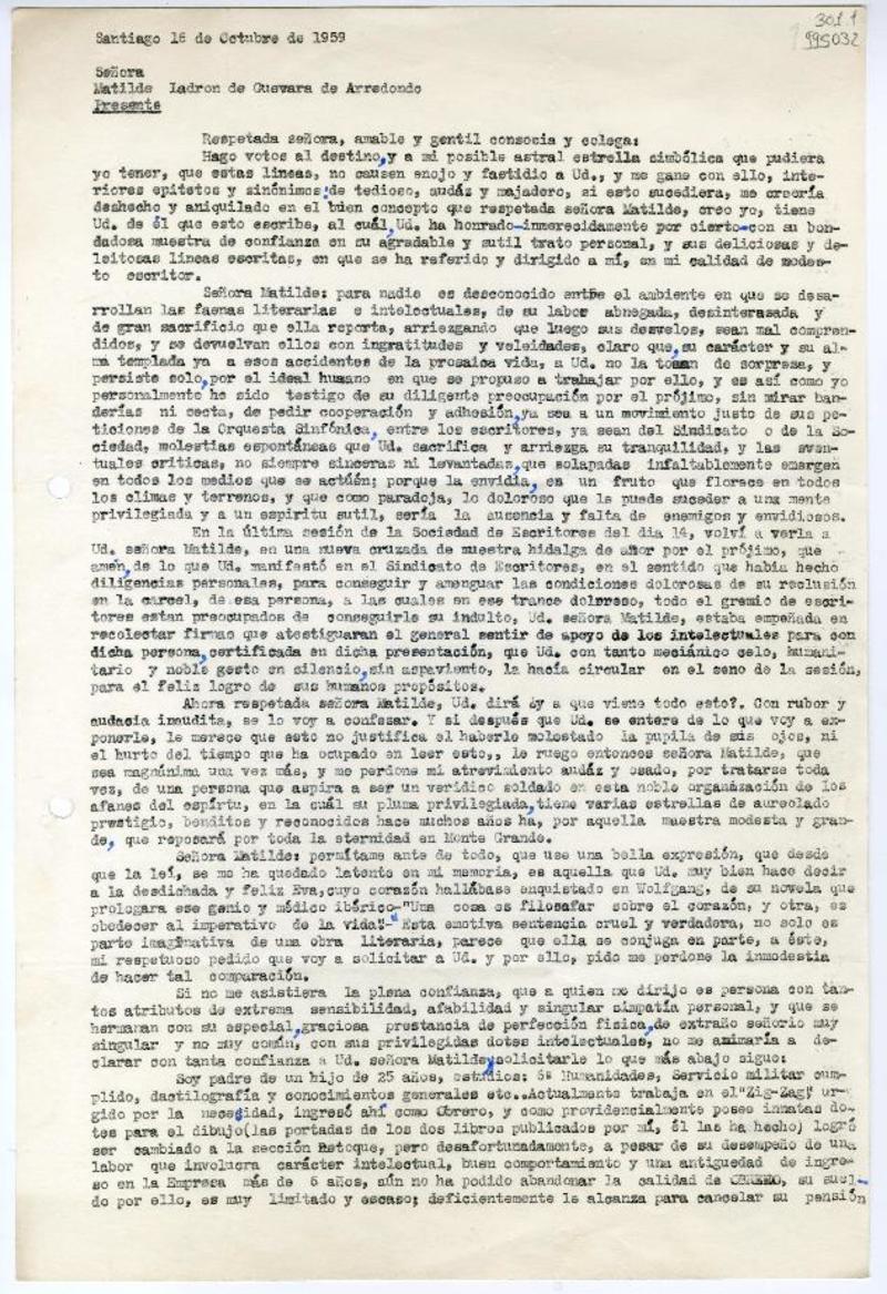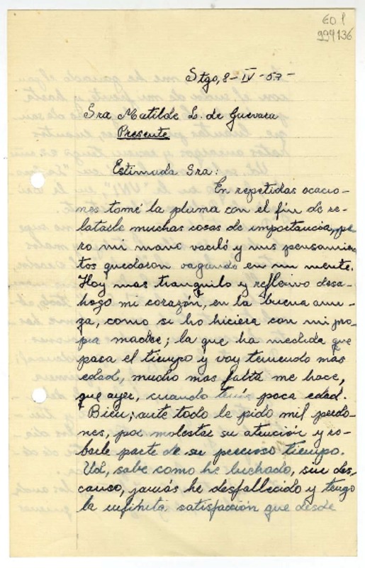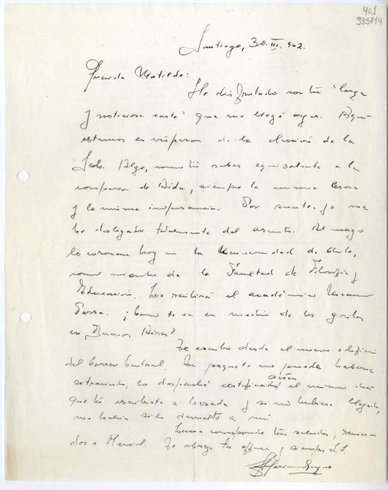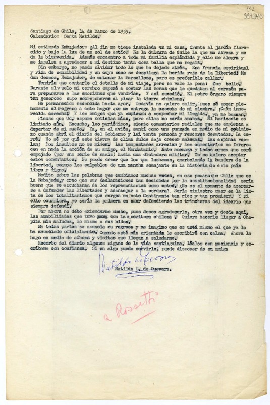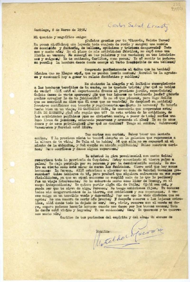 [Carta] 1953 abril 8, Santiago, [Chile] [a] Matilde Ladrón de Guevara [manuscrito] Raúl Hidalgo.