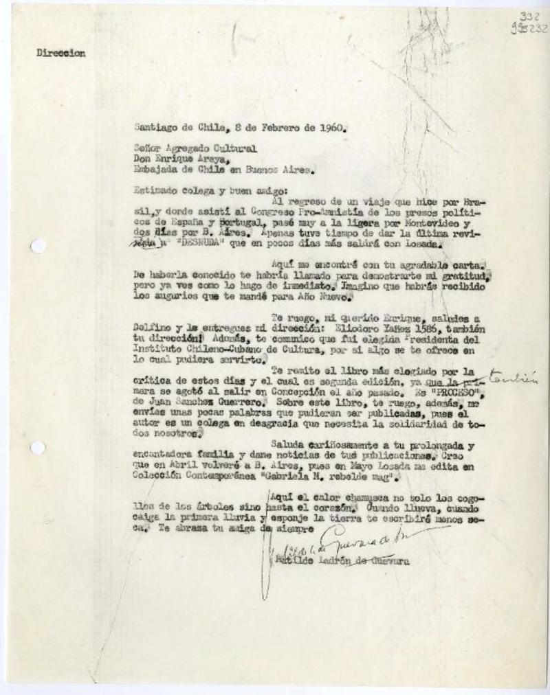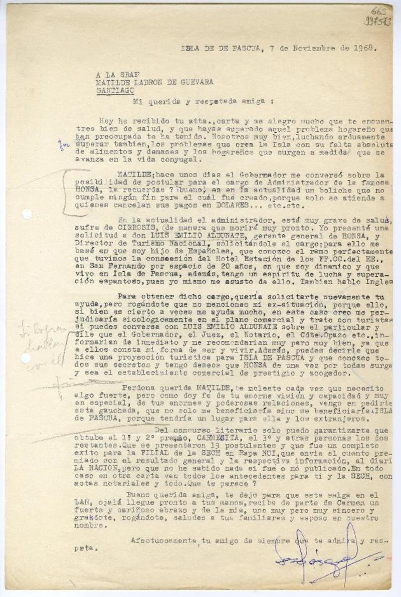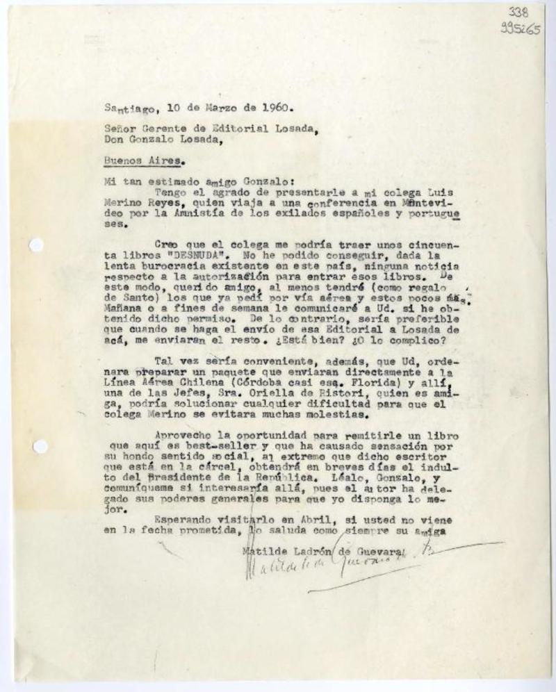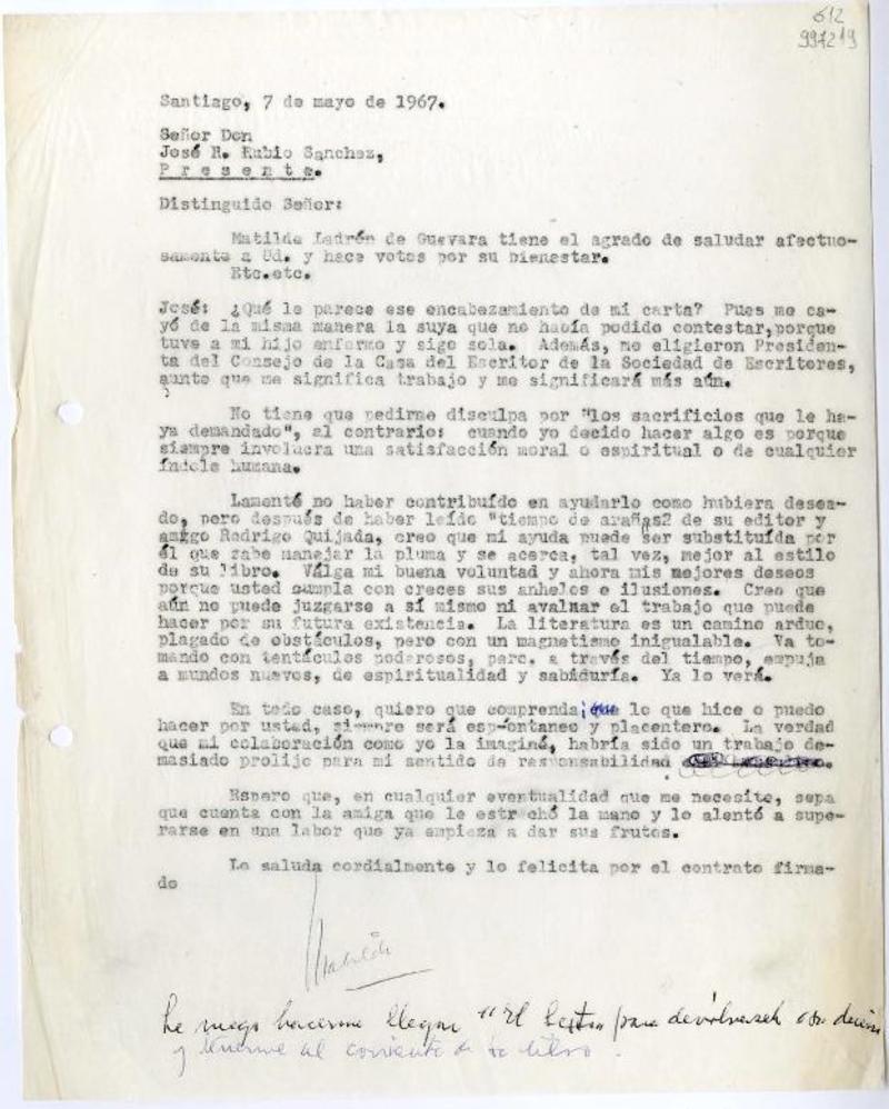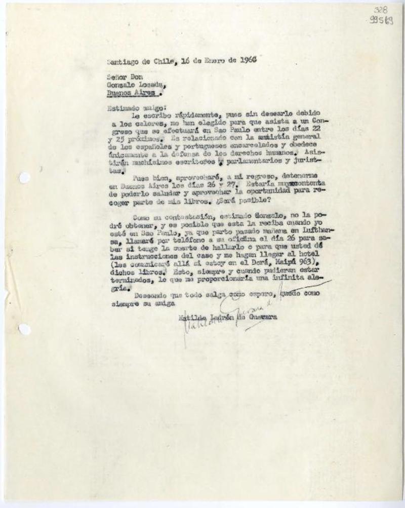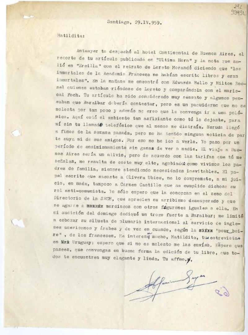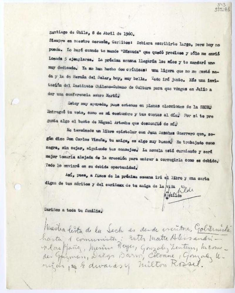 [Carta] 1953 abril 8, Santiago, [Chile] [a] Matilde Ladrón de Guevara [manuscrito] Raúl Hidalgo.
