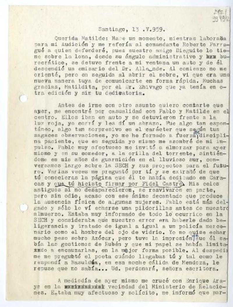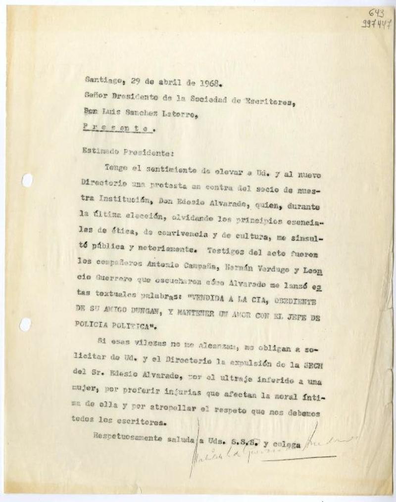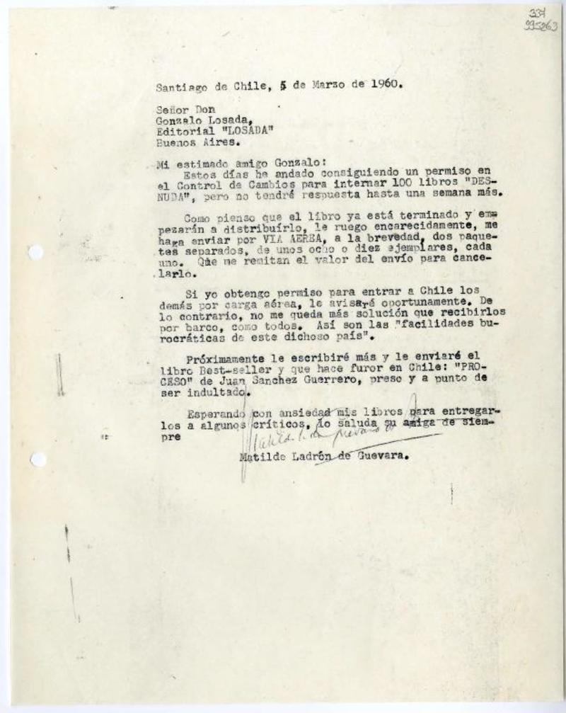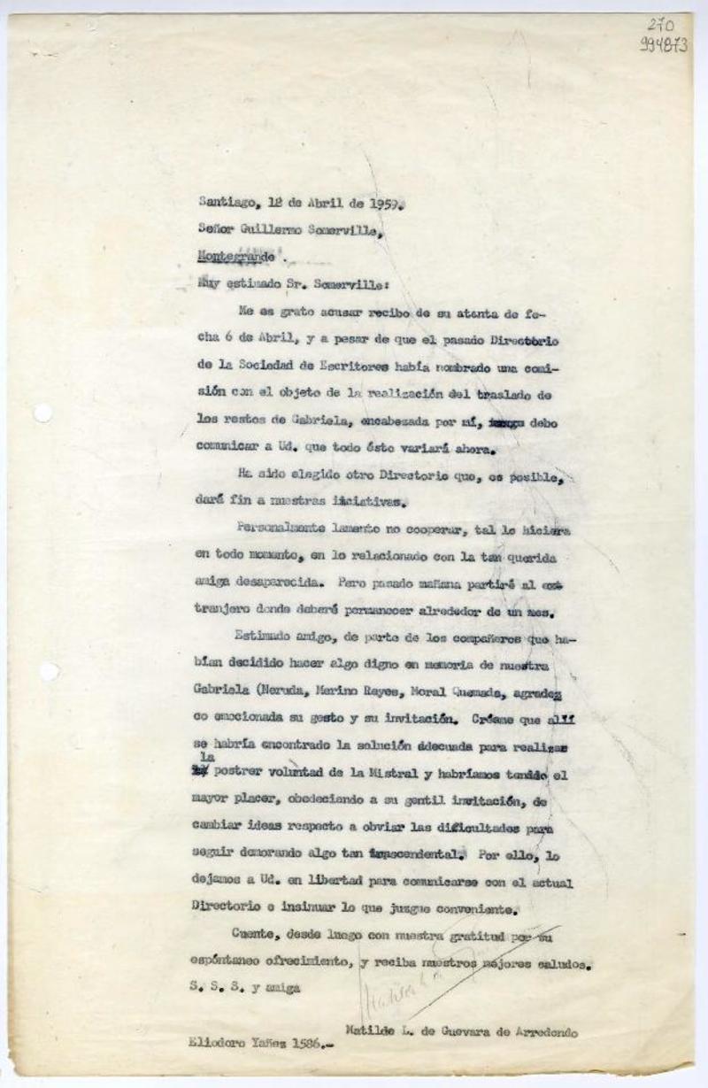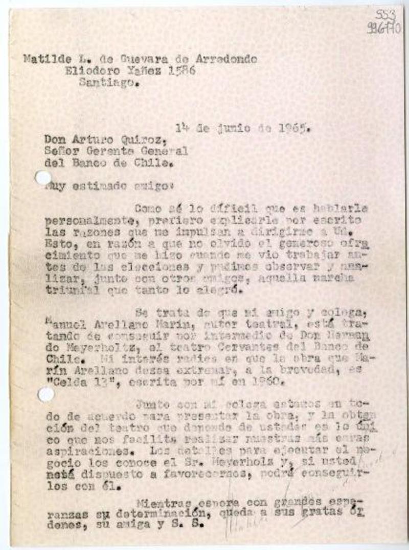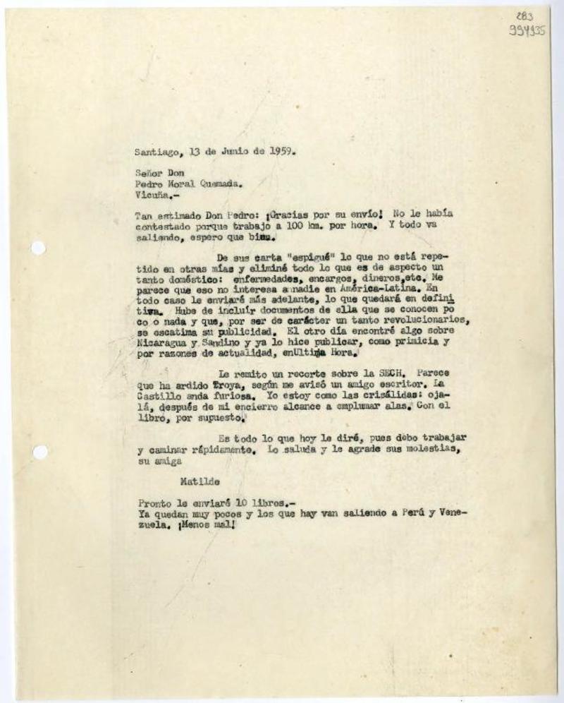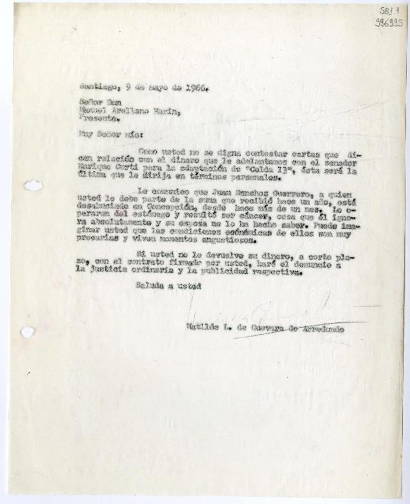 [Carta] 1953 abril 8, Santiago, [Chile] [a] Matilde Ladrón de Guevara [manuscrito] Raúl Hidalgo.