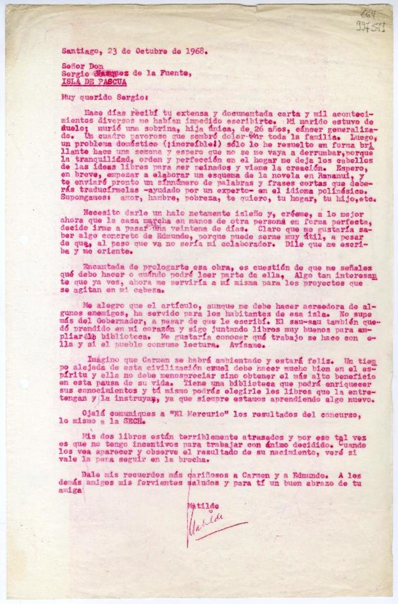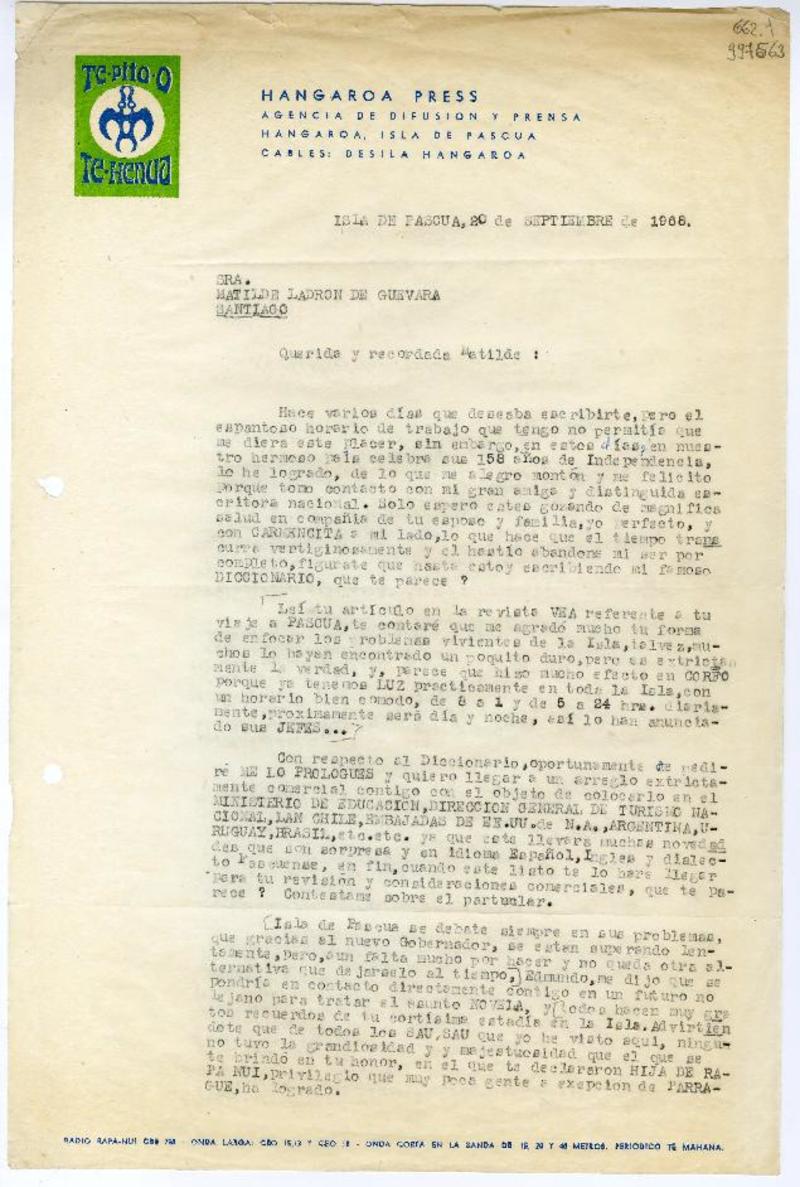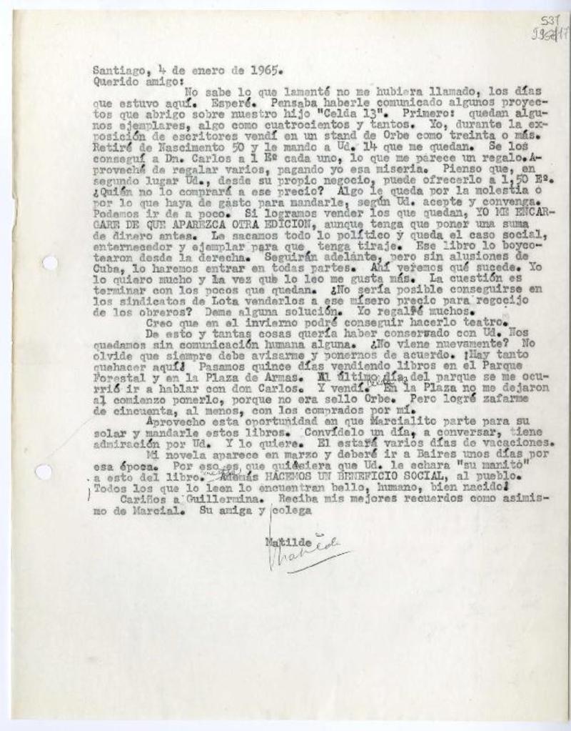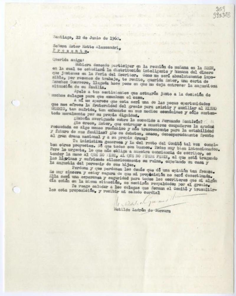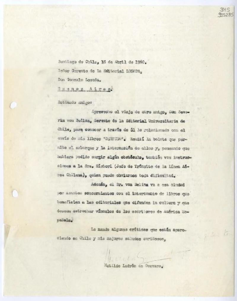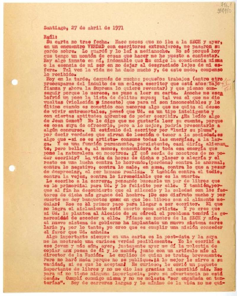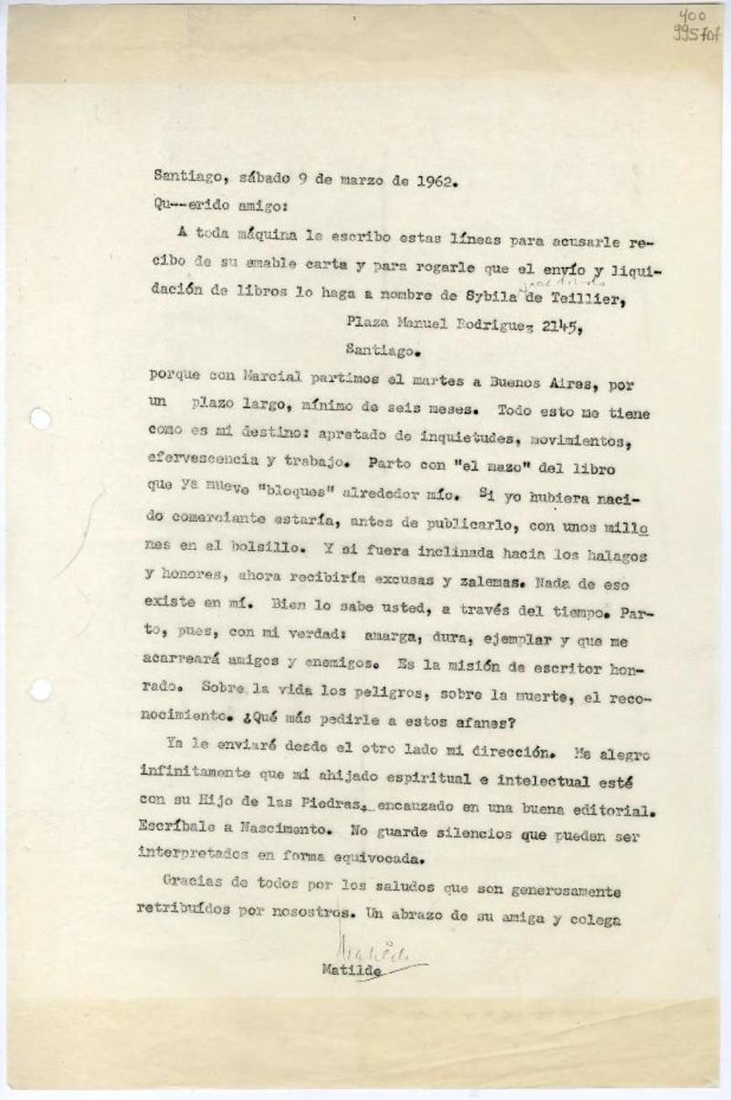 [Carta] 1953 abril 8, Santiago, [Chile] [a] Matilde Ladrón de Guevara [manuscrito] Raúl Hidalgo.
