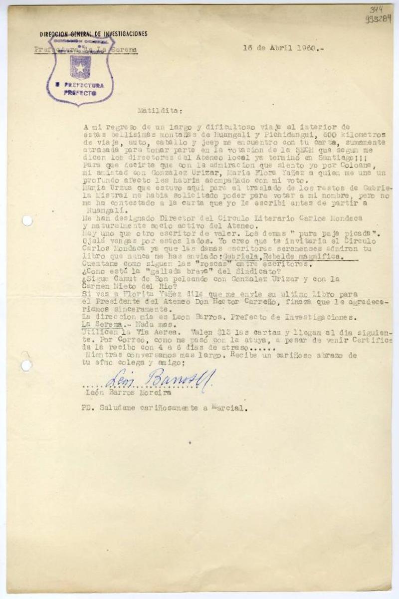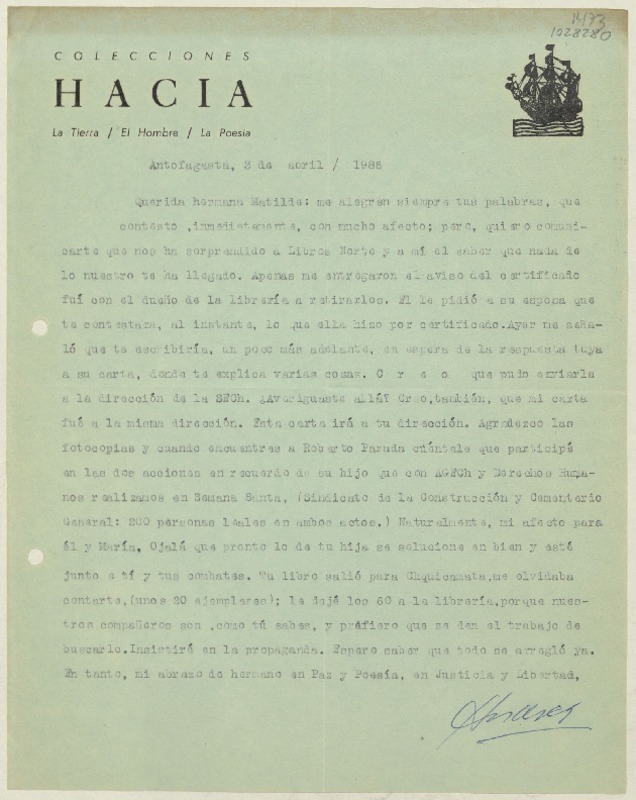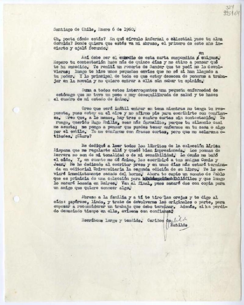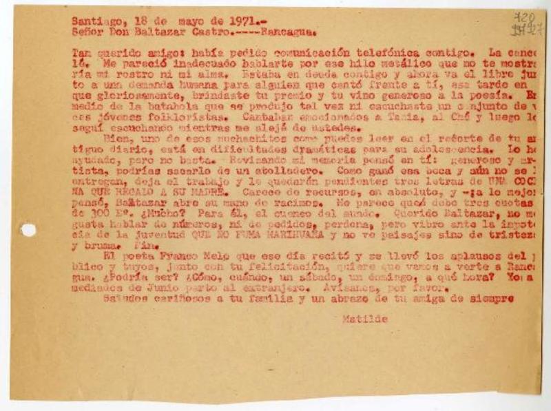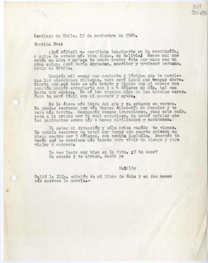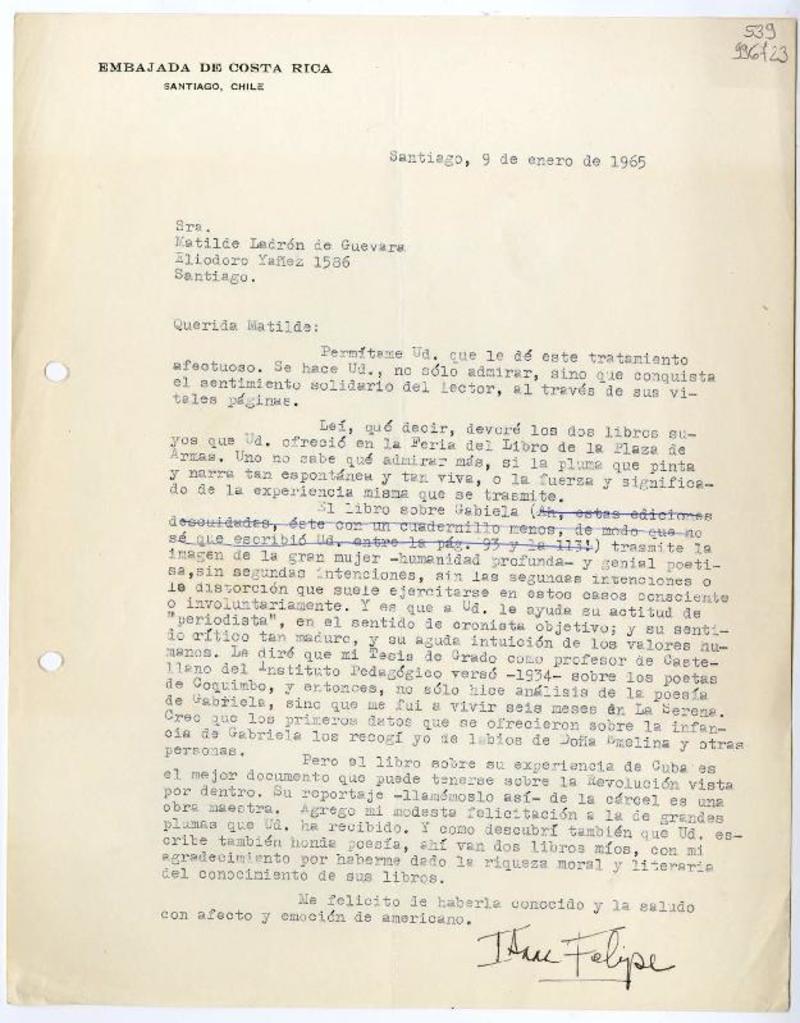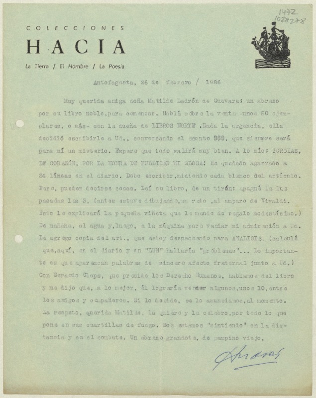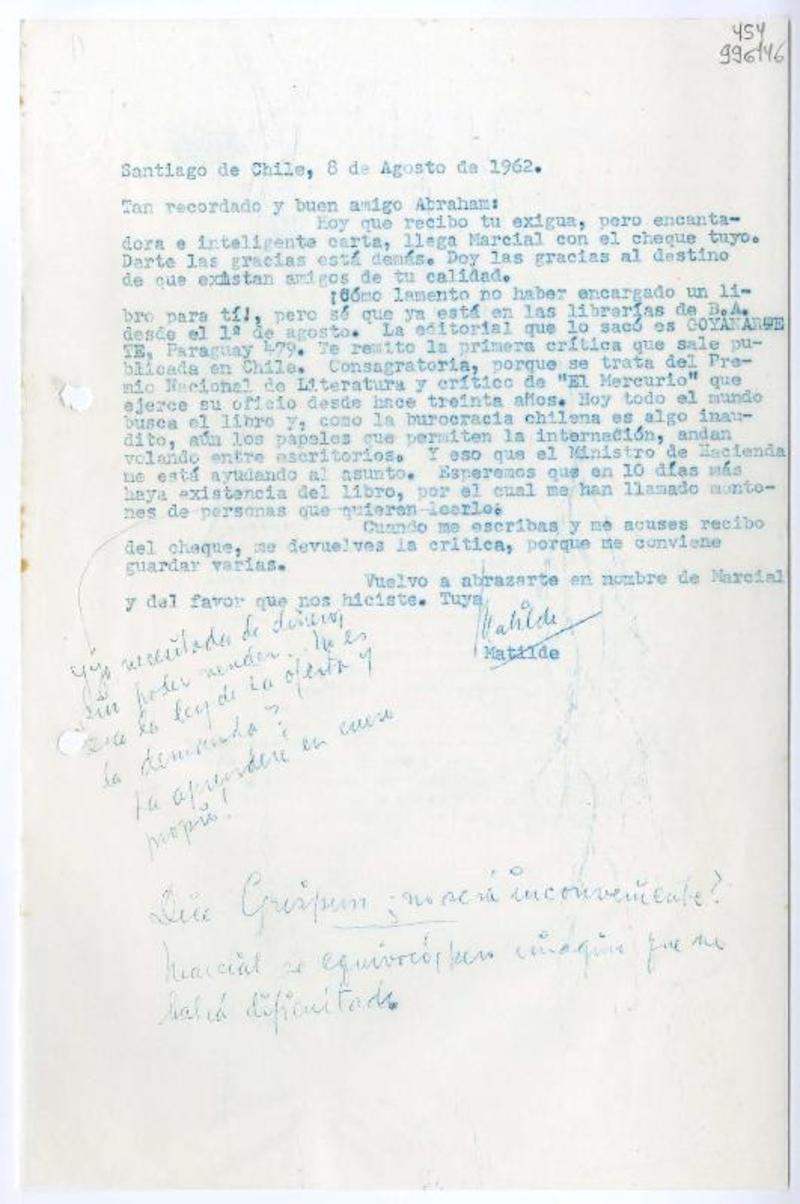 [Carta] 1953 abril 8, Santiago, [Chile] [a] Matilde Ladrón de Guevara [manuscrito] Raúl Hidalgo.