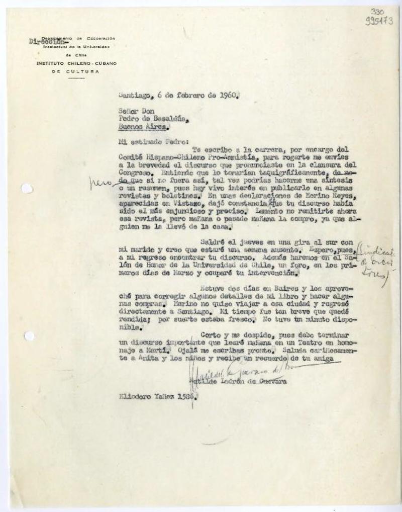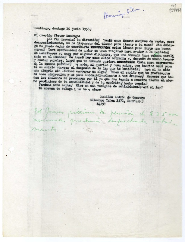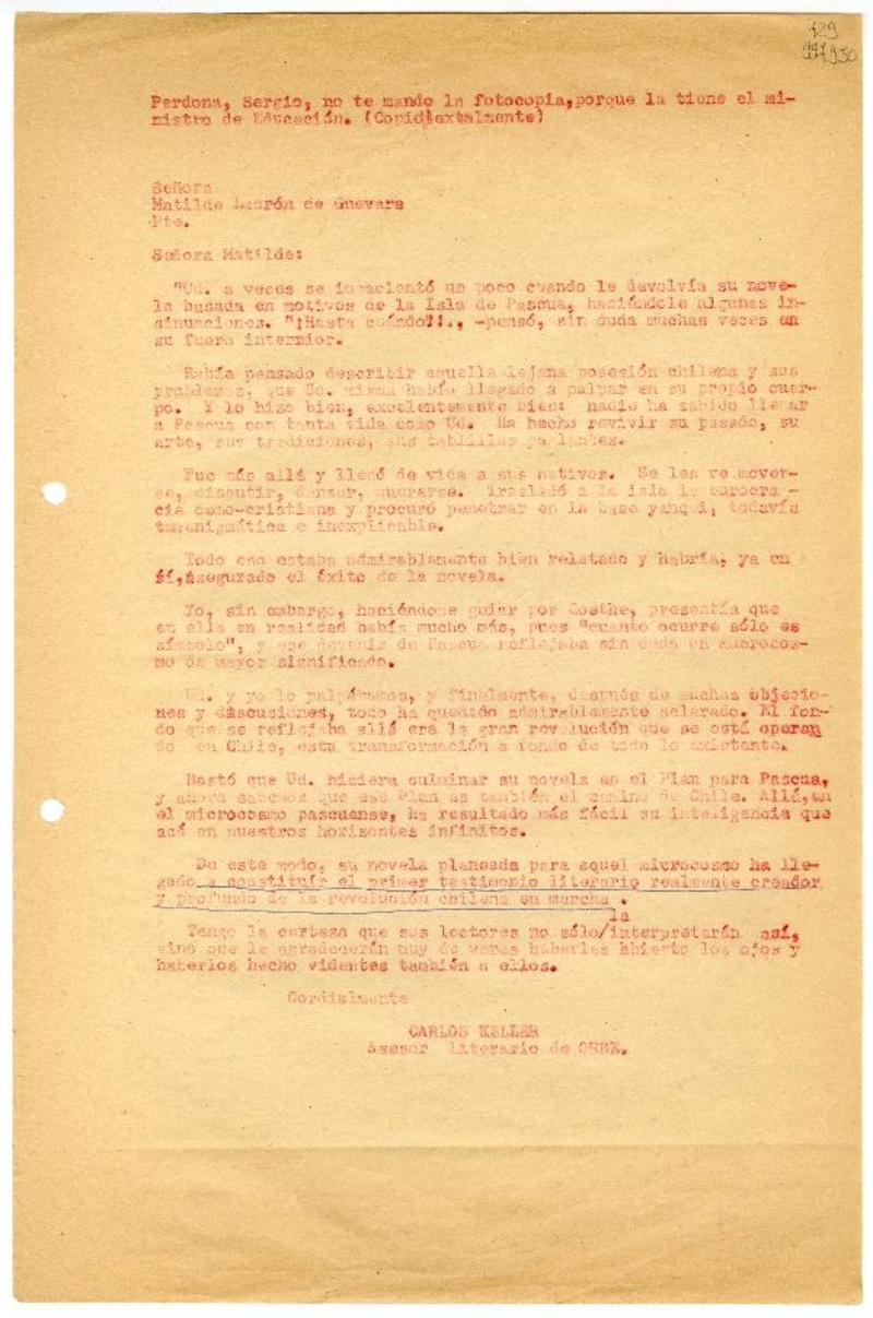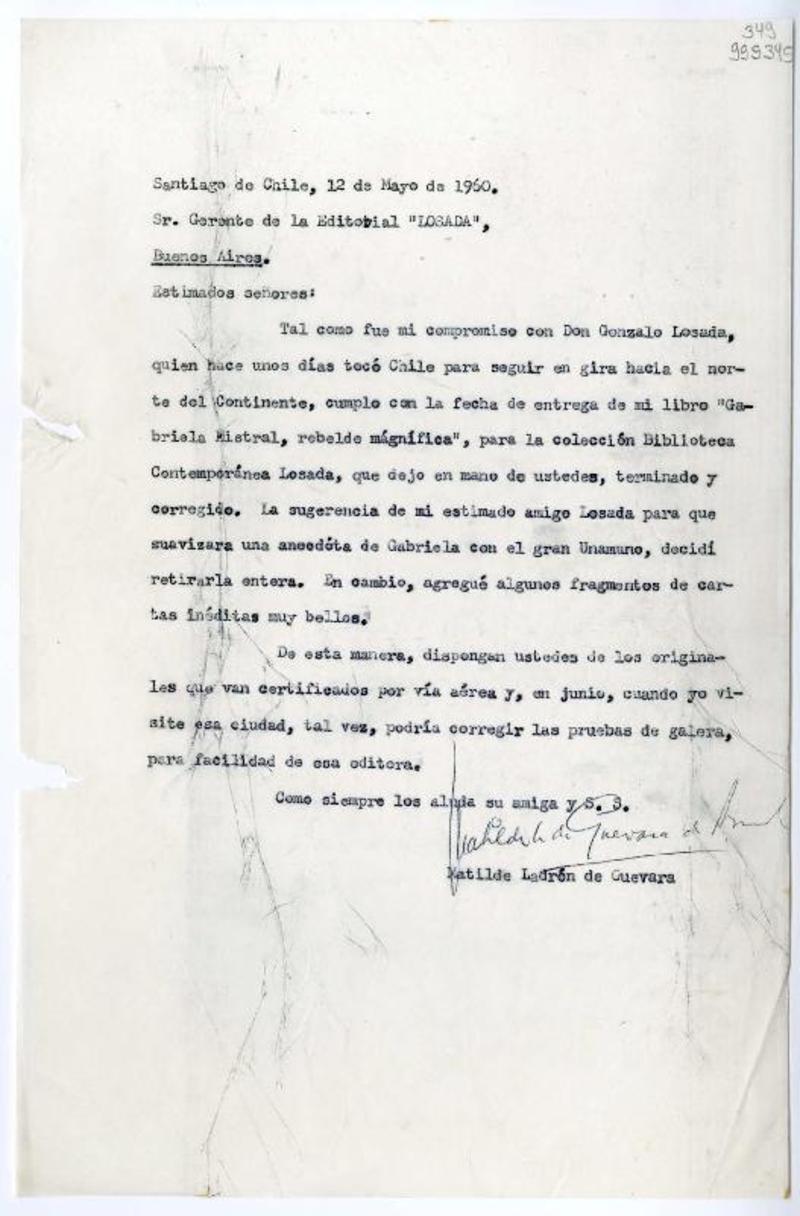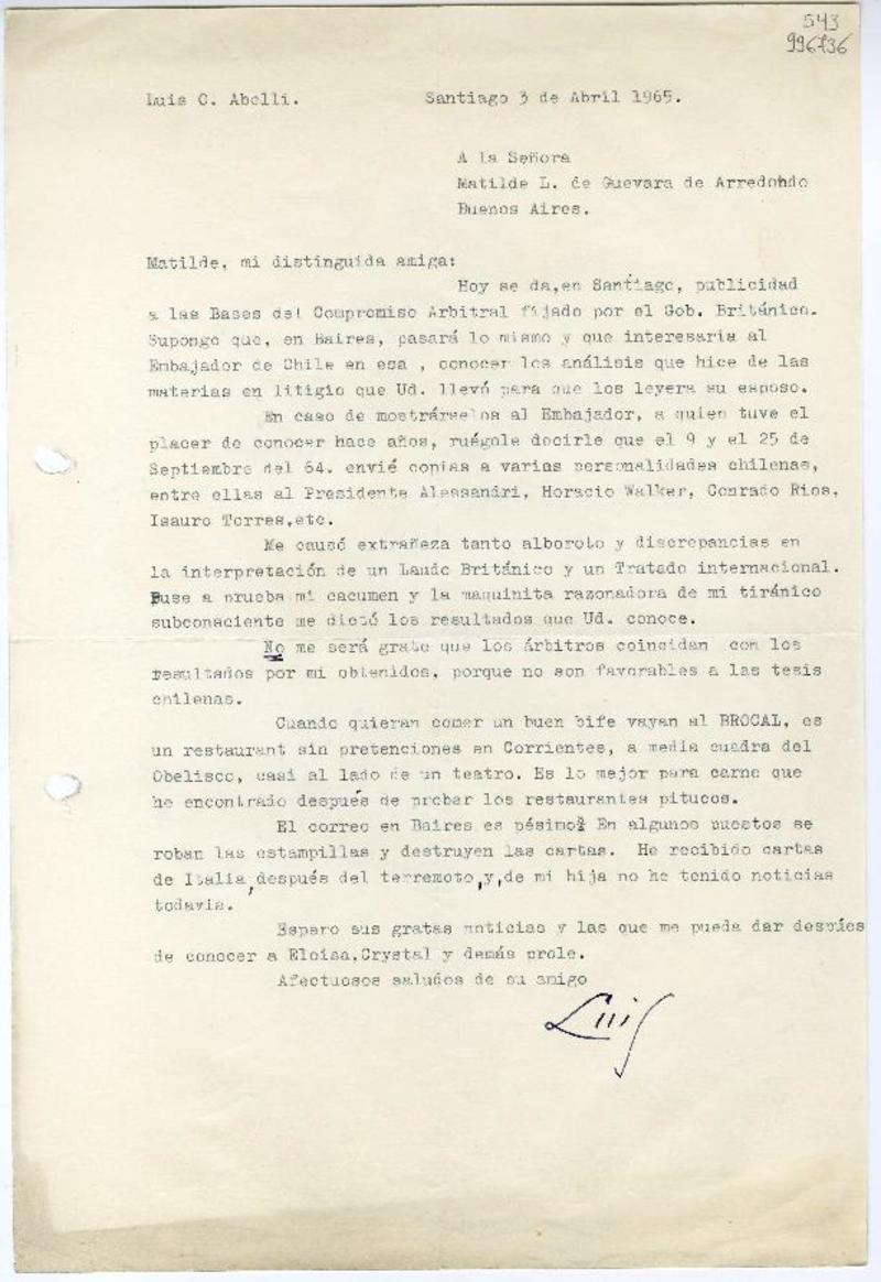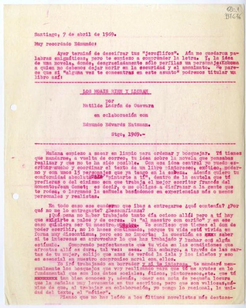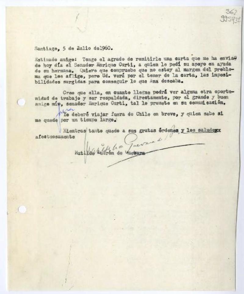 [Carta] 1953 abril 8, Santiago, [Chile] [a] Matilde Ladrón de Guevara [manuscrito] Raúl Hidalgo.