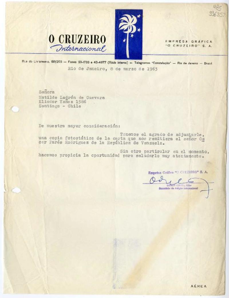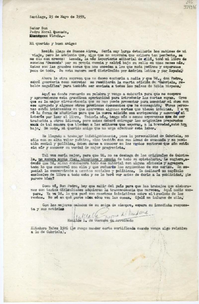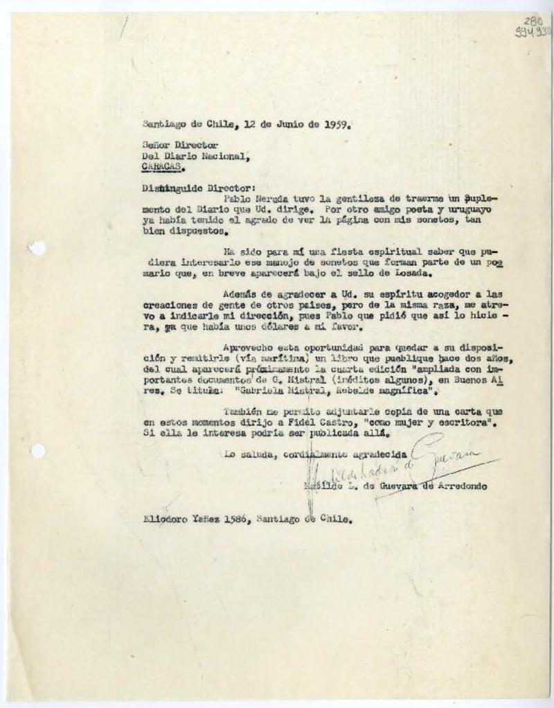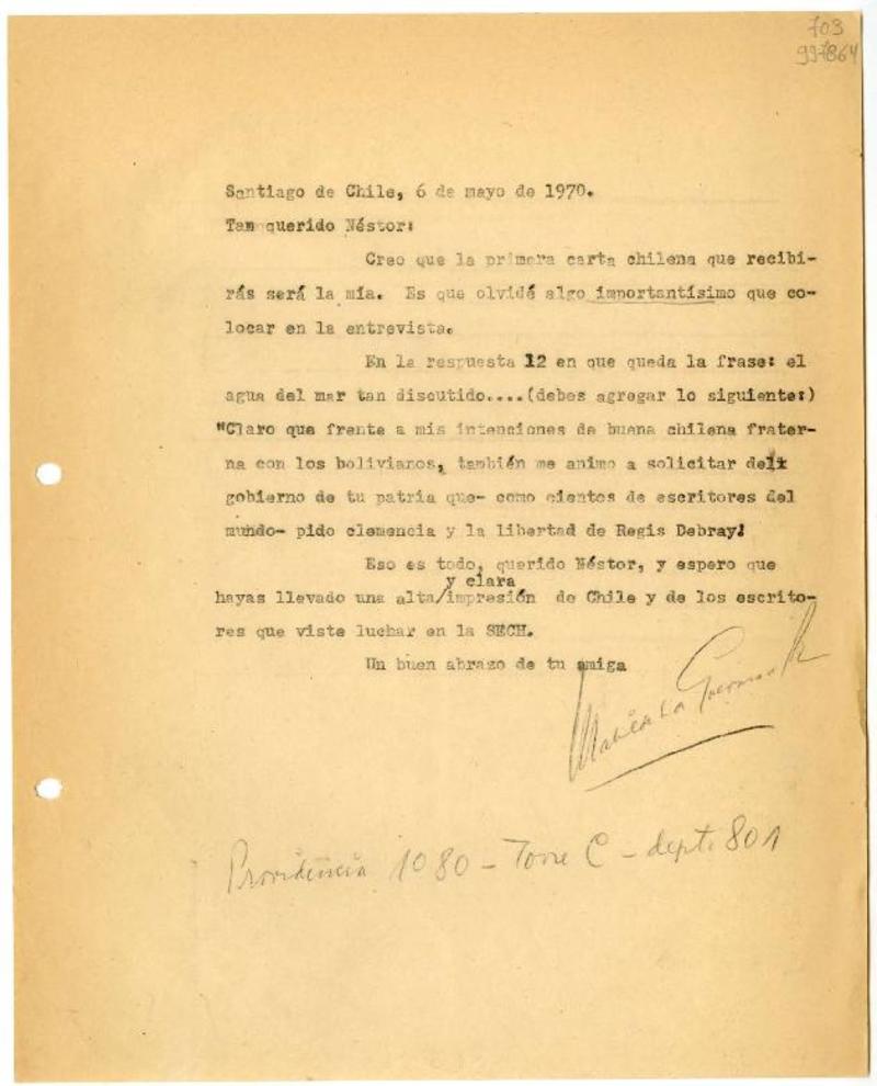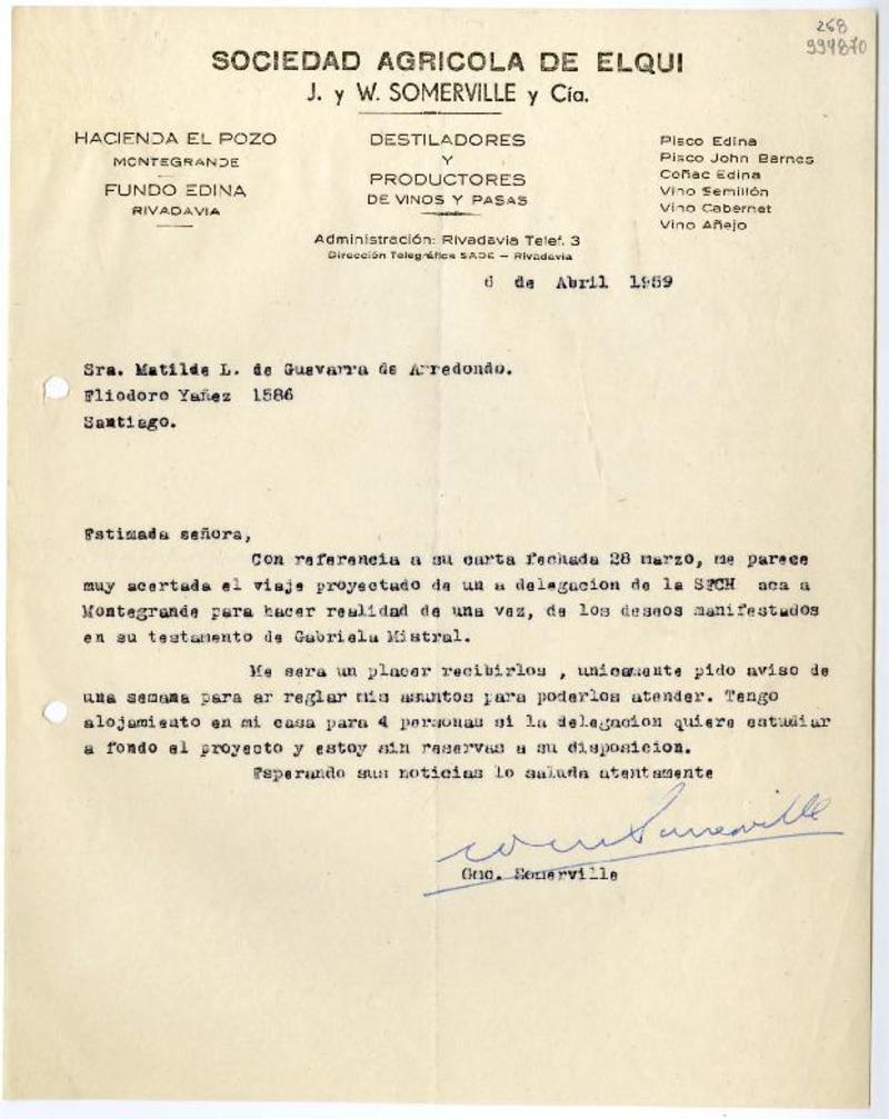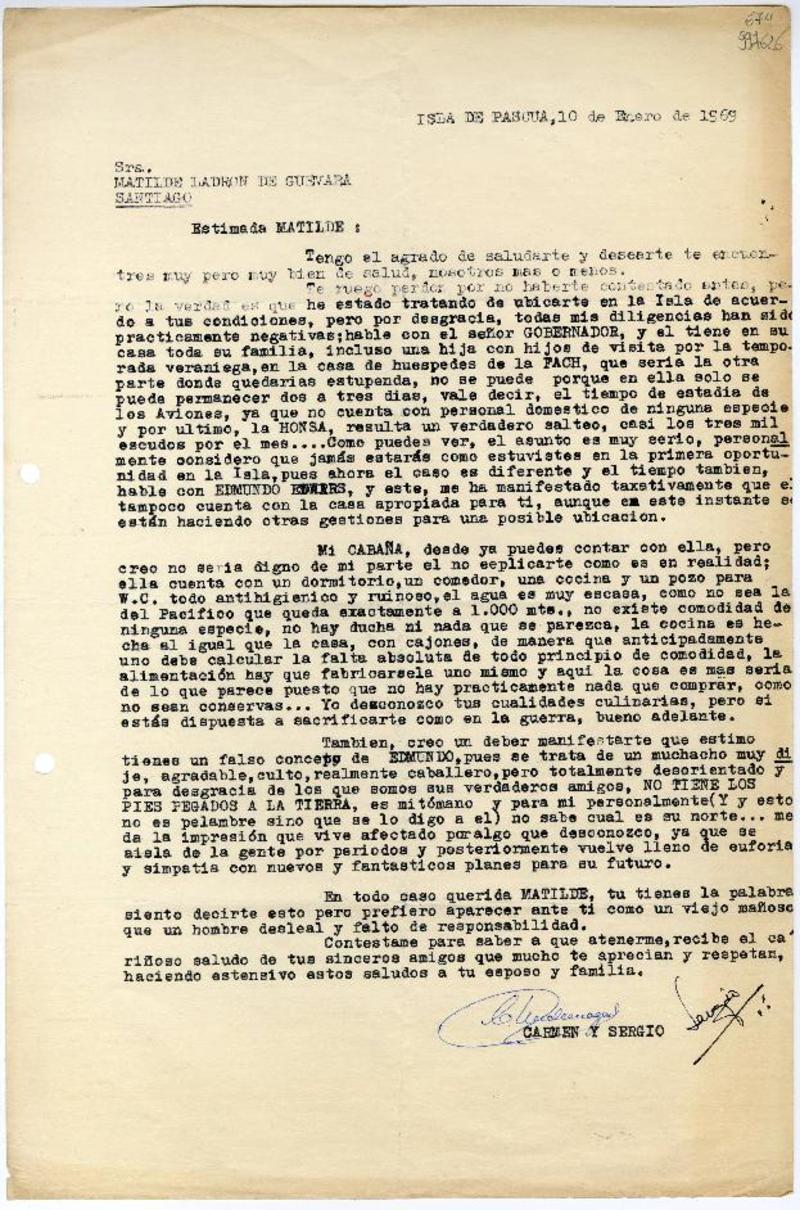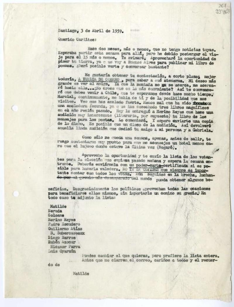 [Carta] 1953 abril 8, Santiago, [Chile] [a] Matilde Ladrón de Guevara [manuscrito] Raúl Hidalgo.