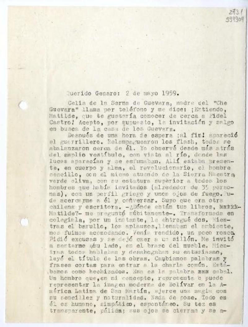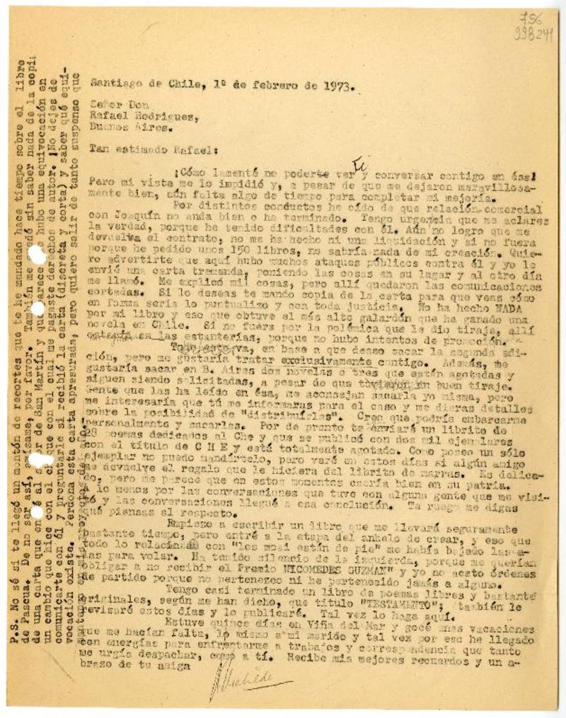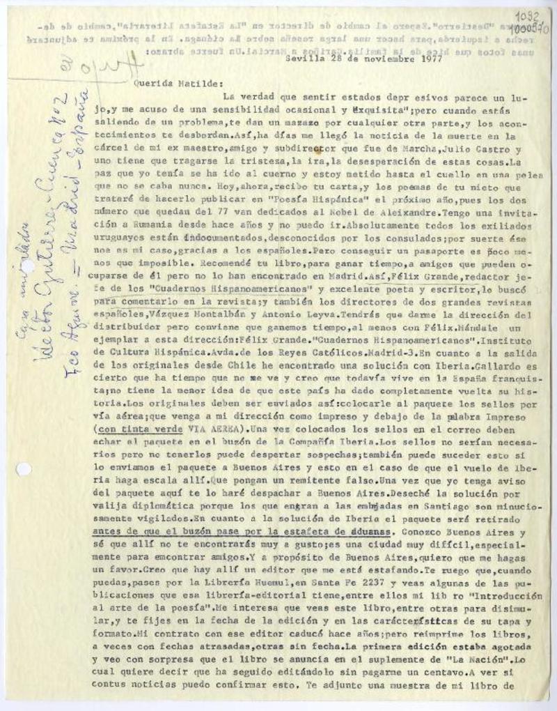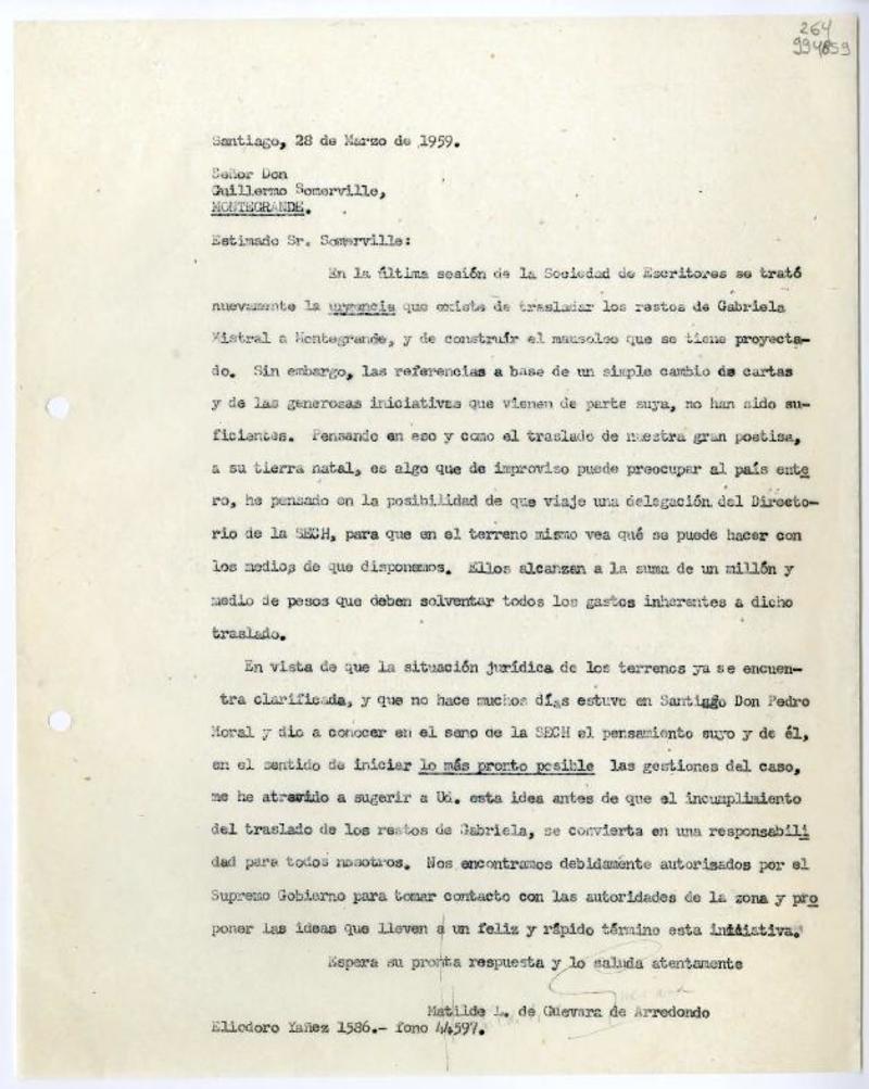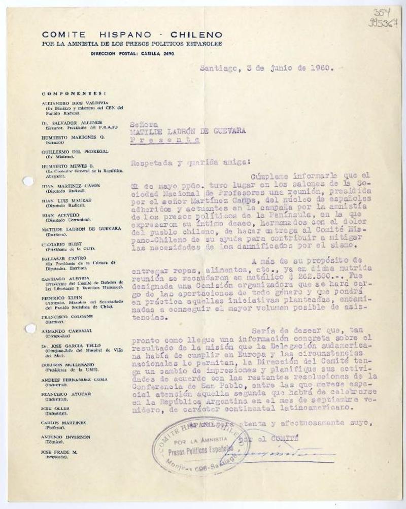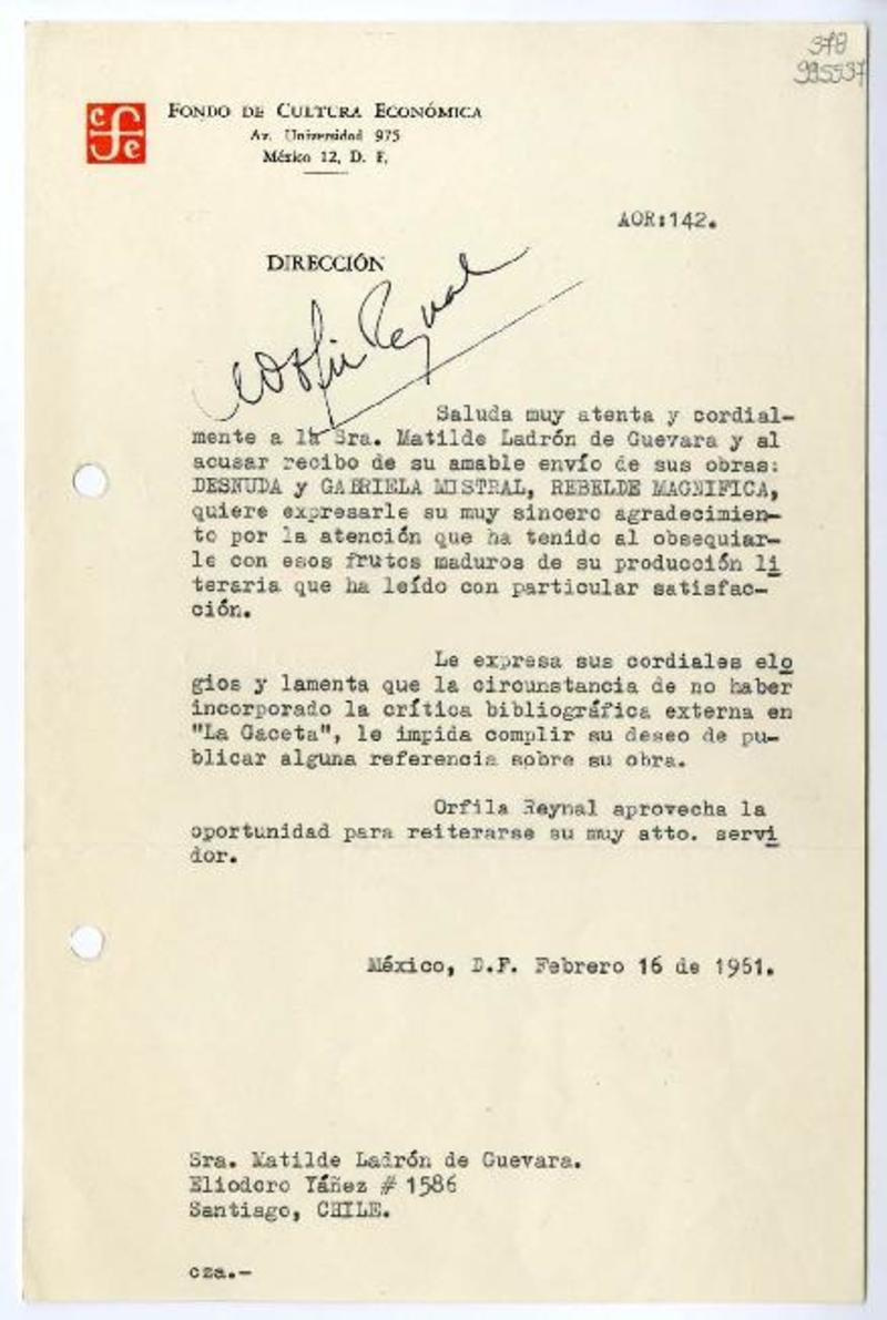 [Carta] 1953 abril 8, Santiago, [Chile] [a] Matilde Ladrón de Guevara [manuscrito] Raúl Hidalgo.