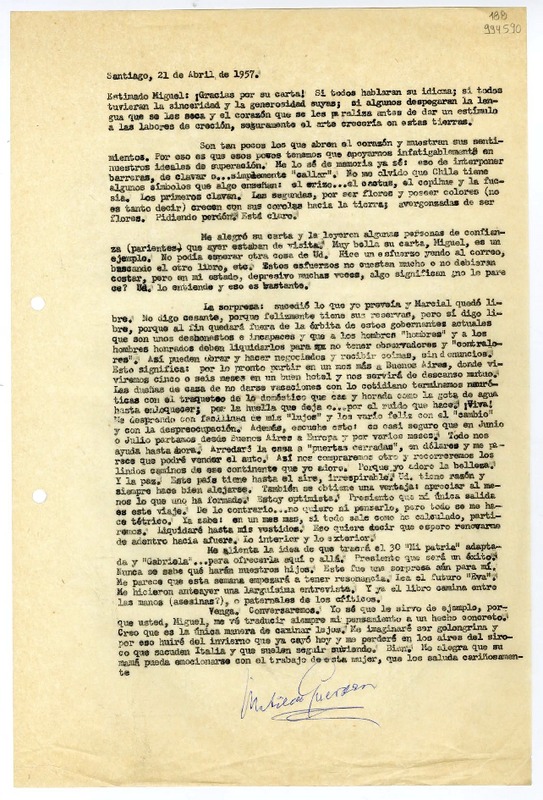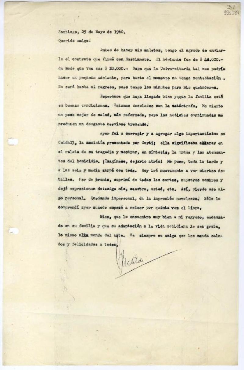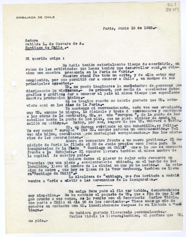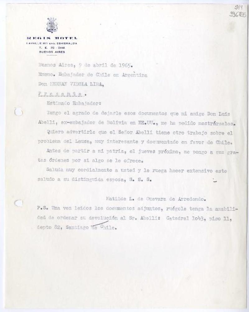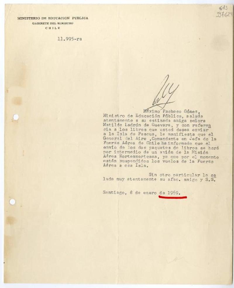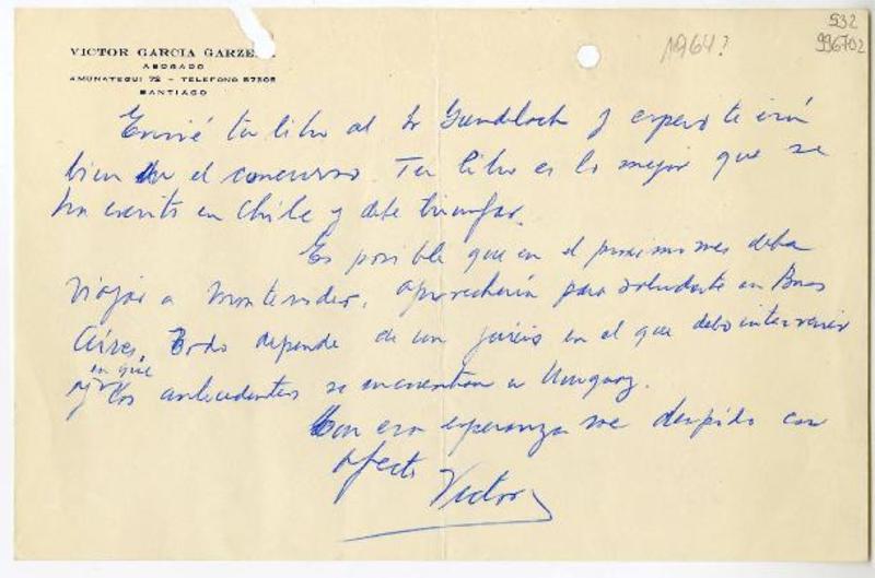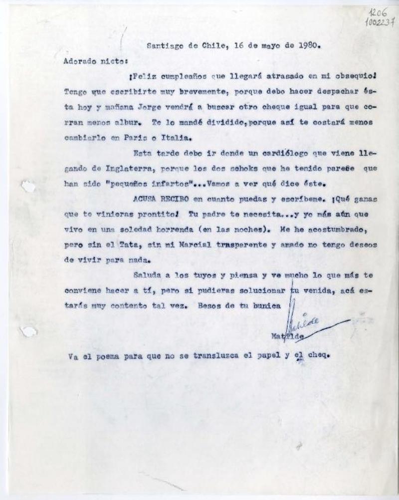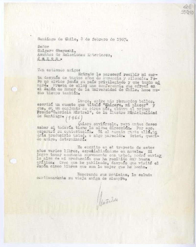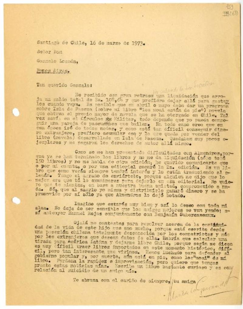 [Carta] 1953 abril 8, Santiago, [Chile] [a] Matilde Ladrón de Guevara [manuscrito] Raúl Hidalgo.