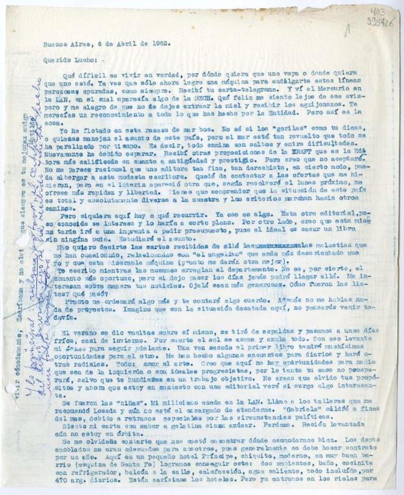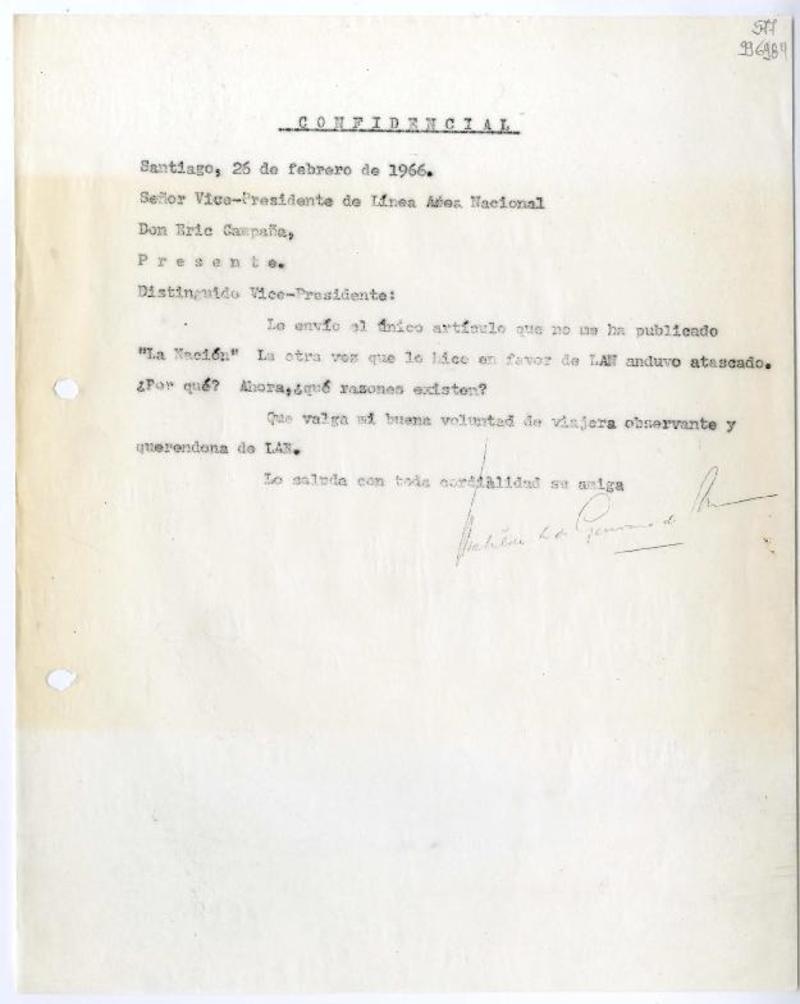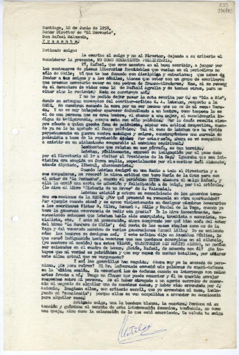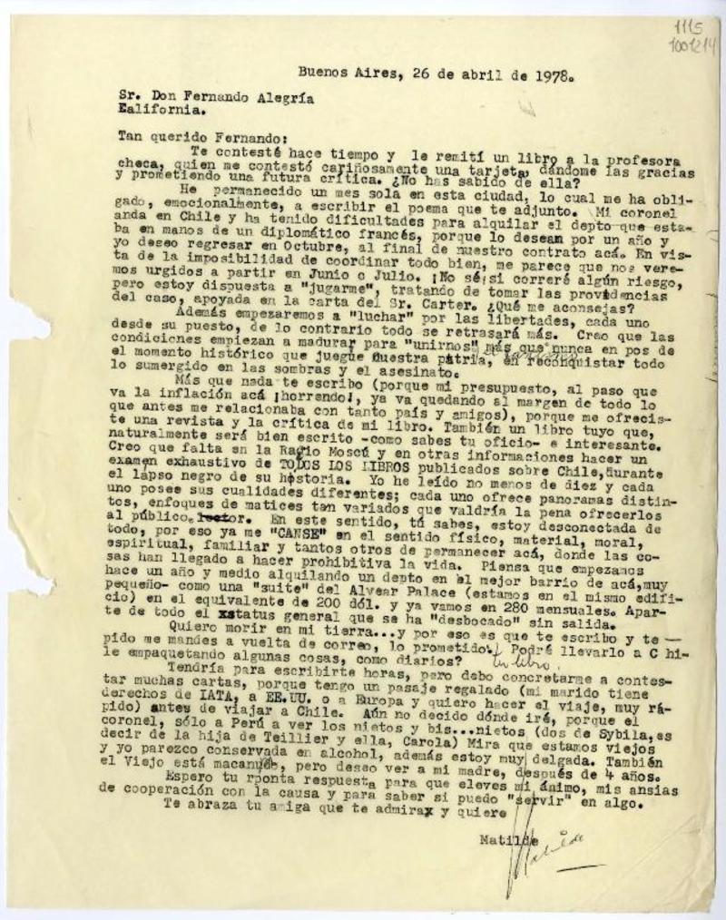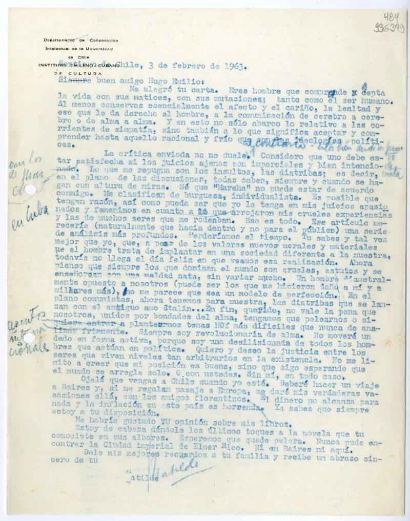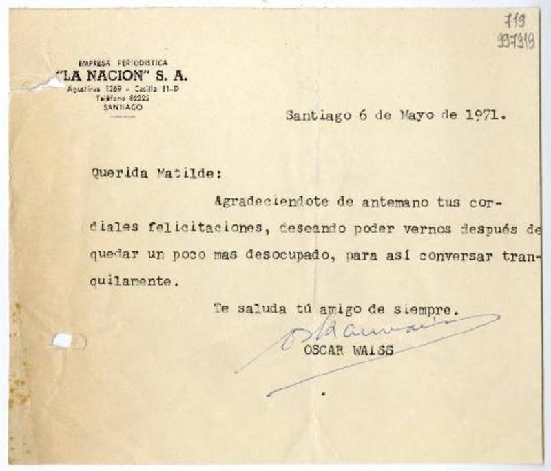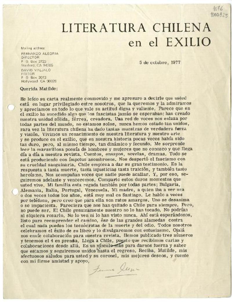 [Carta] 1953 abril 8, Santiago, [Chile] [a] Matilde Ladrón de Guevara [manuscrito] Raúl Hidalgo.