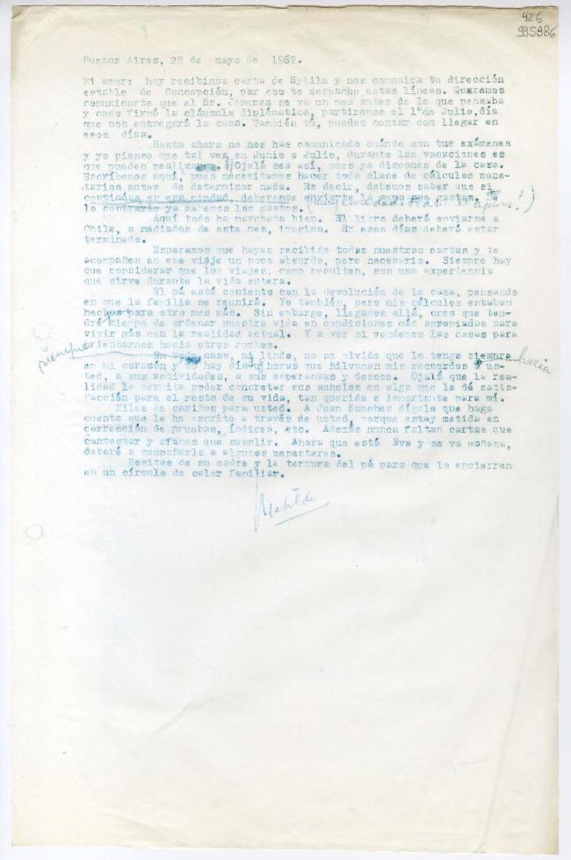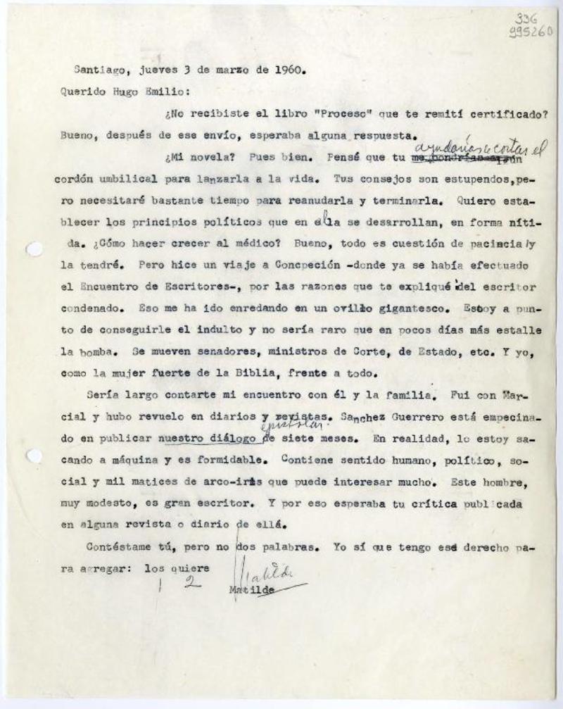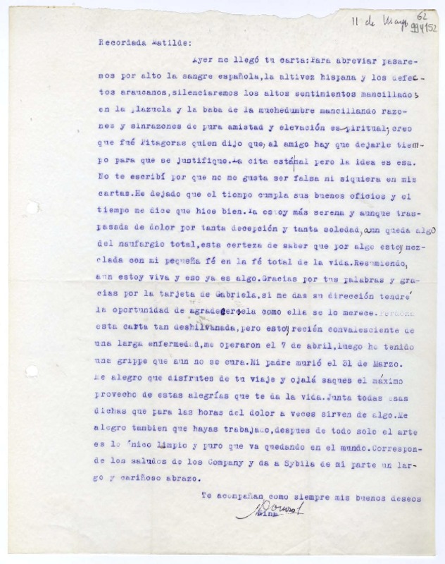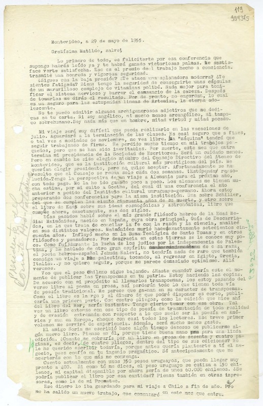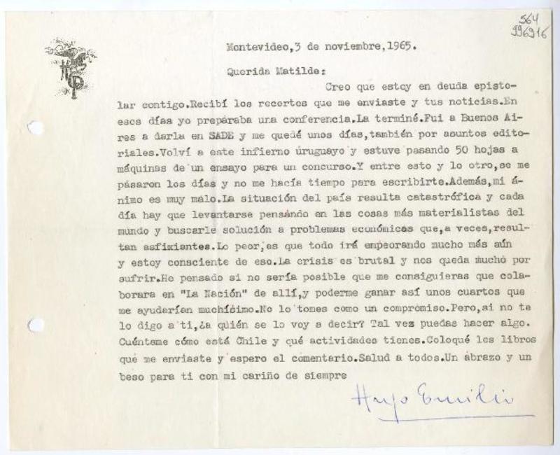 [Carta] 1952 mayo 3, Montevideo, [Uruguay] [a la] Querida Matilde [manuscrito] Hugo Emilio [Pedemonte].