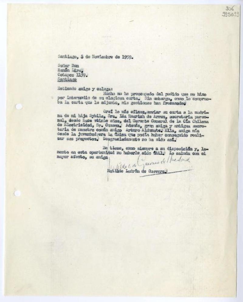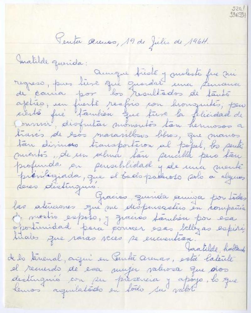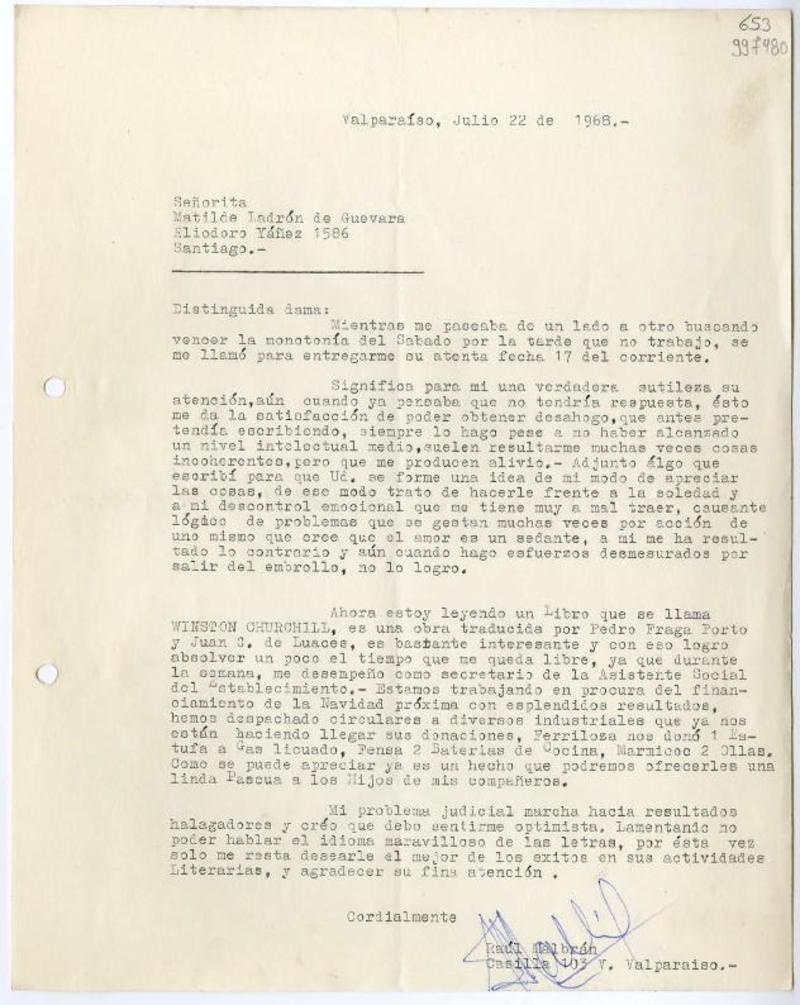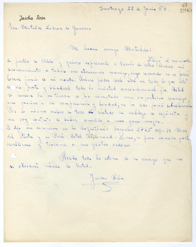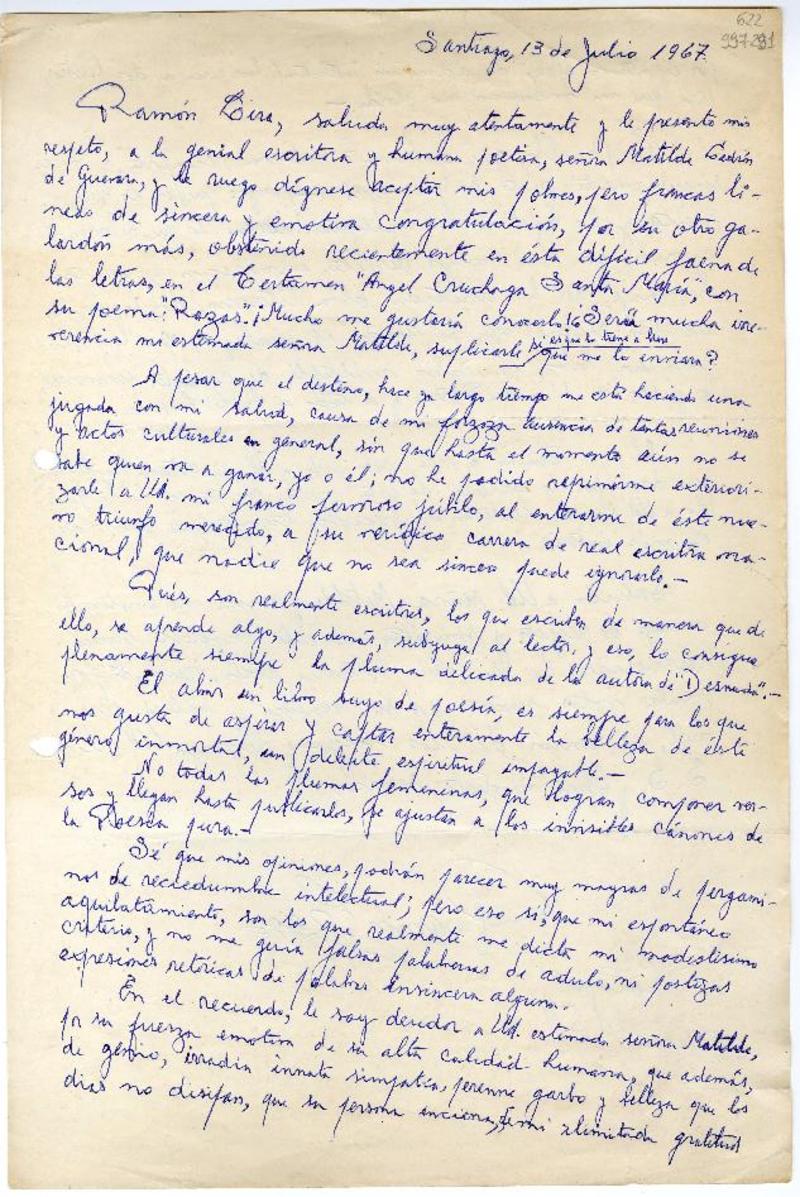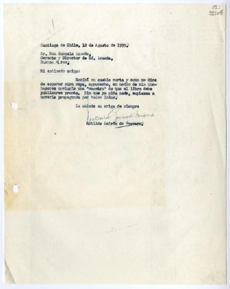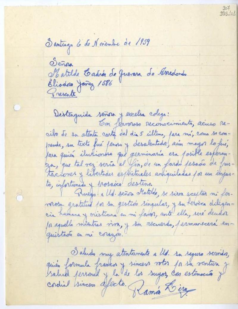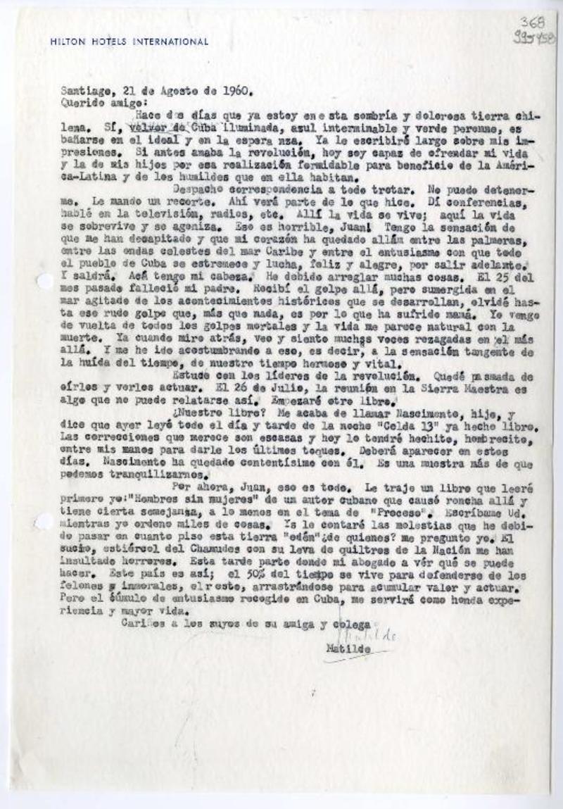 [Carta] 1953 agosto 7, Santiago, [Chile] [a] Matilde Ladrón de Guevara de Arredondo [manuscrito] Raúl Hidalgo.