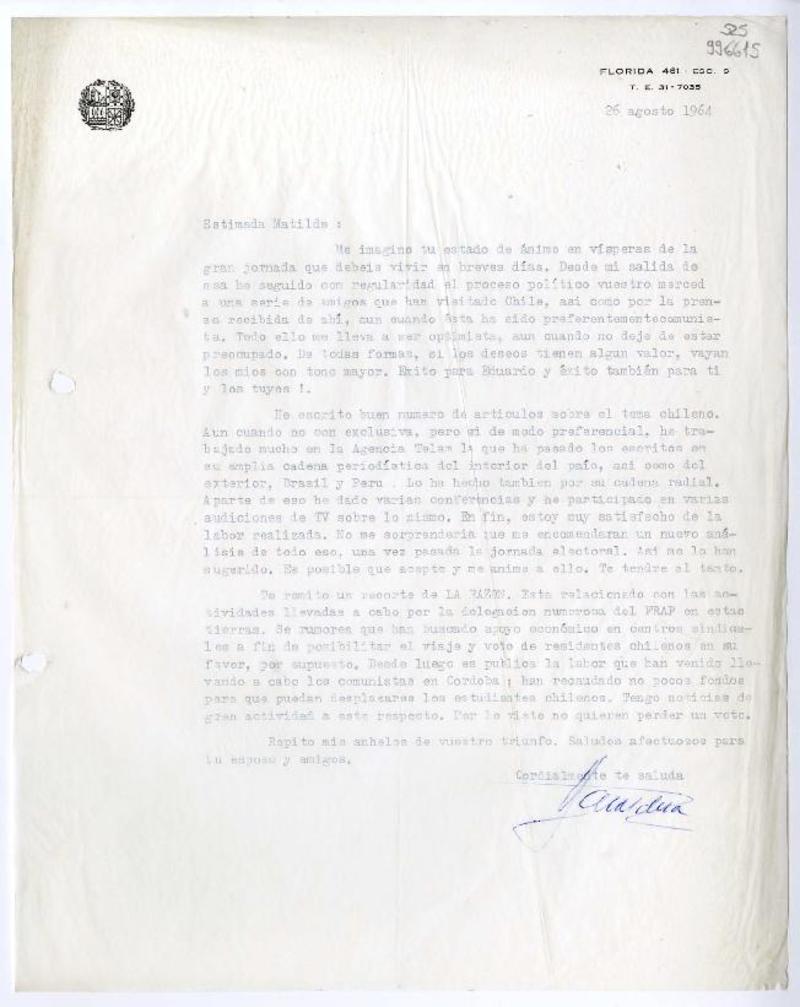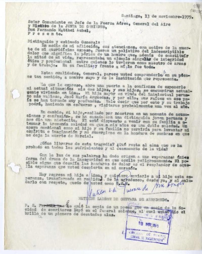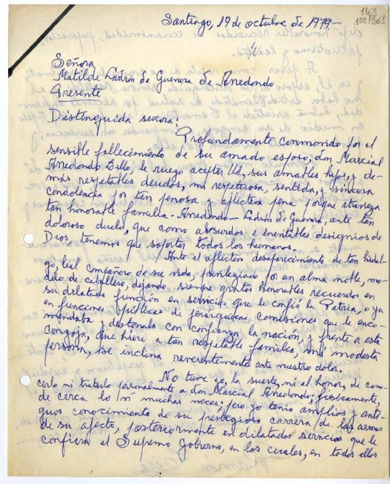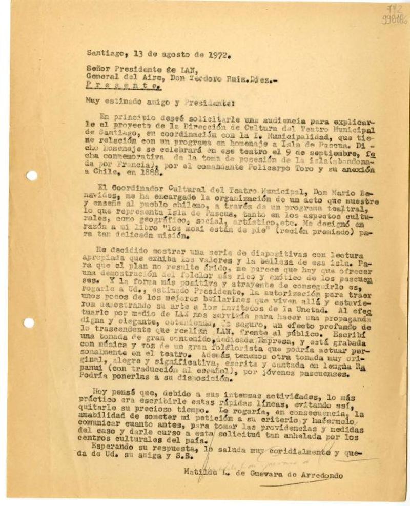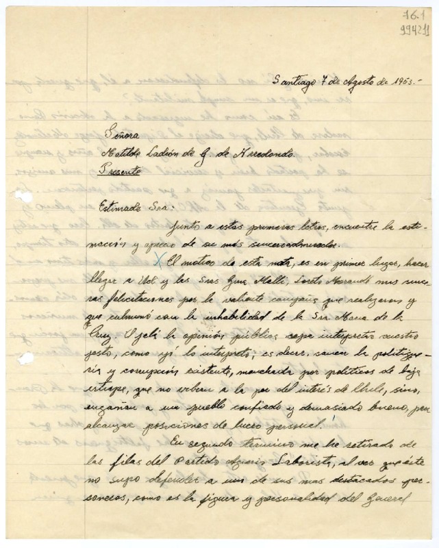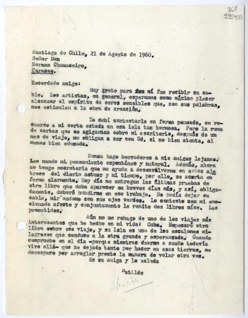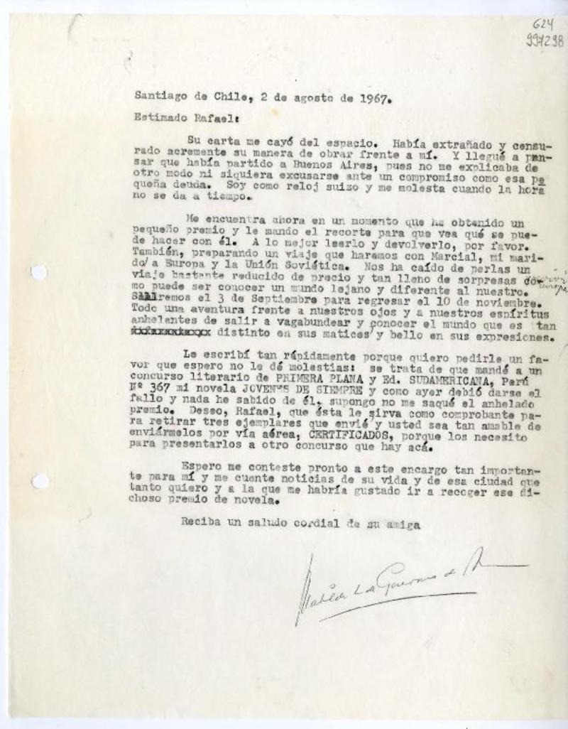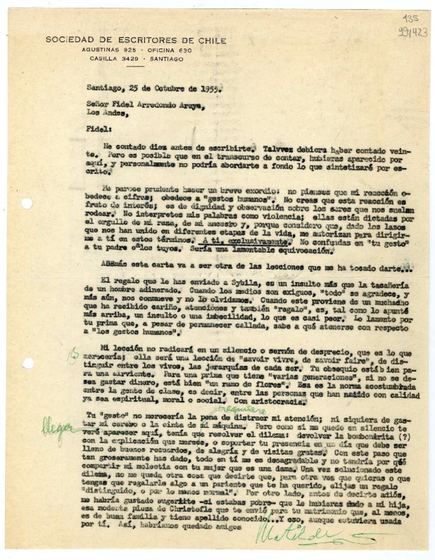[Carta] 1953 agosto 7, Santiago, [Chile] [a] Matilde Ladrón de Guevara de Arredondo [manuscrito] Raúl Hidalgo.