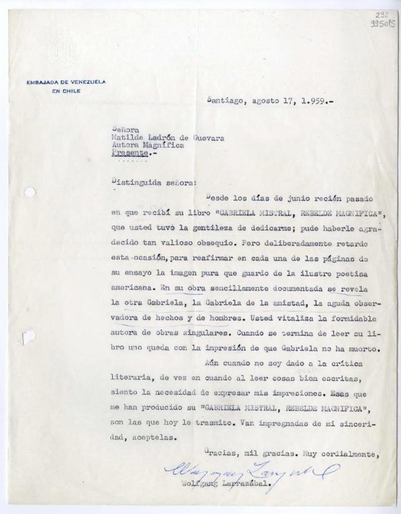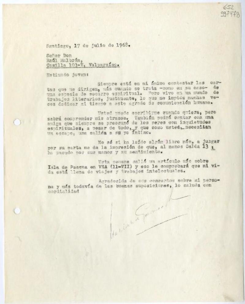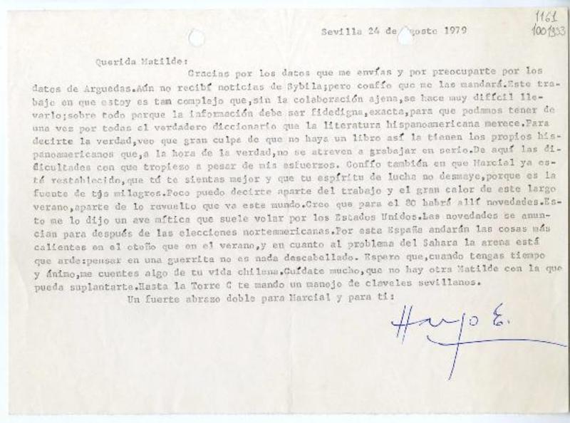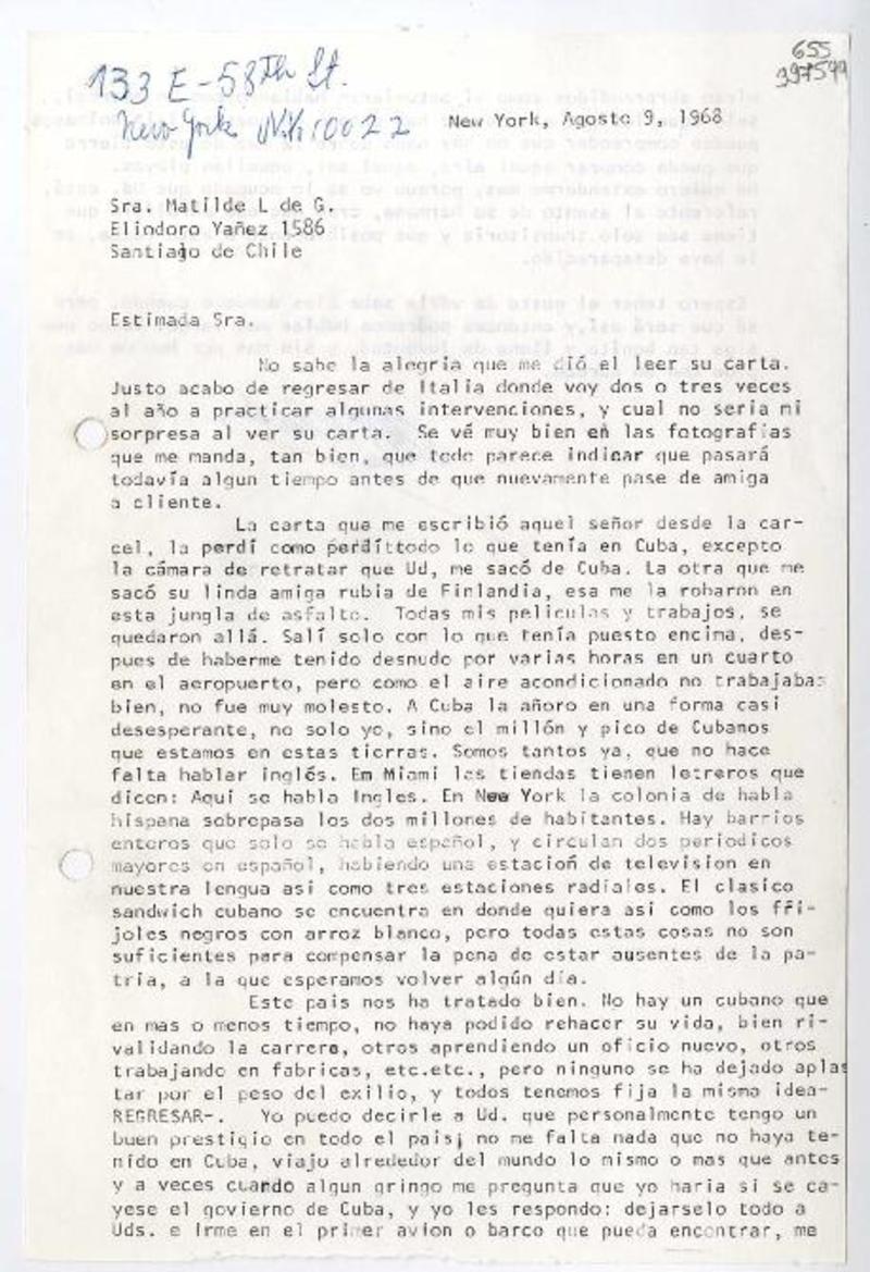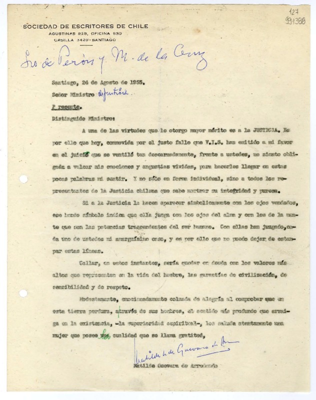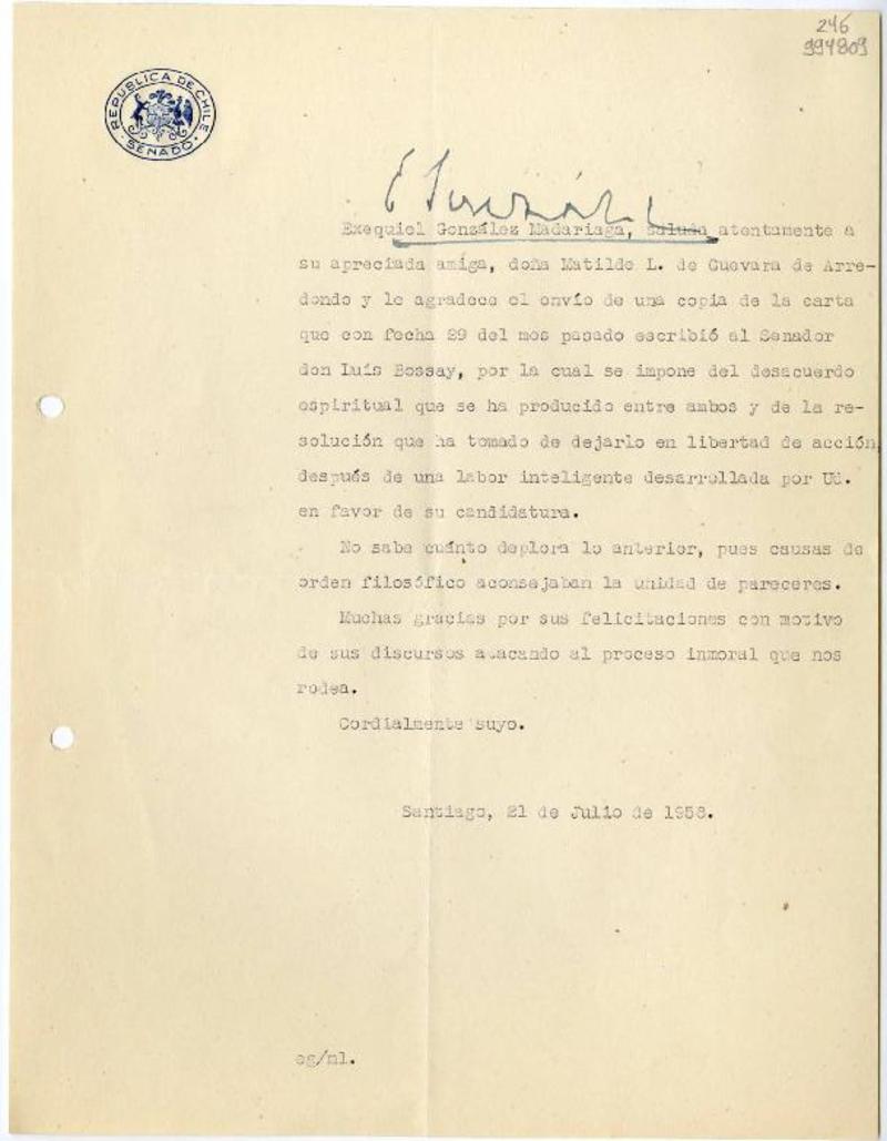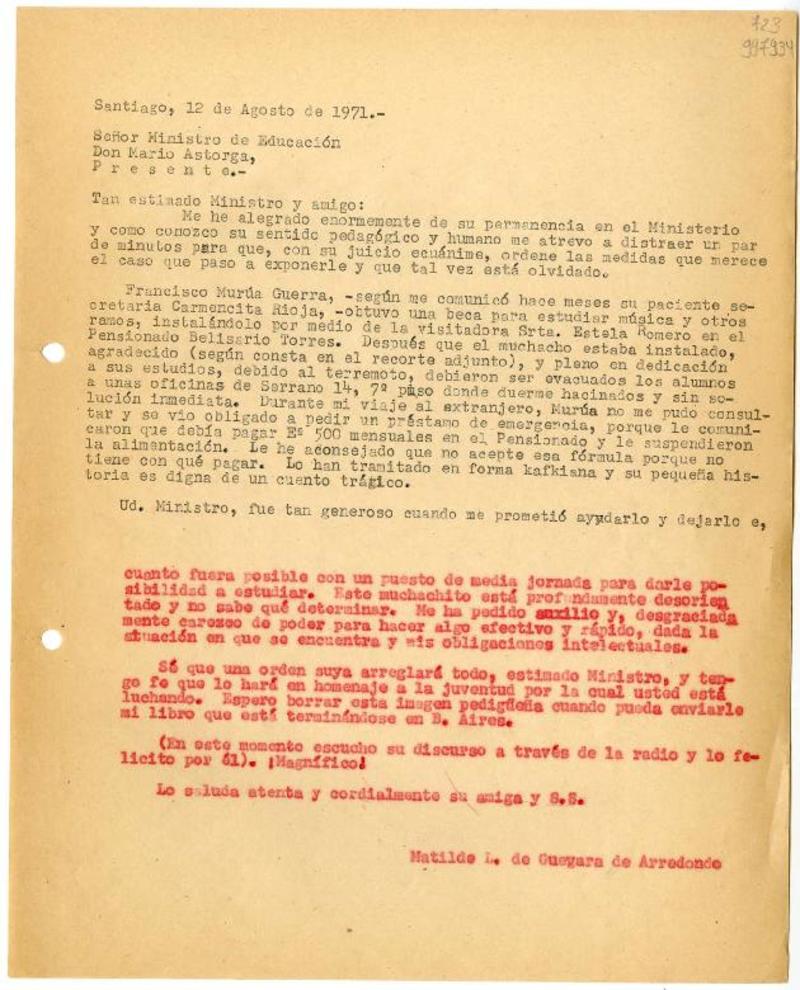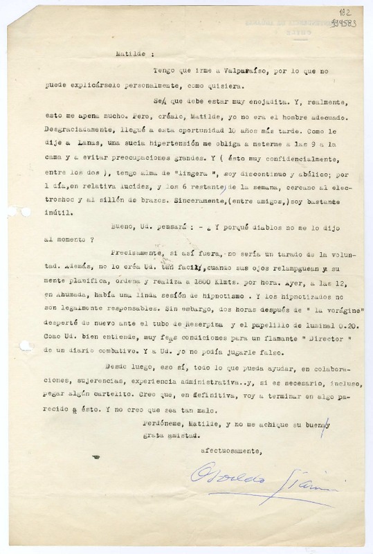 [Carta] 1953 agosto 7, Santiago, [Chile] [a] Matilde Ladrón de Guevara de Arredondo [manuscrito] Raúl Hidalgo.