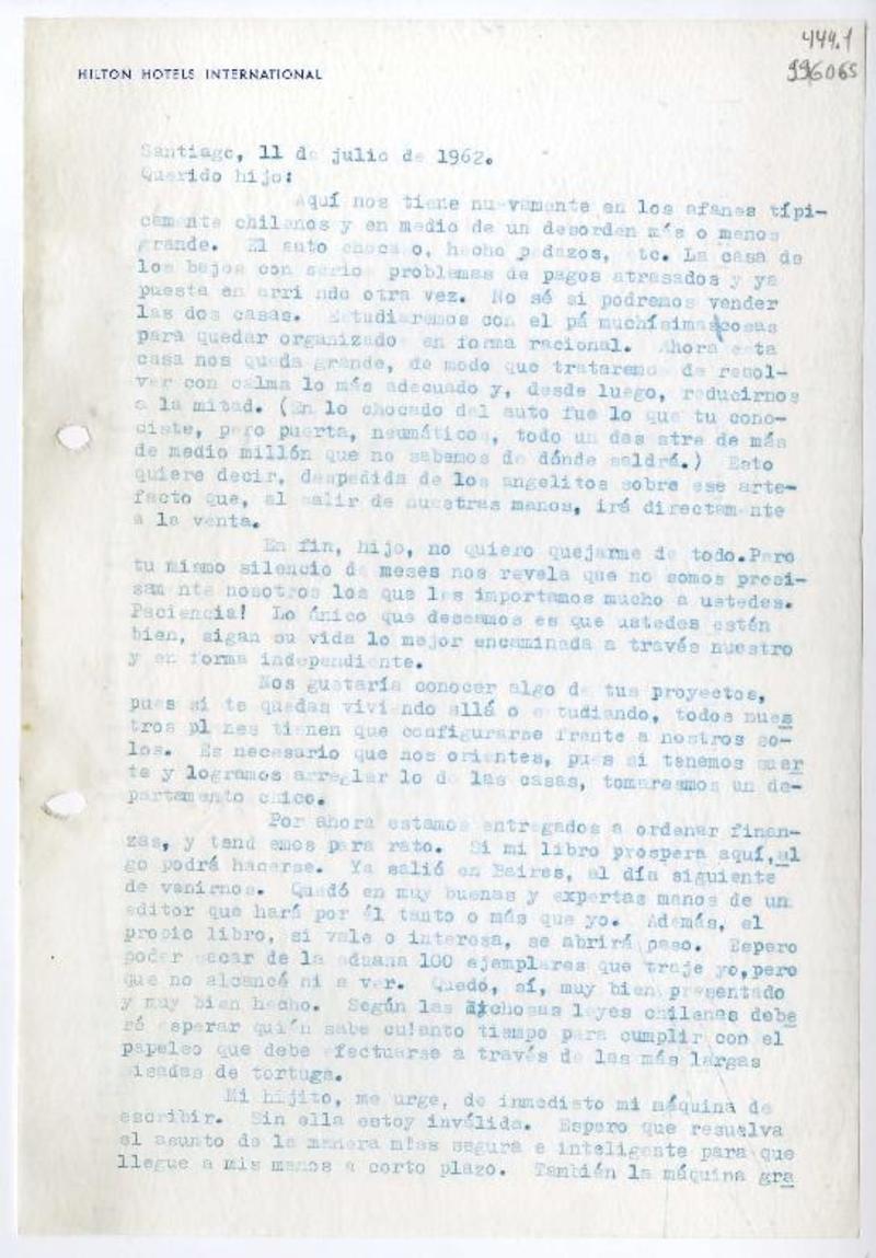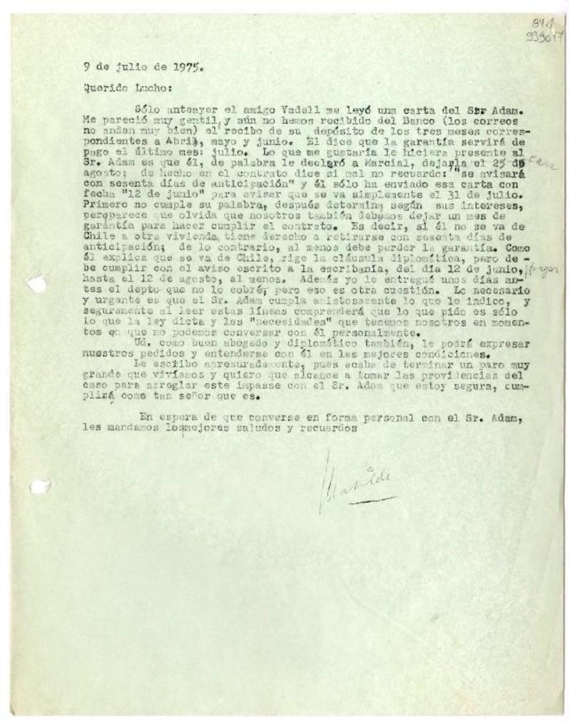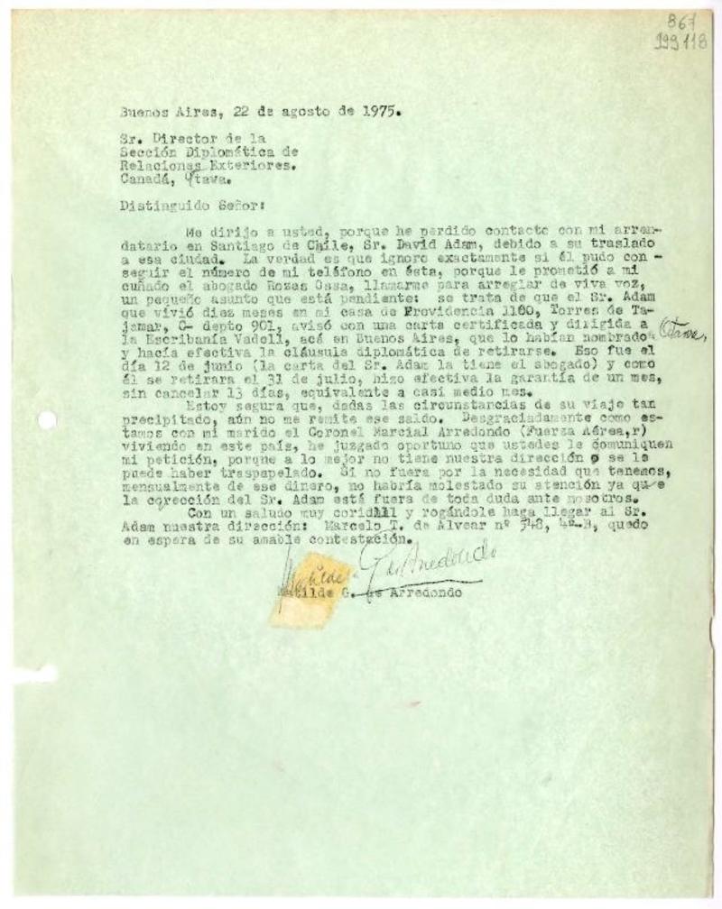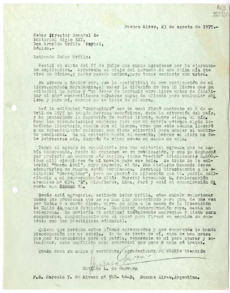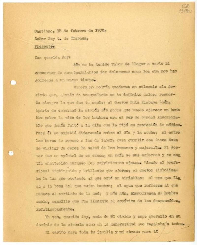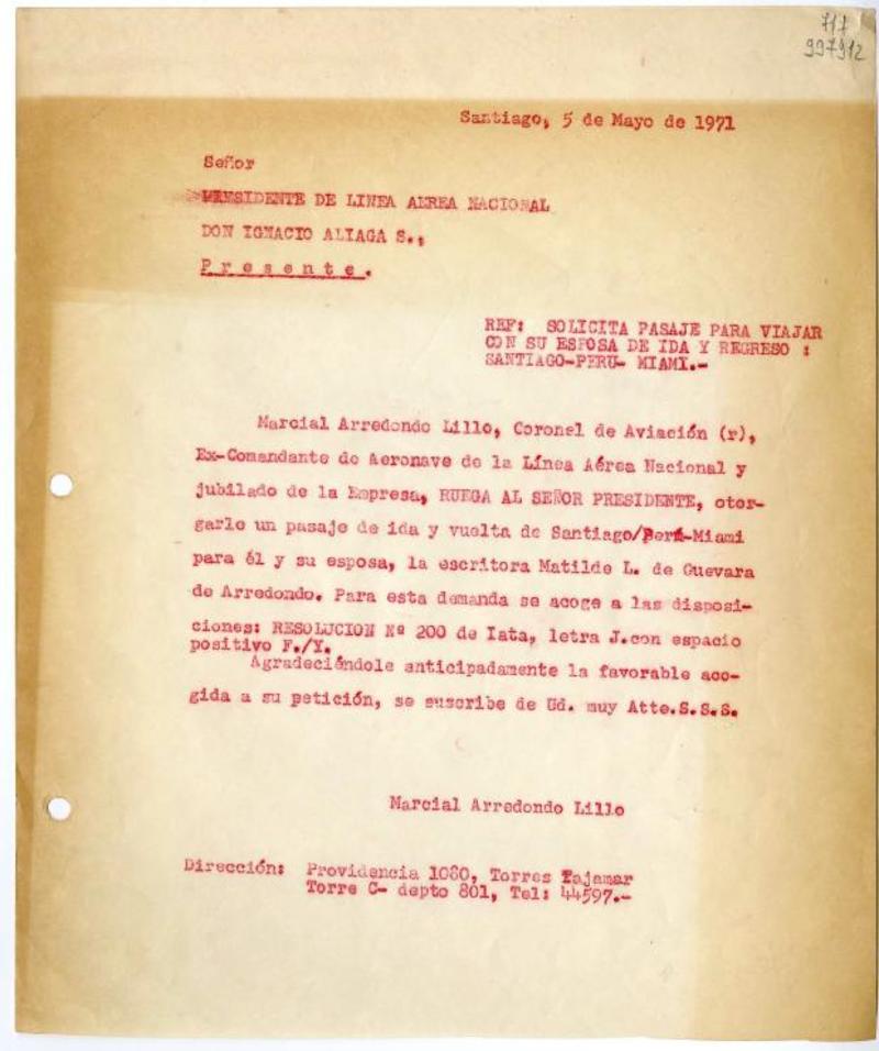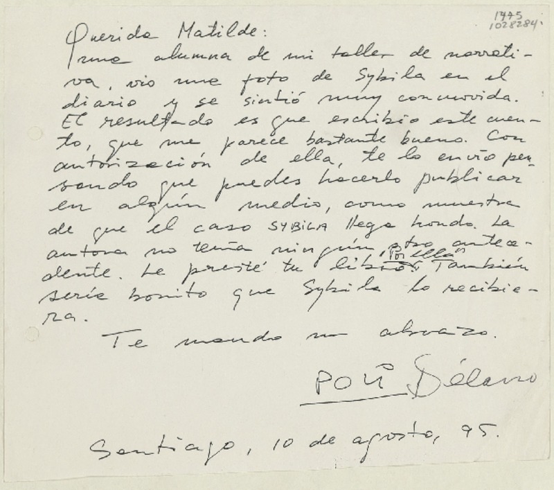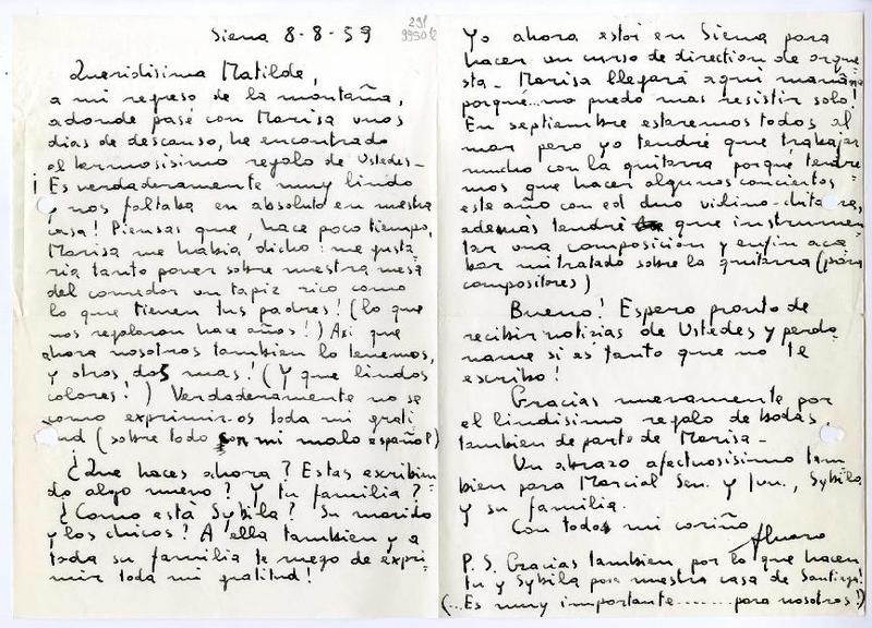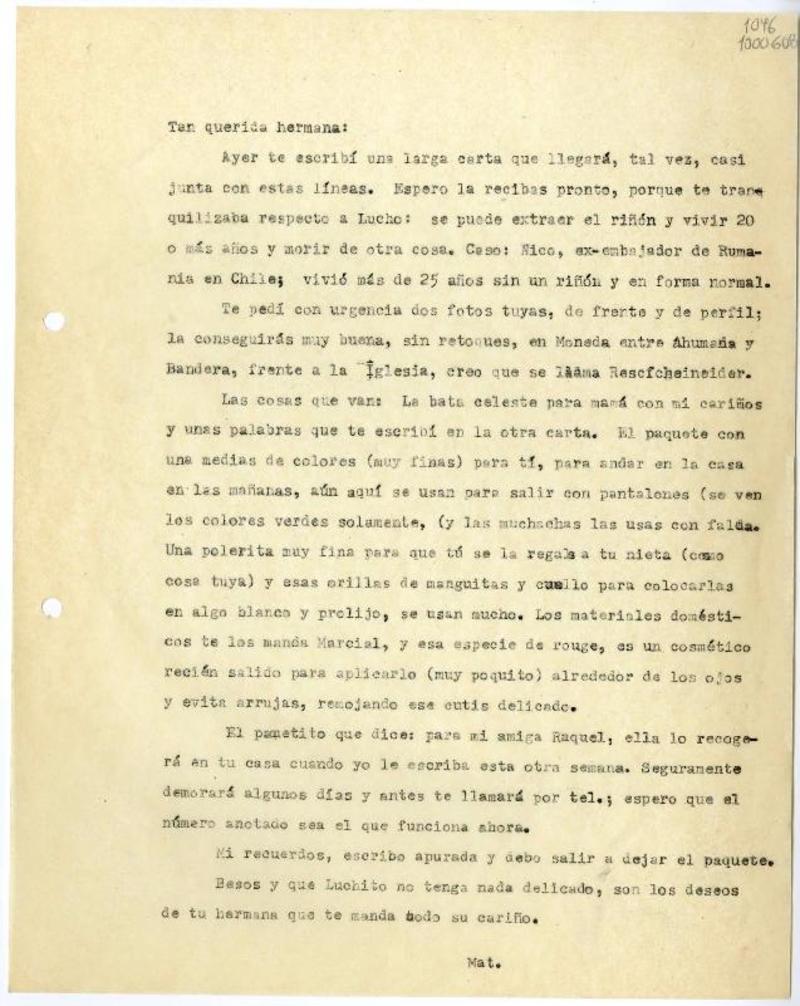 [Carta] 1953 agosto 7, Santiago, [Chile] [a] Matilde Ladrón de Guevara de Arredondo [manuscrito] Raúl Hidalgo.