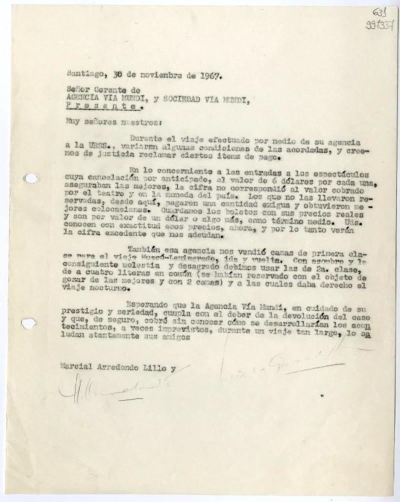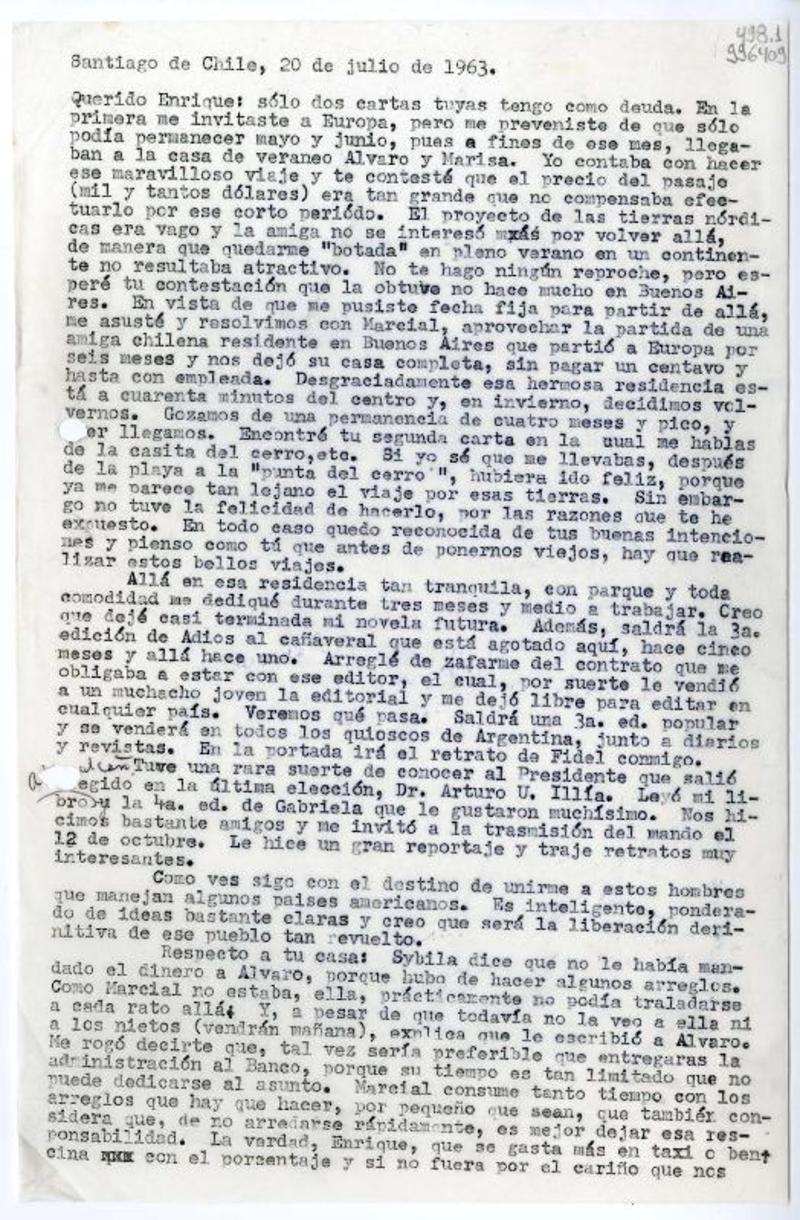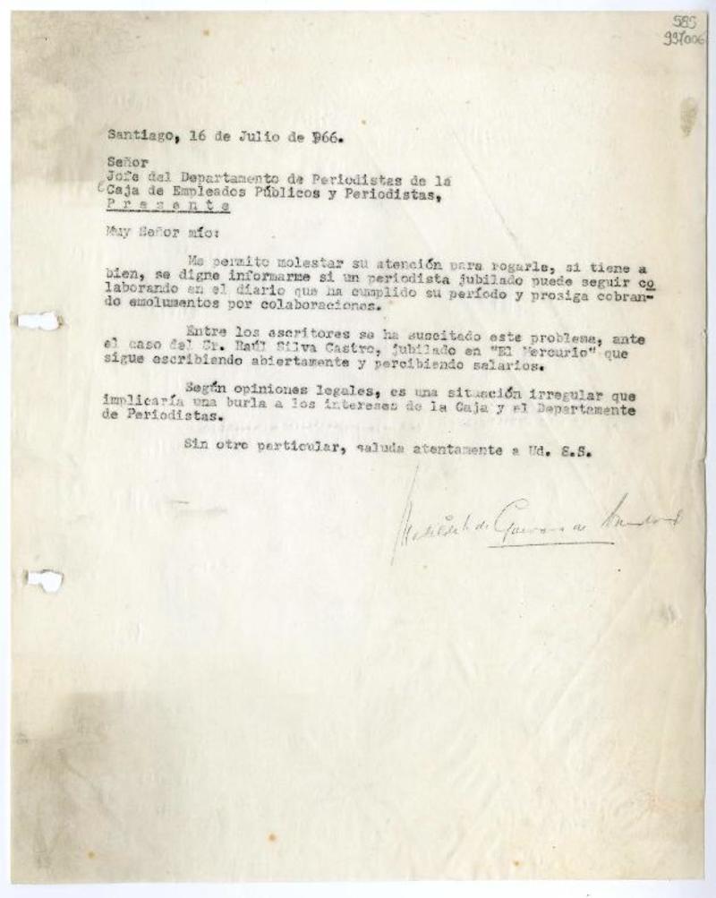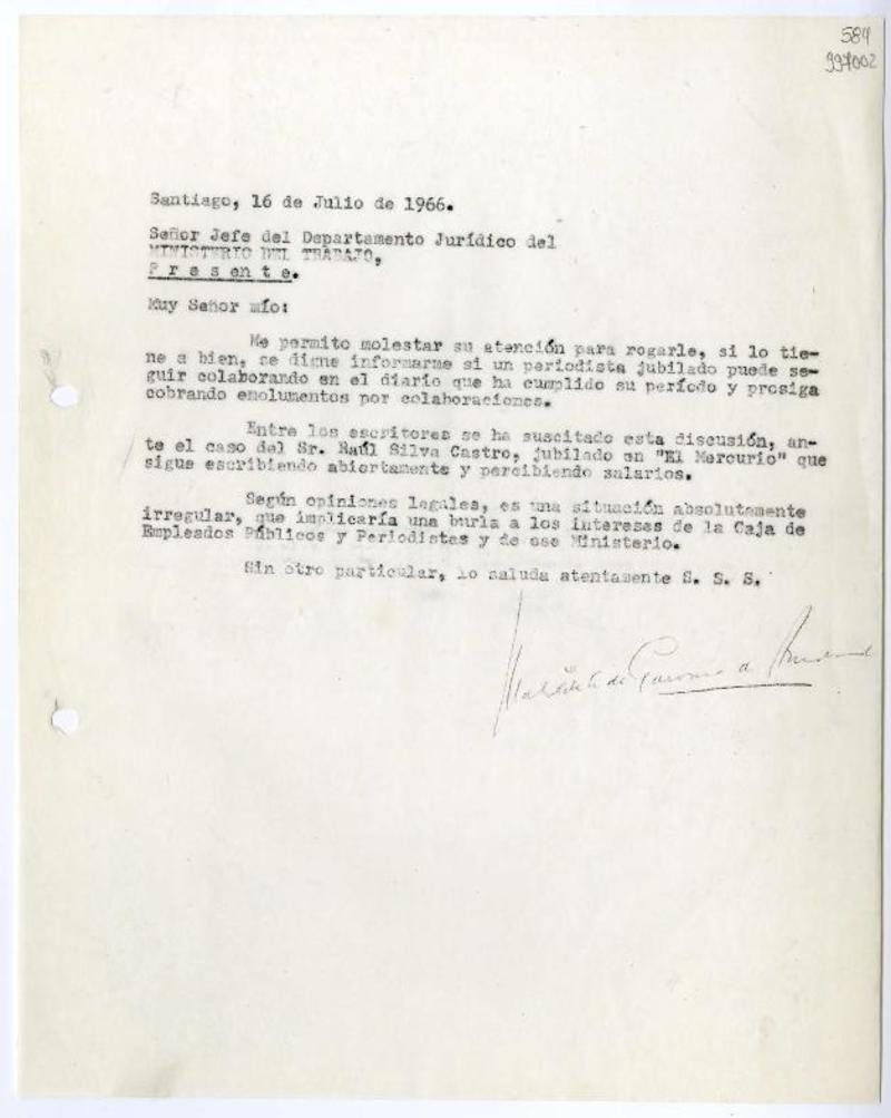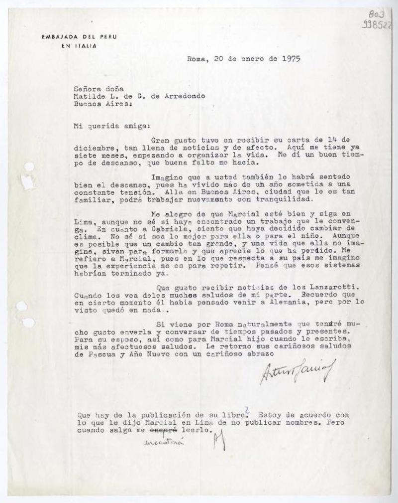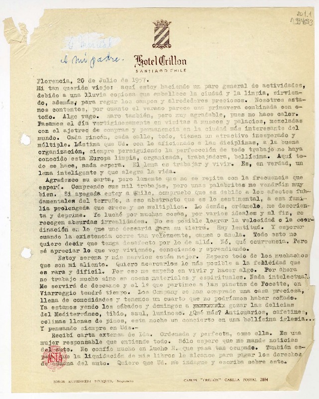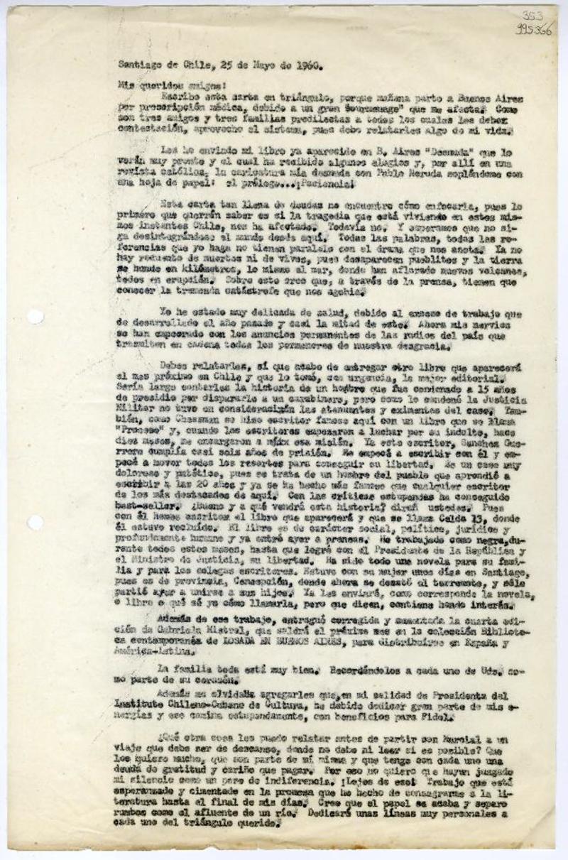 [Carta] 1953 agosto 7, Santiago, [Chile] [a] Matilde Ladrón de Guevara de Arredondo [manuscrito] Raúl Hidalgo.