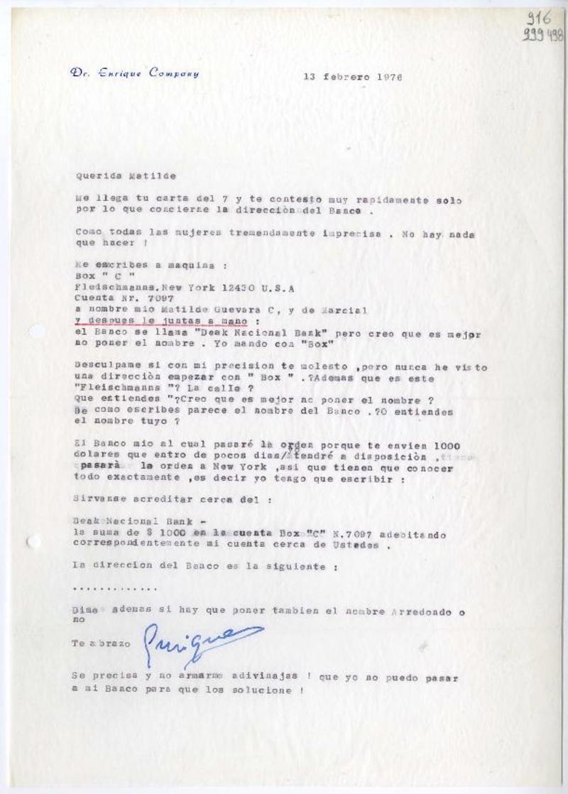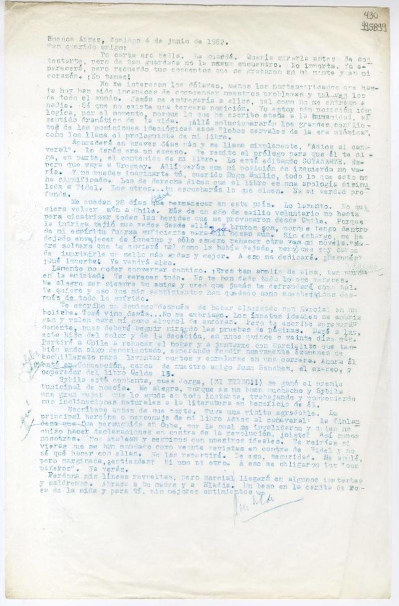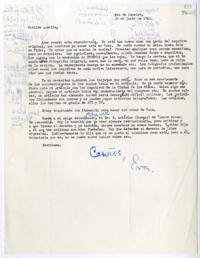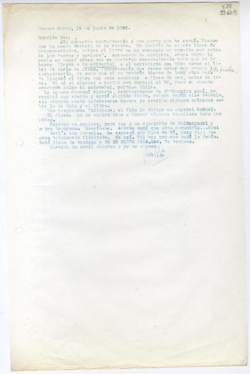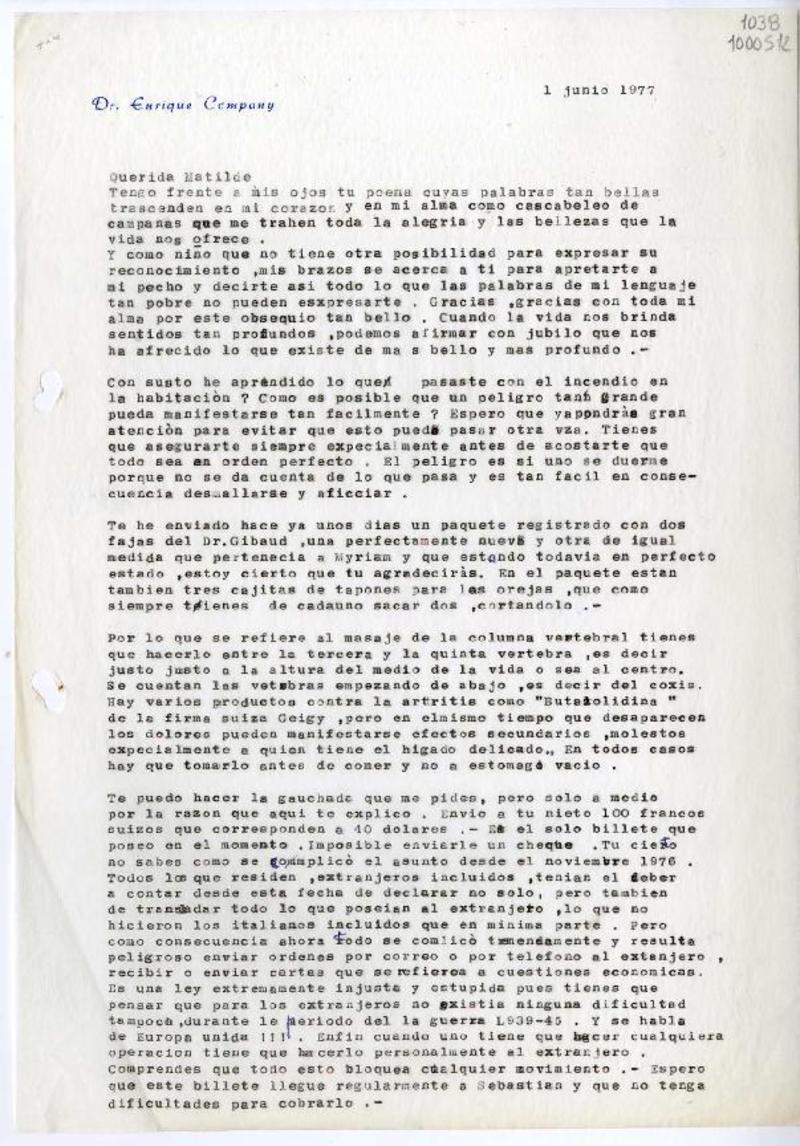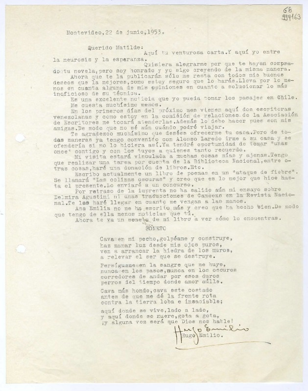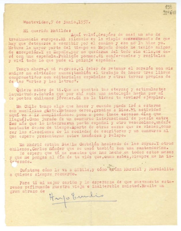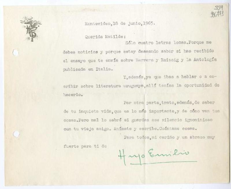 [Carta] 1952 junio 6, Montevideo, [Uruguay] [a la] Querida Matilde [manuscrito] Hugo Emilio [Pedemonte].