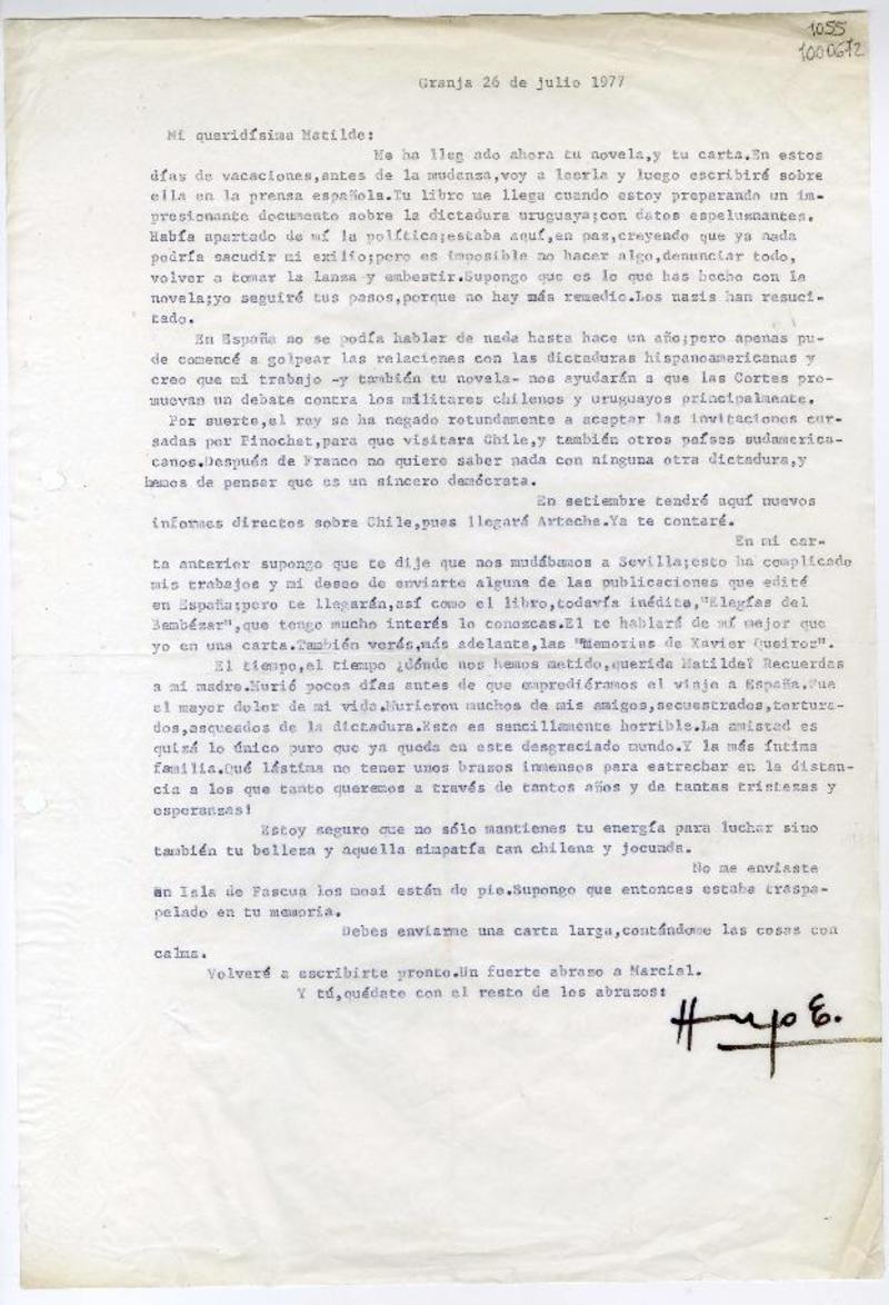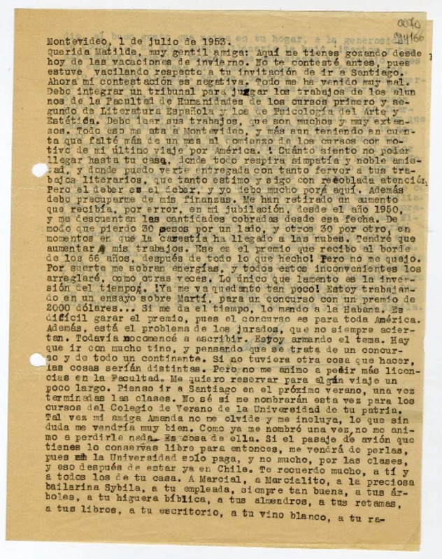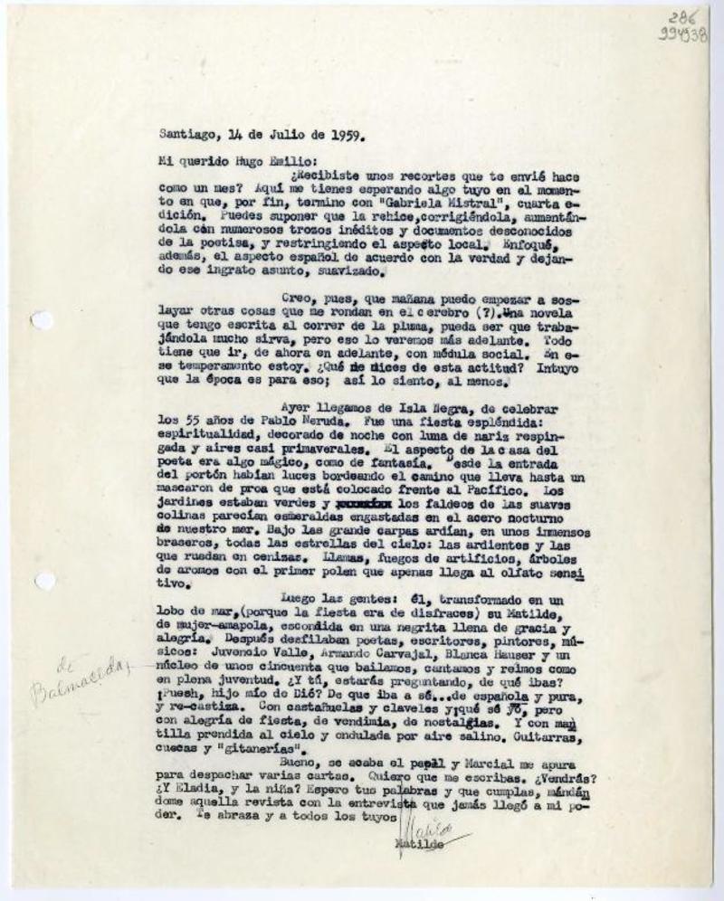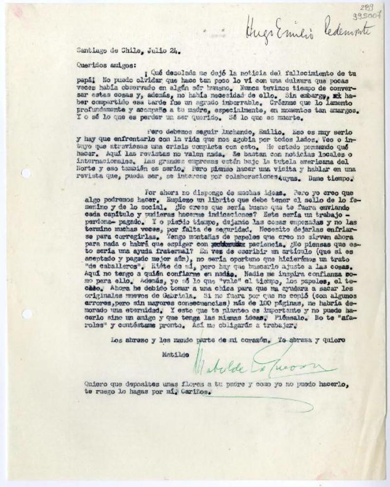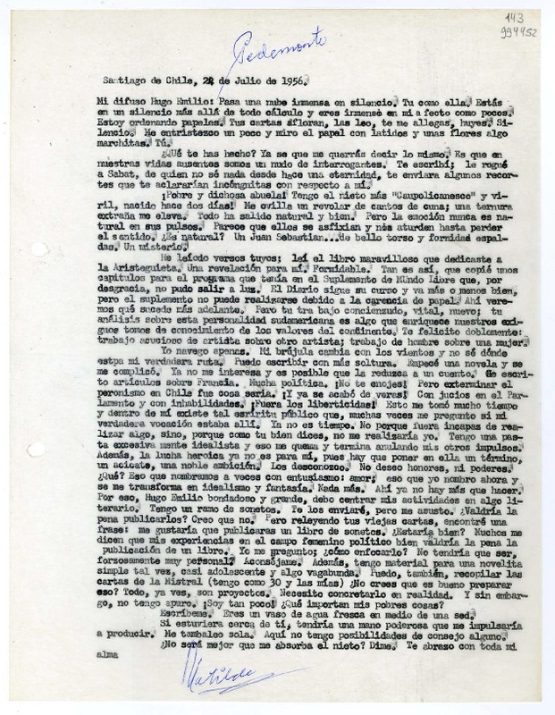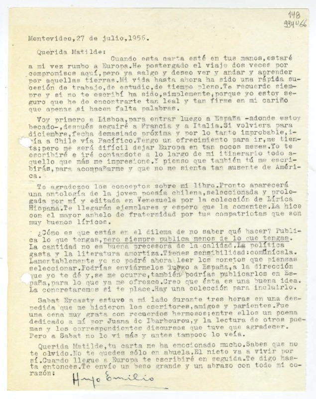 [Carta] 1952 julio 1, Montevideo, [Uruguay] [a la] Querida Matilde [manuscrito] Hugo Emilio [Pedemonte].