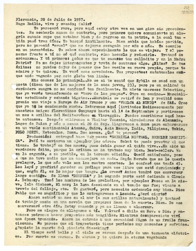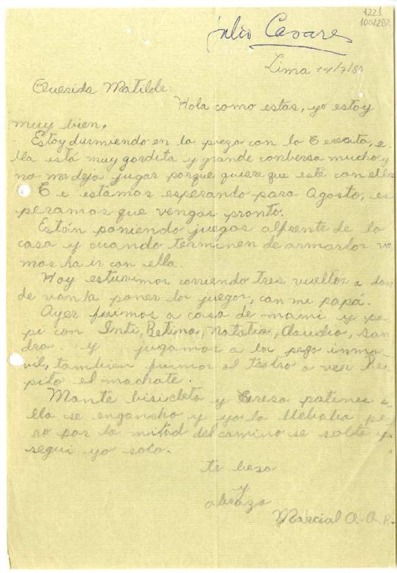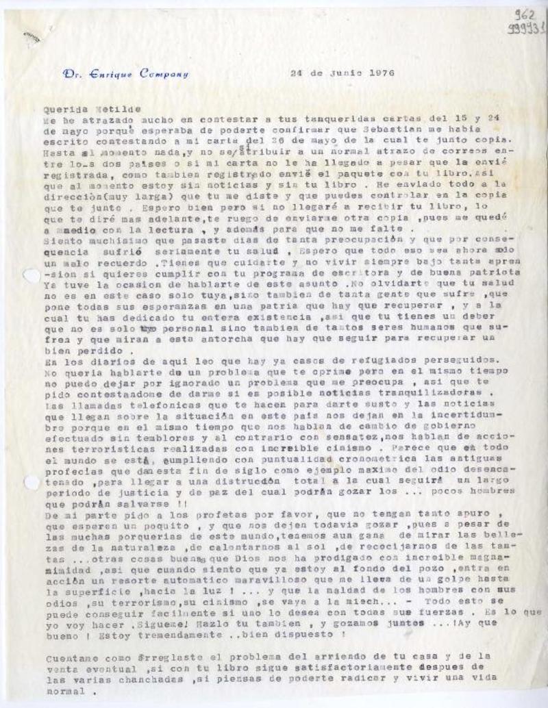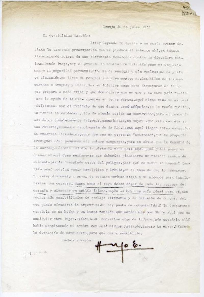 [Carta] 1952 julio 1, Montevideo, [Uruguay] [a la] Querida Matilde [manuscrito] Hugo Emilio [Pedemonte].