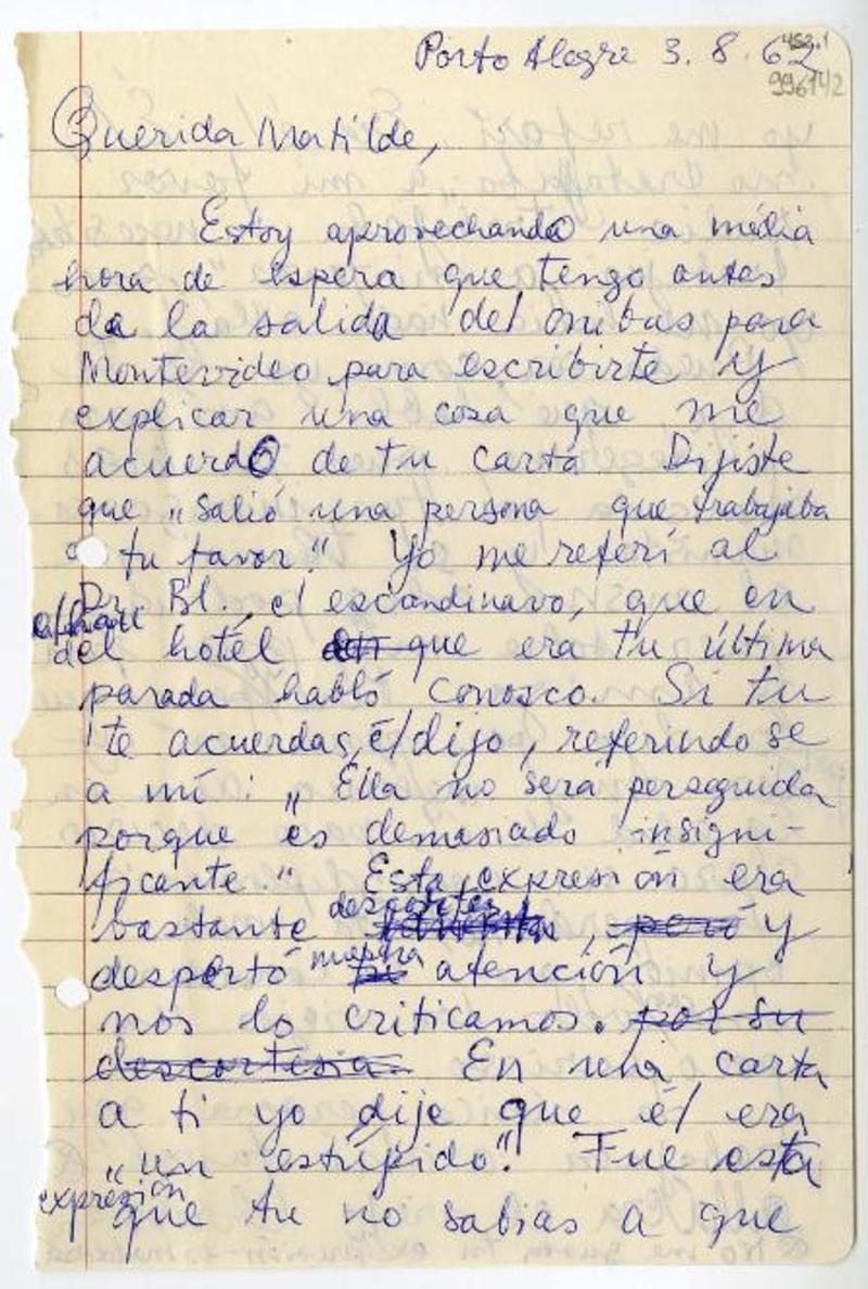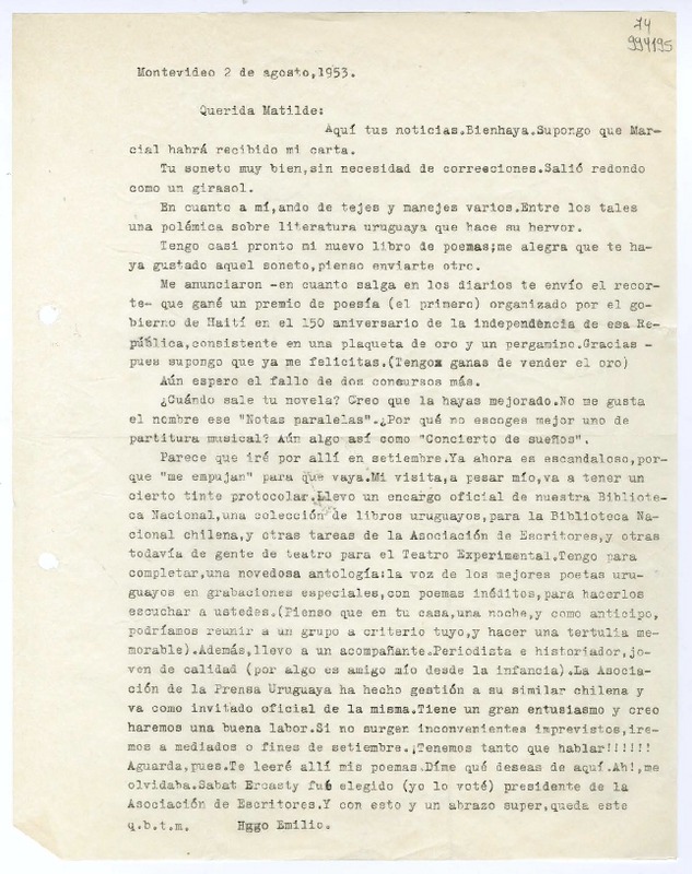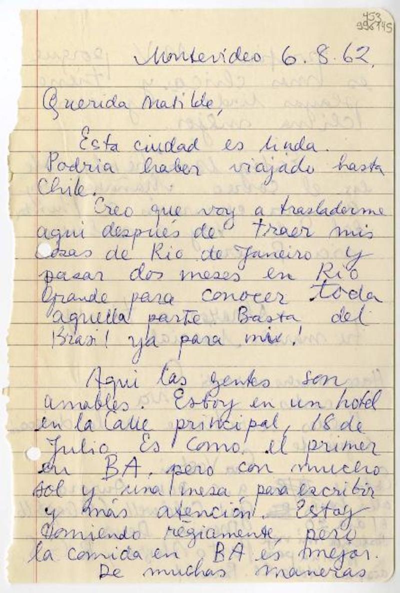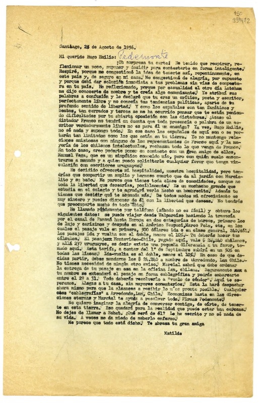 [Carta] 1953 agosto 2, Montevideo, [Uruguay] [a] Querida Matilde [manuscrito] Hugo Emilio Pedemonte.