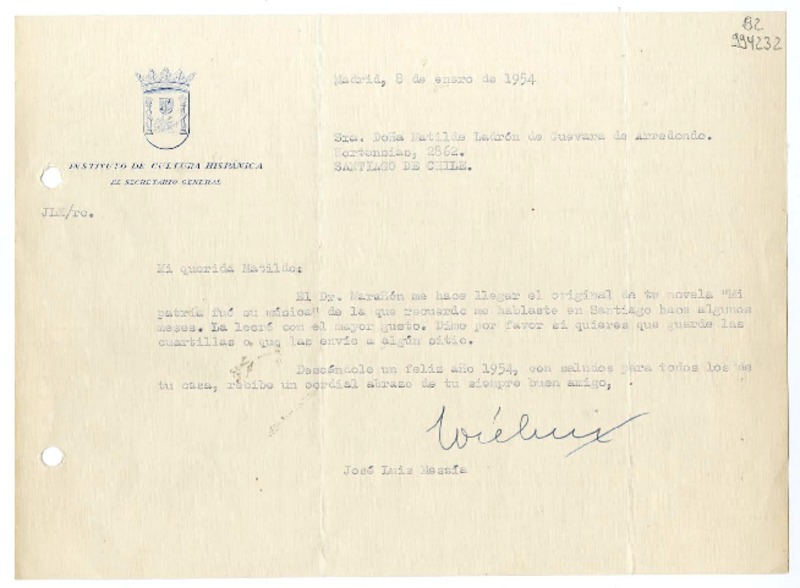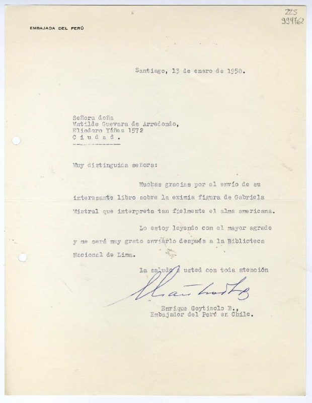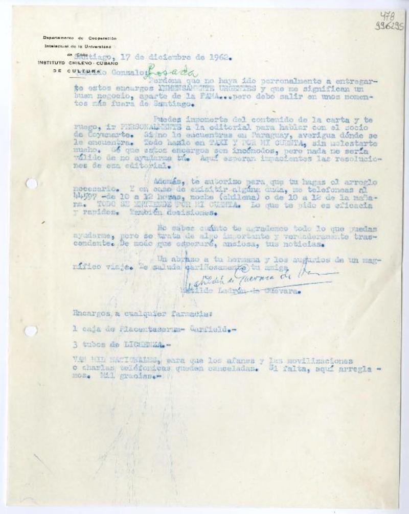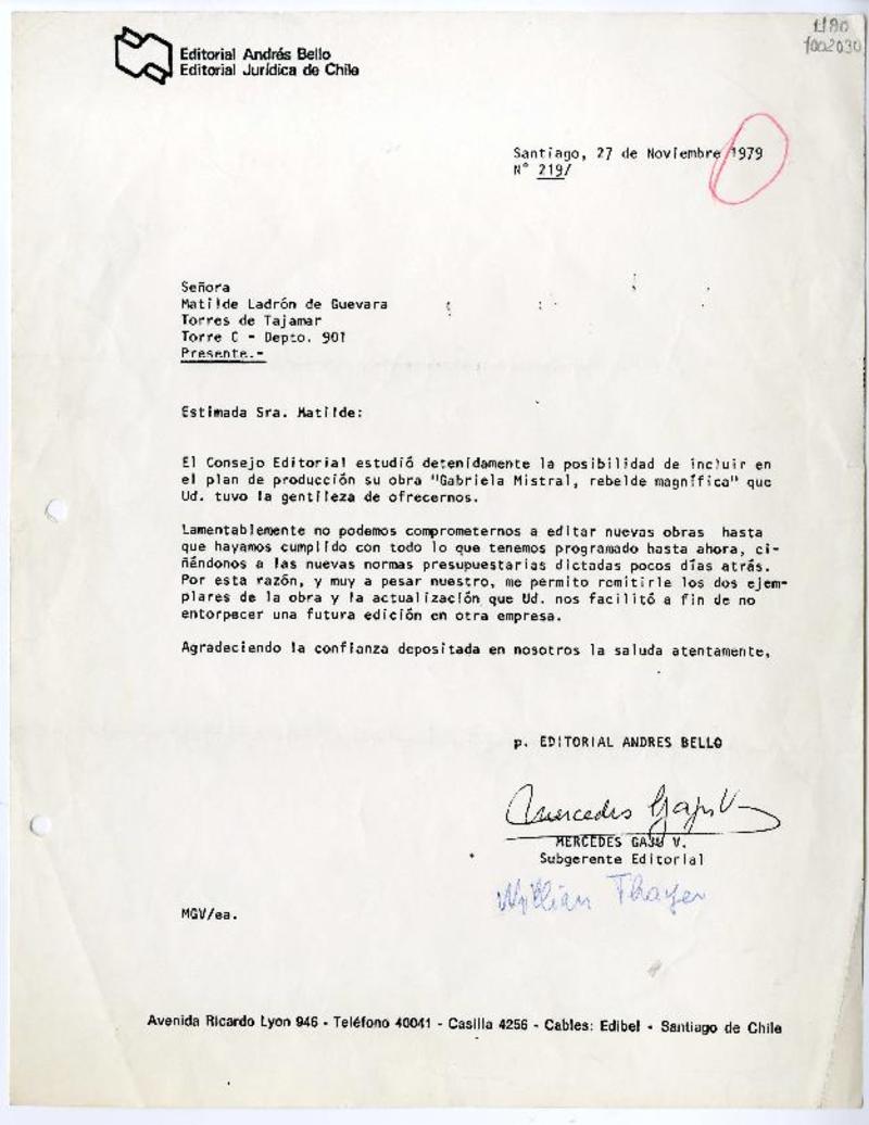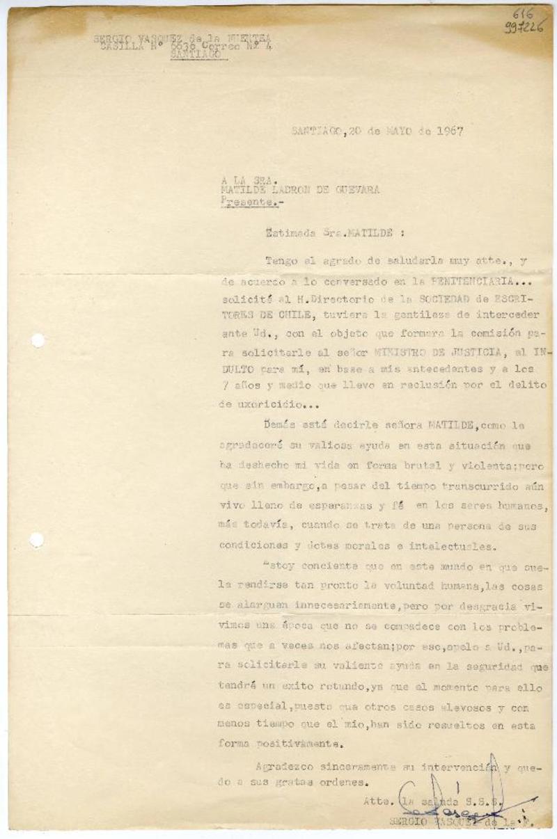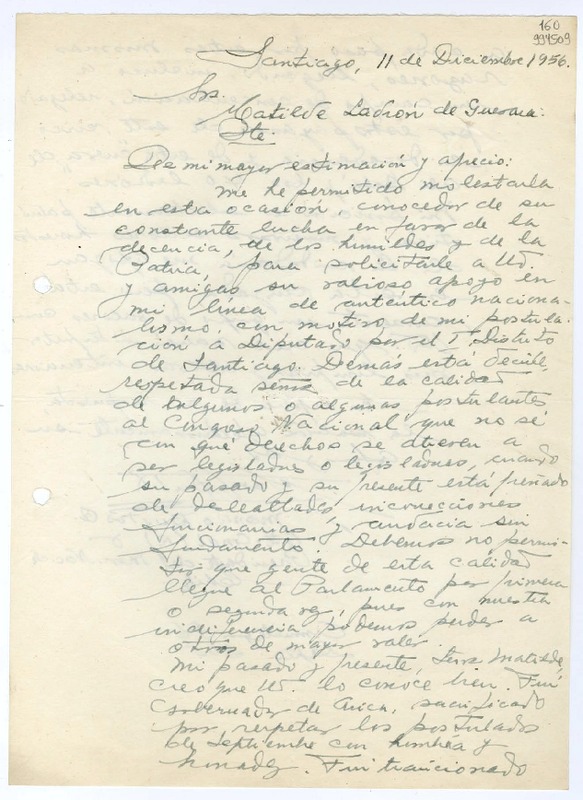 [Carta] 1952 diciembre 1, Santiago, [Chile] [a] Matilde Ladrón de Guevara [manuscrito] José Dolores Vásquez R.