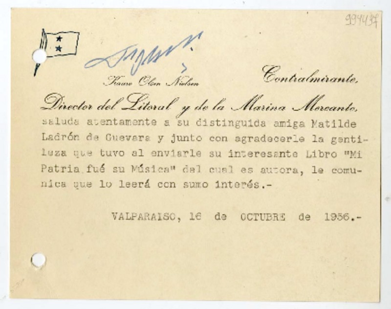 [Tarjeta] 1956 octubre 16, Valparaíso [a] Matilde Ladrón de Guevara [manuscrito] Kaare Olsen Nielsen.