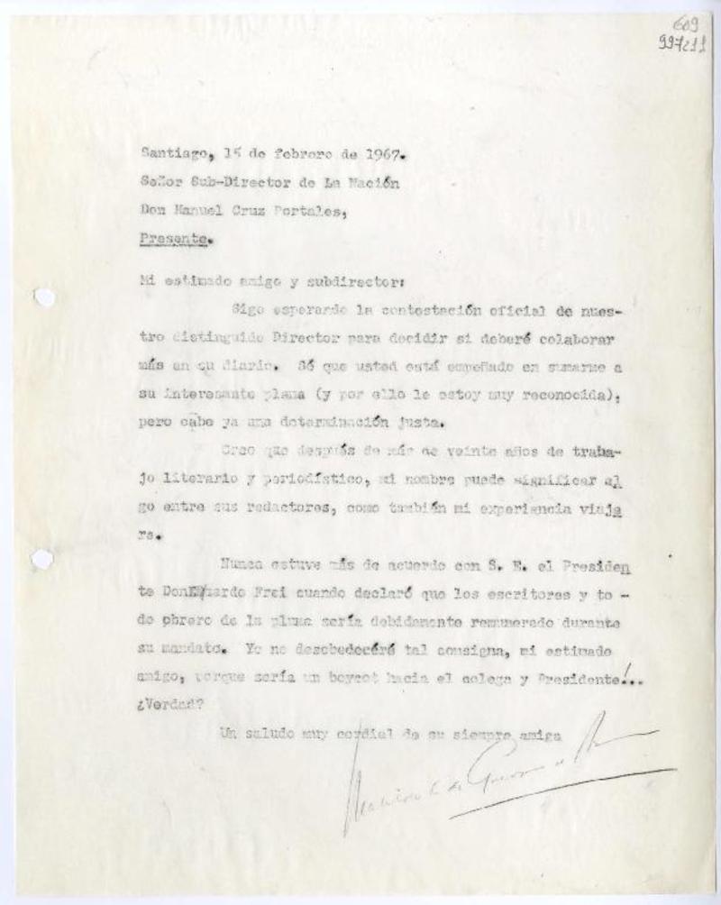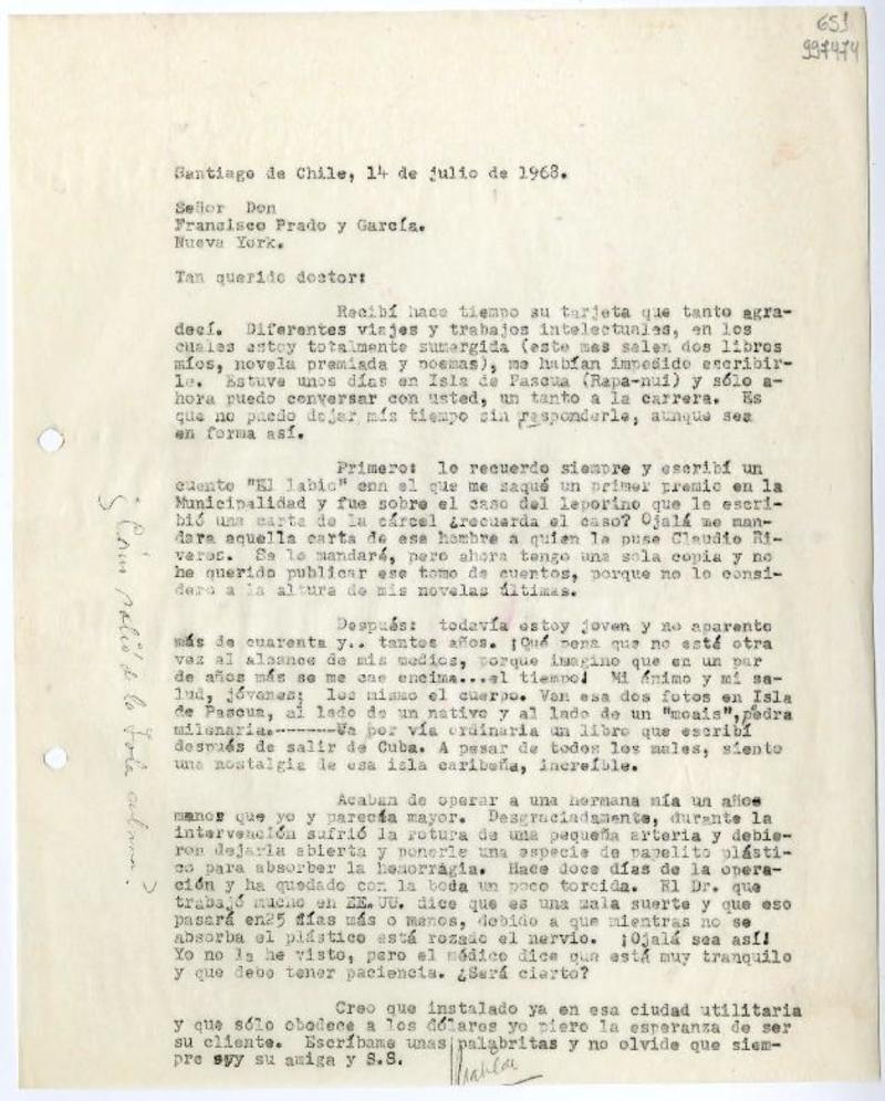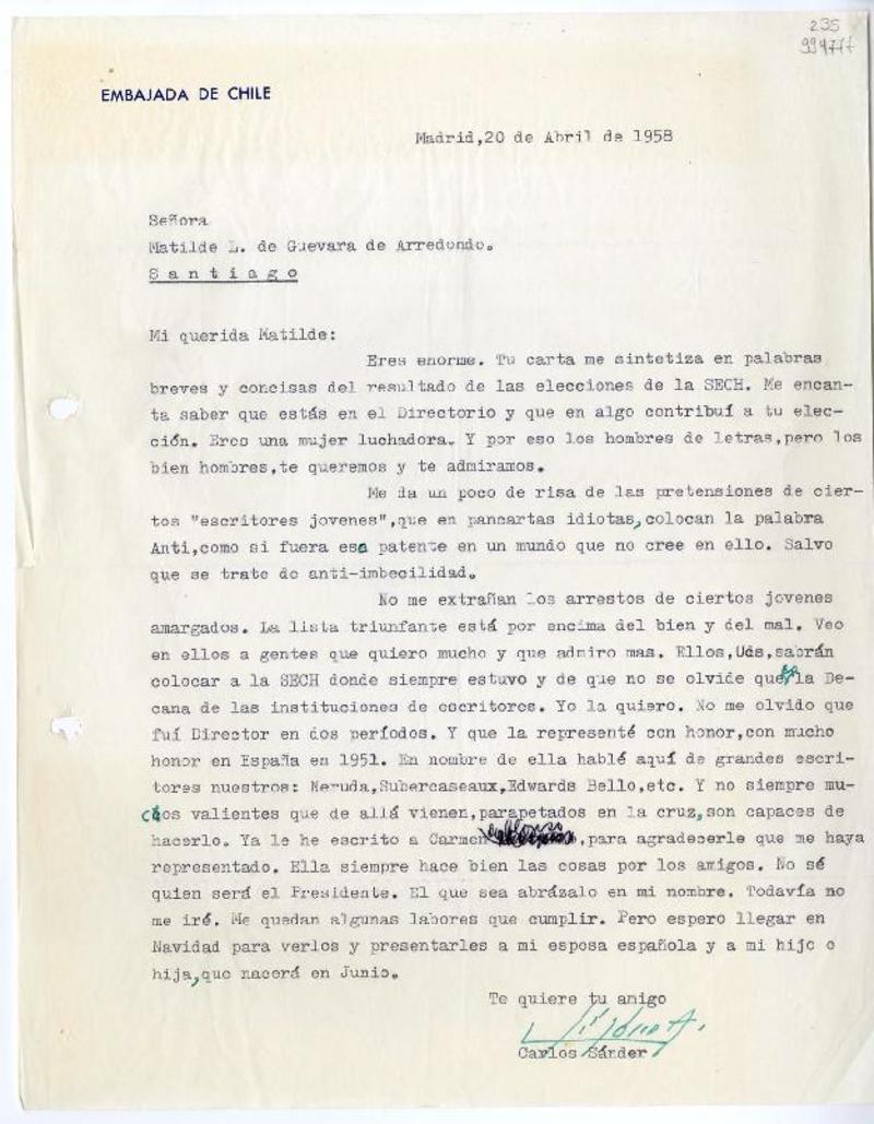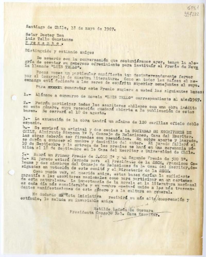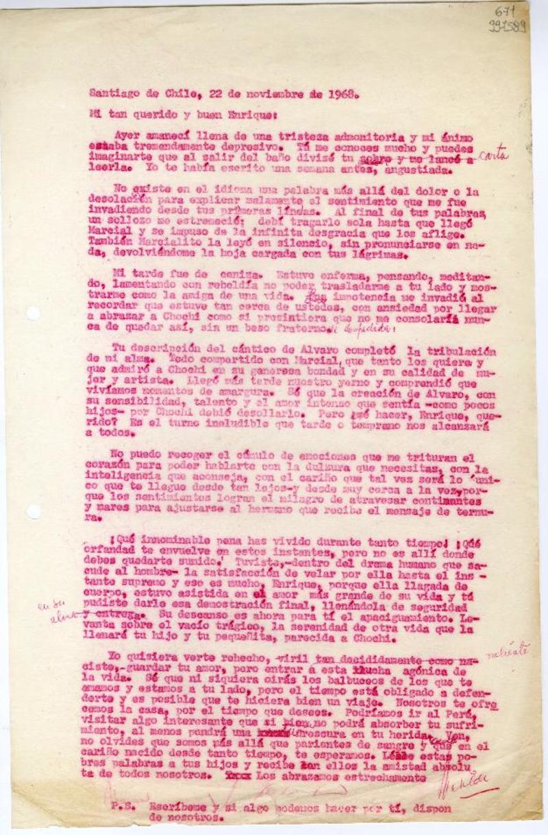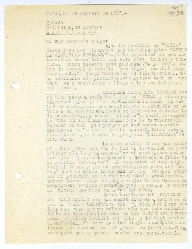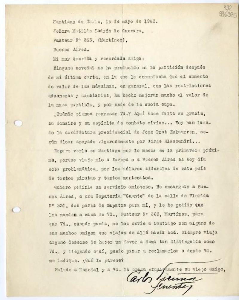 Préndez Saldías, Carlos - Correspondencia - Autores chilenos - Manuscritos chilenos - Ladrón de Guevara, Matilde