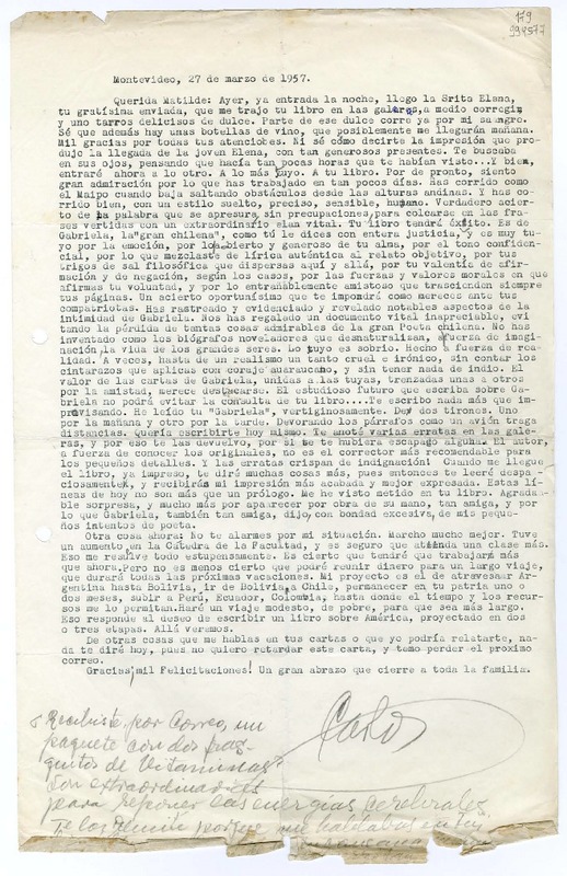 [Carta] 1952 marzo 28, Montevideo, [Uruguay] [a la] Querida Matilde [manuscrito] Hugo Emilio [Pedemonte].