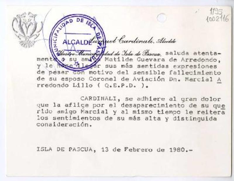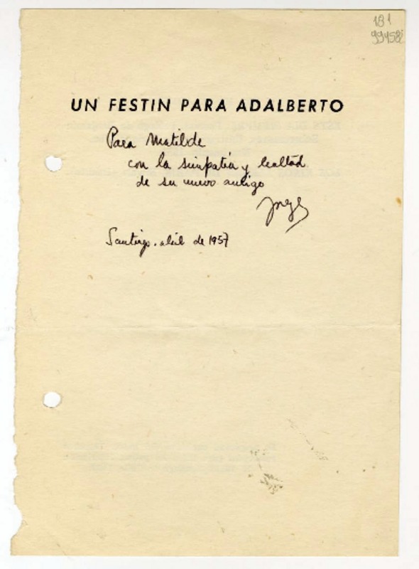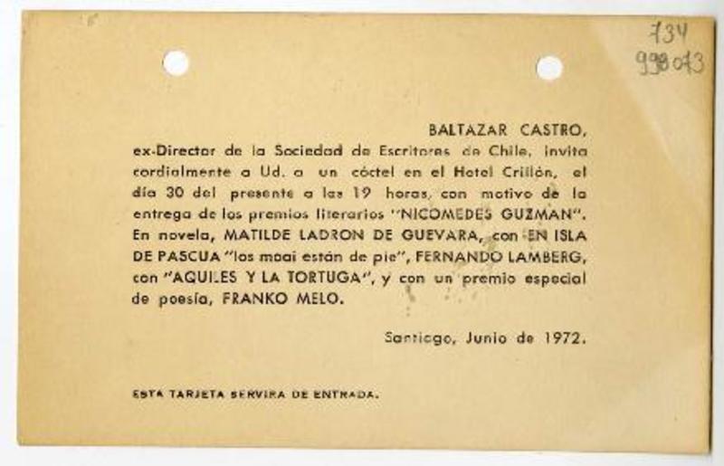 Santiago, Chile [a] Justo Alarcón Reyes Tarjeta, 1984, [manuscrito] Matilde Ladrón de Guevara.