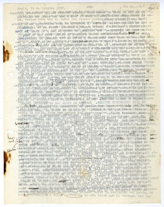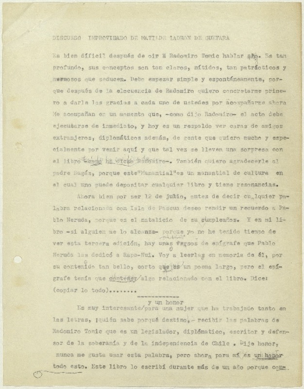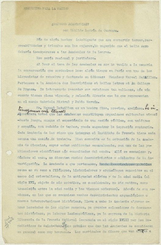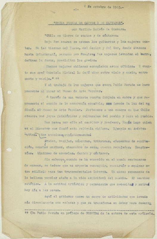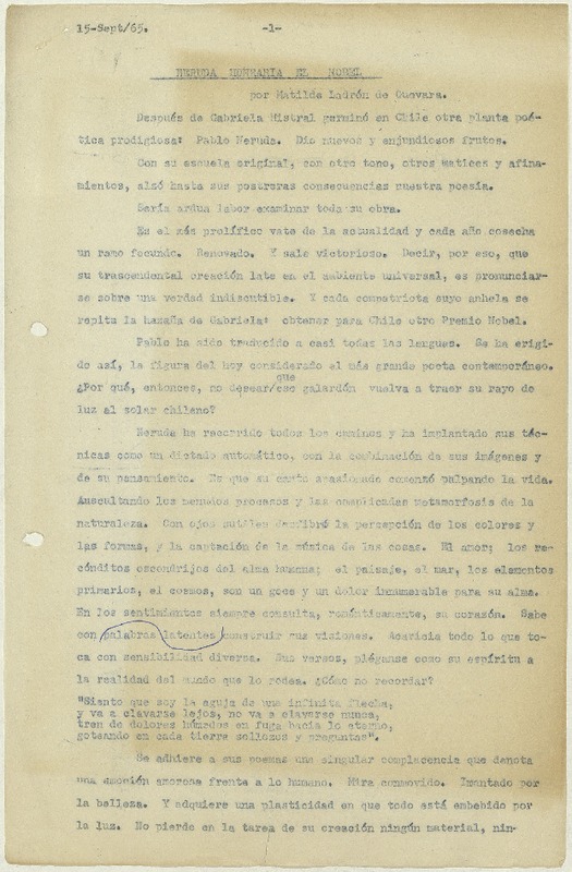 [Acerca de Pablo Neruda] [manuscrito] Matilde Ladrón de Guevara.