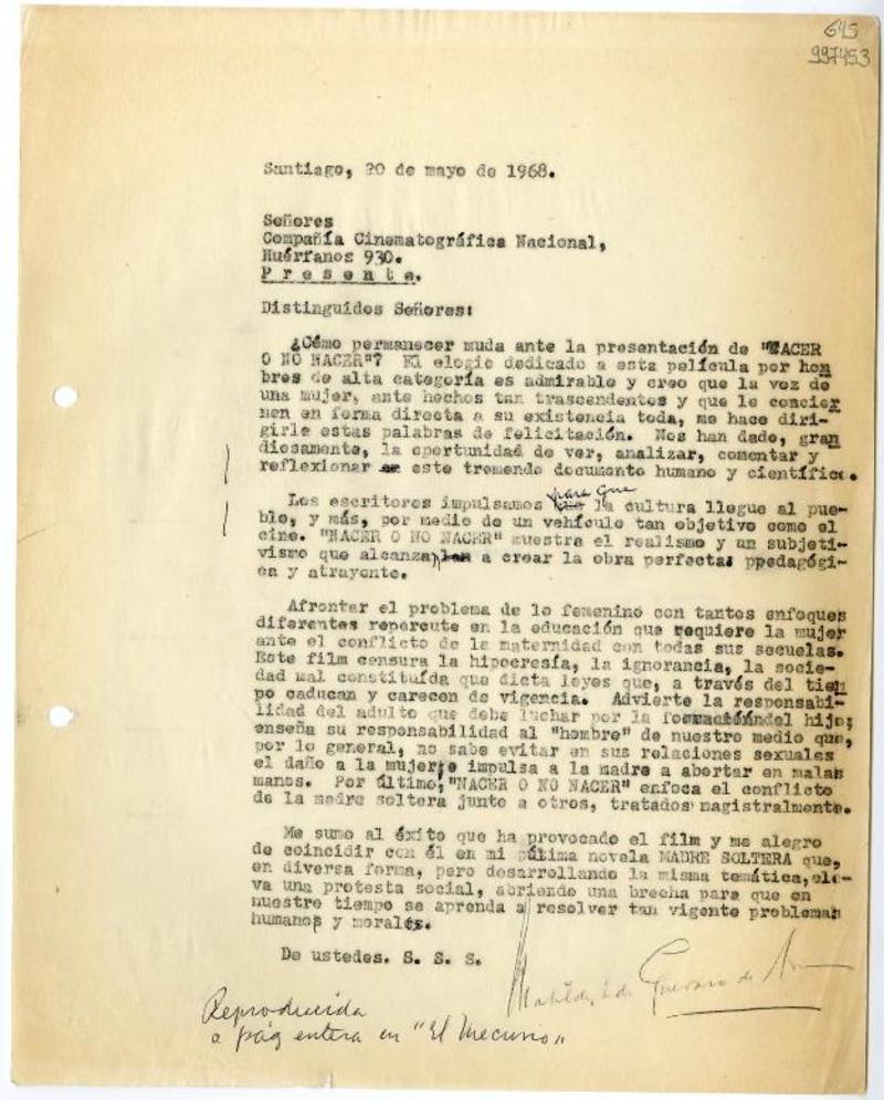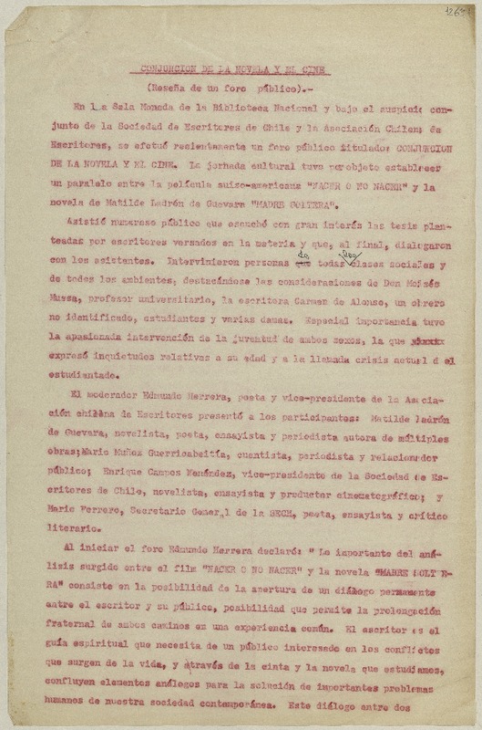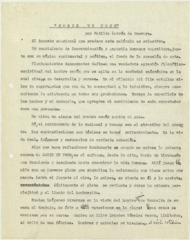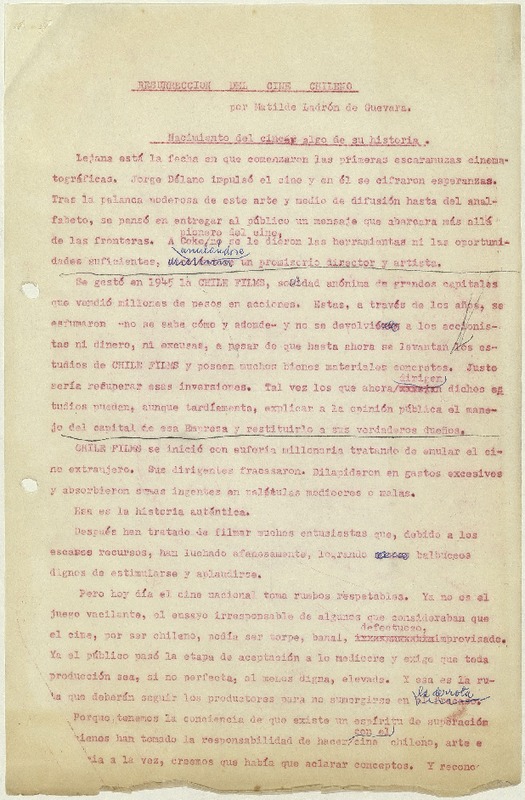 Resurrección del cine chileno [manuscrito] Matilde Ladrón de Guevara.