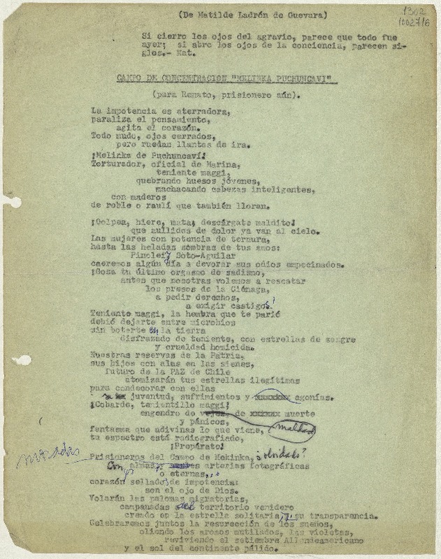 Campo de concentración Melinka Puchuncavi [manuscrito] Matilde Ladrón de Guevara.