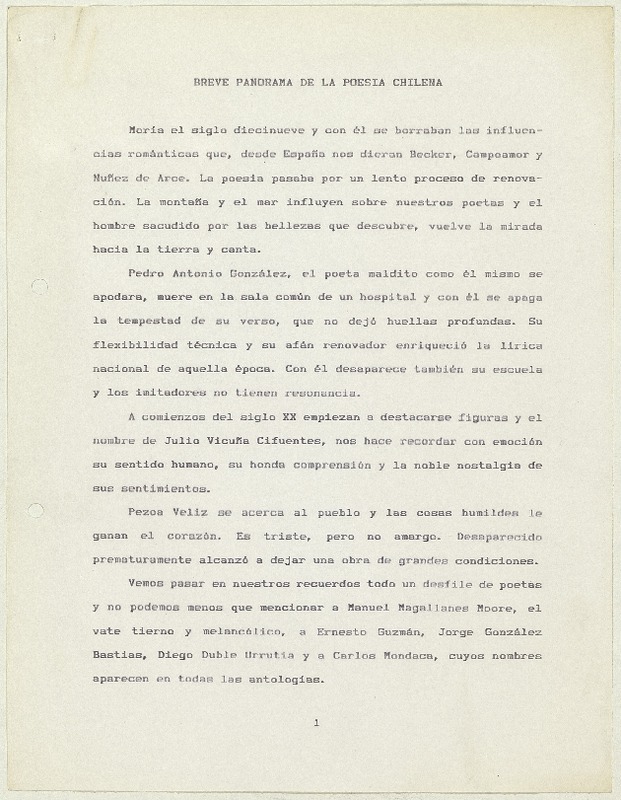 Breve panorama de la poesía chilena [manuscrito] [Matilde Ladrón de Guevara].