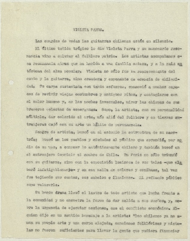 Violeta Parra [manuscrito] Matilde Ladrón de Guevara.