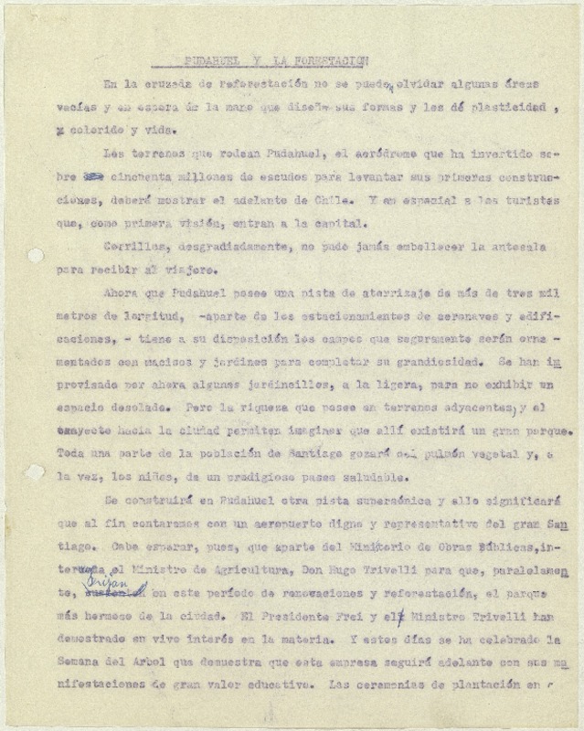Pudahuel y la forestación [manuscrito] Matilde Ladrón de Guevara.