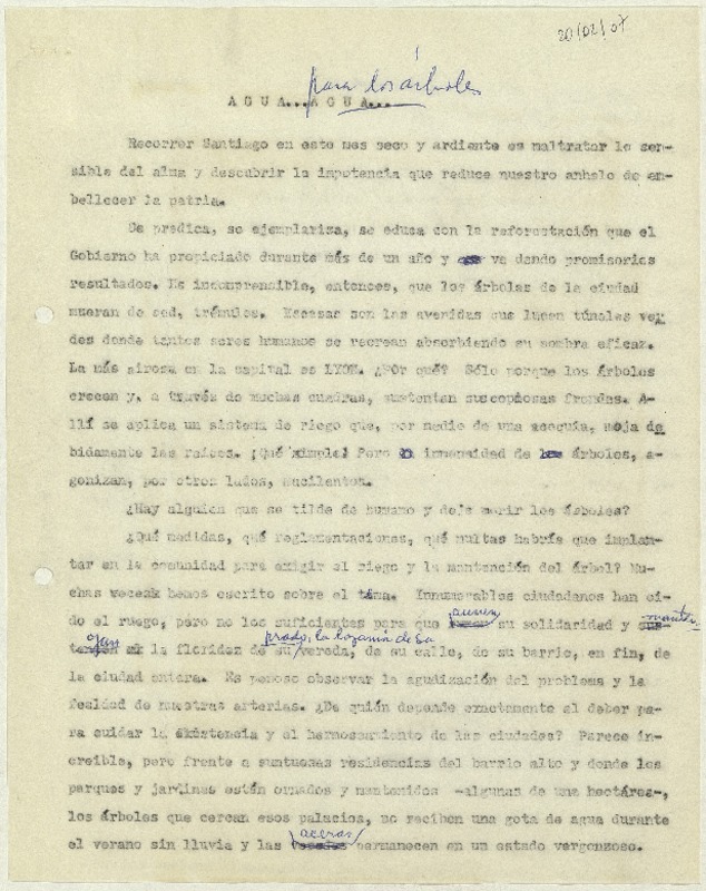 Agua para los árboles [manuscrito] Matilde Ladrón de Guevara.