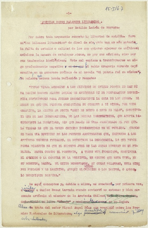 Trascendencia de premios literarios [manuscrito] Matilde Ladrón de Guevara.