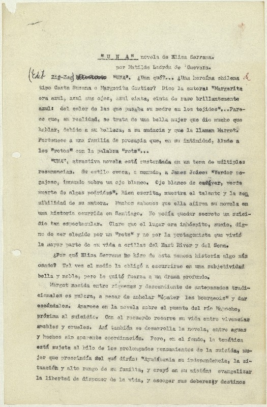 Una - Serrana, Elisa - Novela - Reseñas de libros - Manuscritos chilenos
