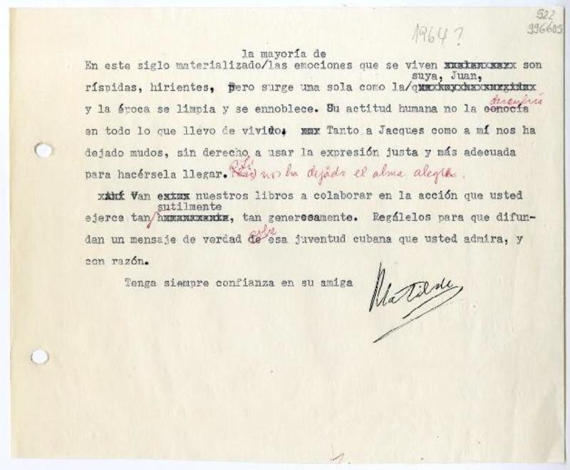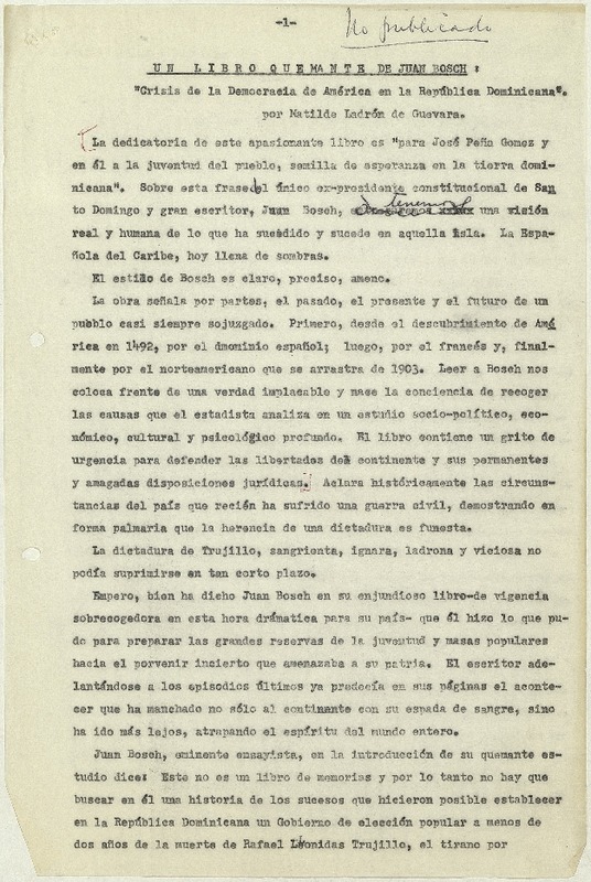 "Un libro quemante" de Juan Bosch [manuscrito] Matilde Ladrón de Guevara.