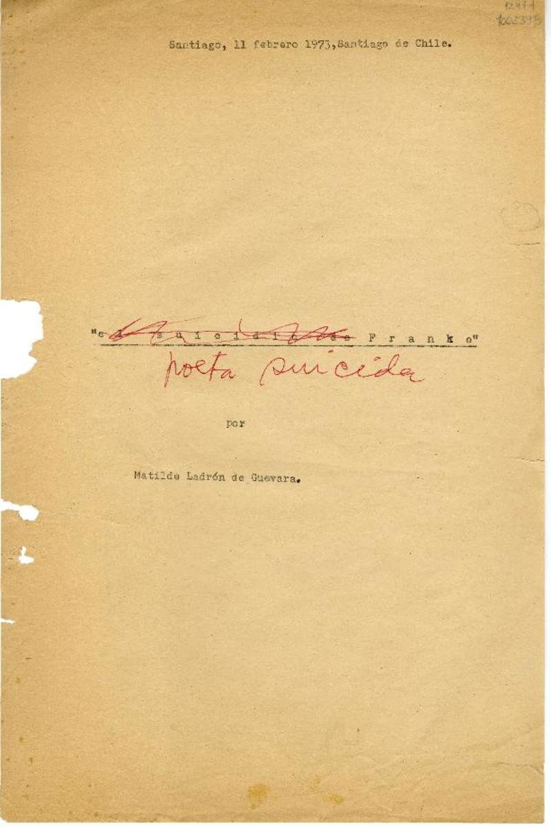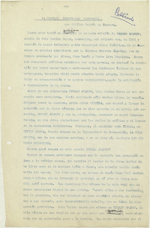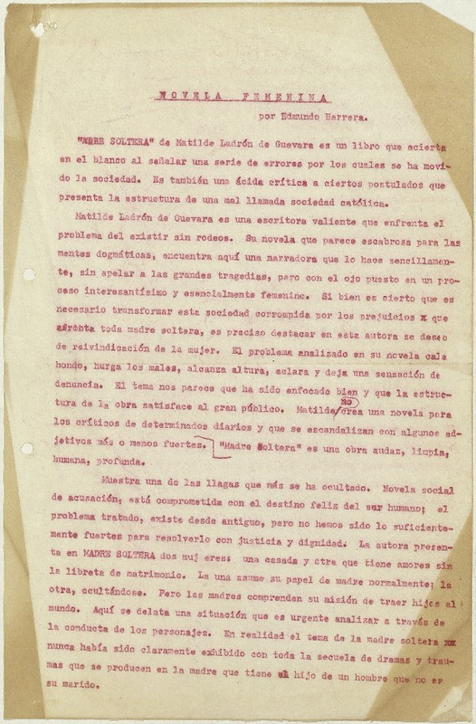 Unica novela de aspecto social de protesta escrita en Chile por una mujer [manuscrito] Matilde Ladrón de Guevara.