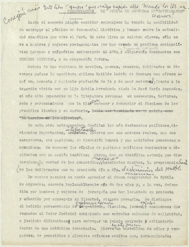 Sybila de Arguedas en Cantogrande [manuscrito] Matilde Ladrón de Guevara.
