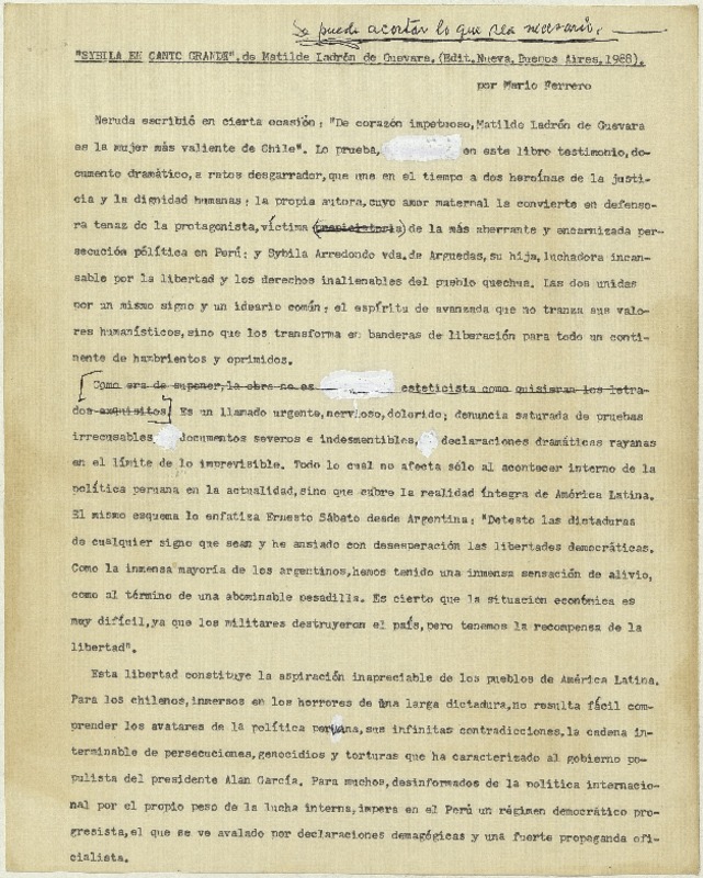 Sybila en Cantogrande [manuscrito] Mario Ferrero.