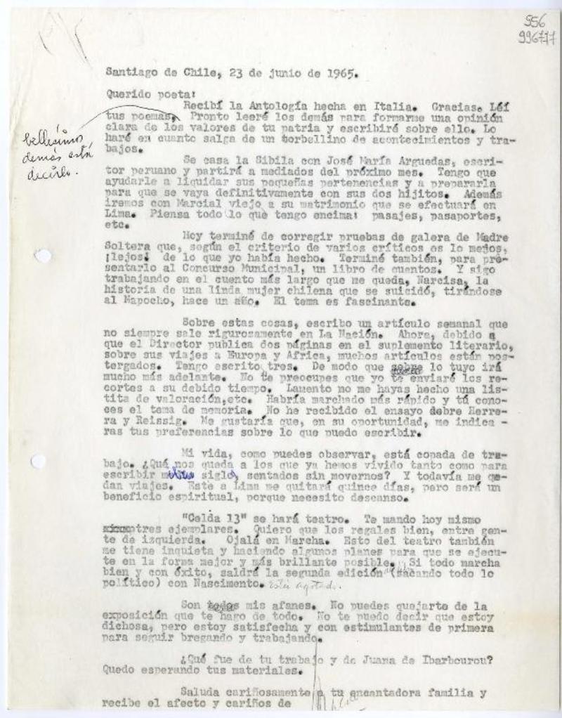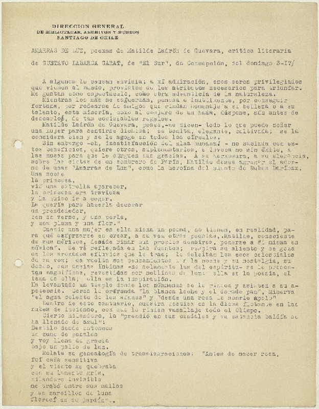Amarras de luz, poemas de Matilde Ladrón de Guevara [manuscrito] Gustavo Labarca Garat.