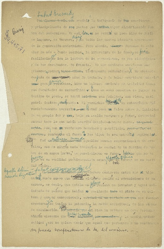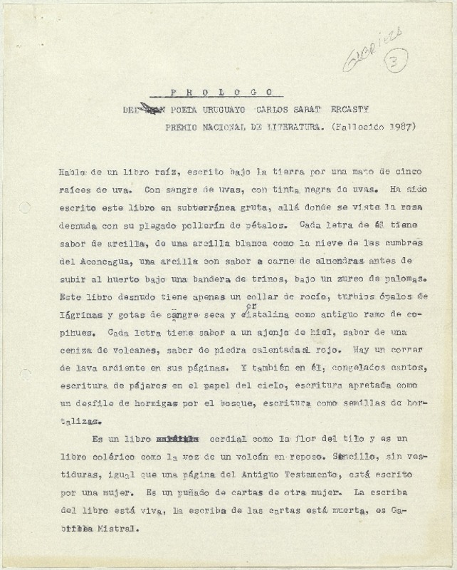 Prólogo [manuscrito] Carlos Sabat Ercasty.
