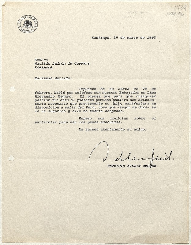 [Tarjeta] 1990 febrero 26, Santiago, Chile [a] Matilde Ladrón de Guevara [manuscrito] Patricio Aylwin Azócar.
