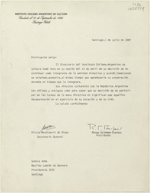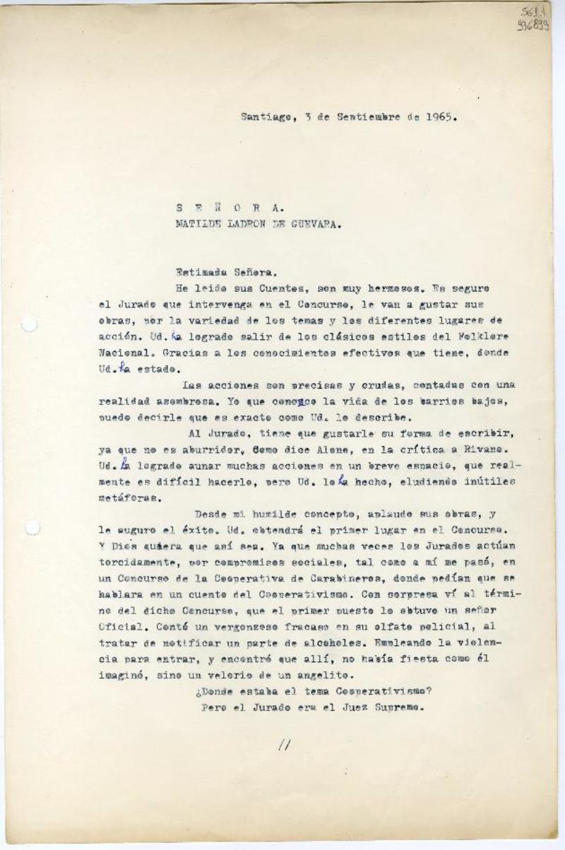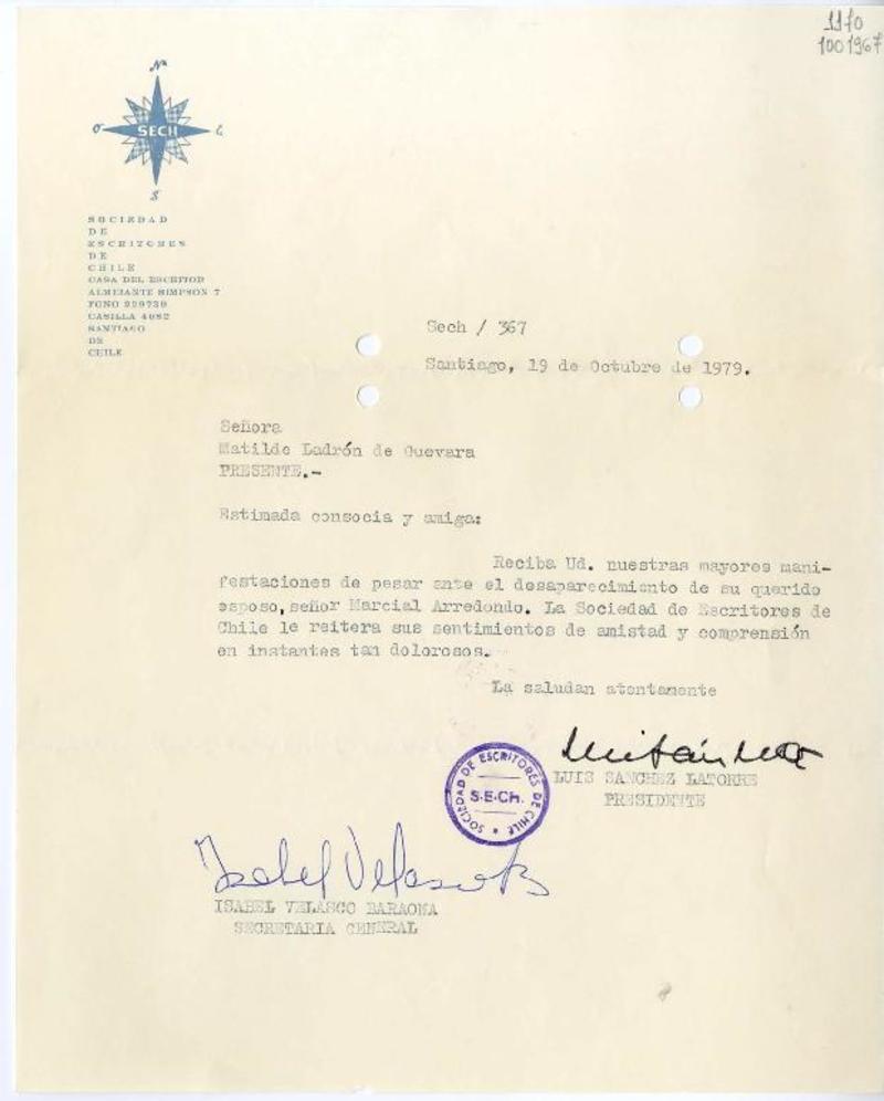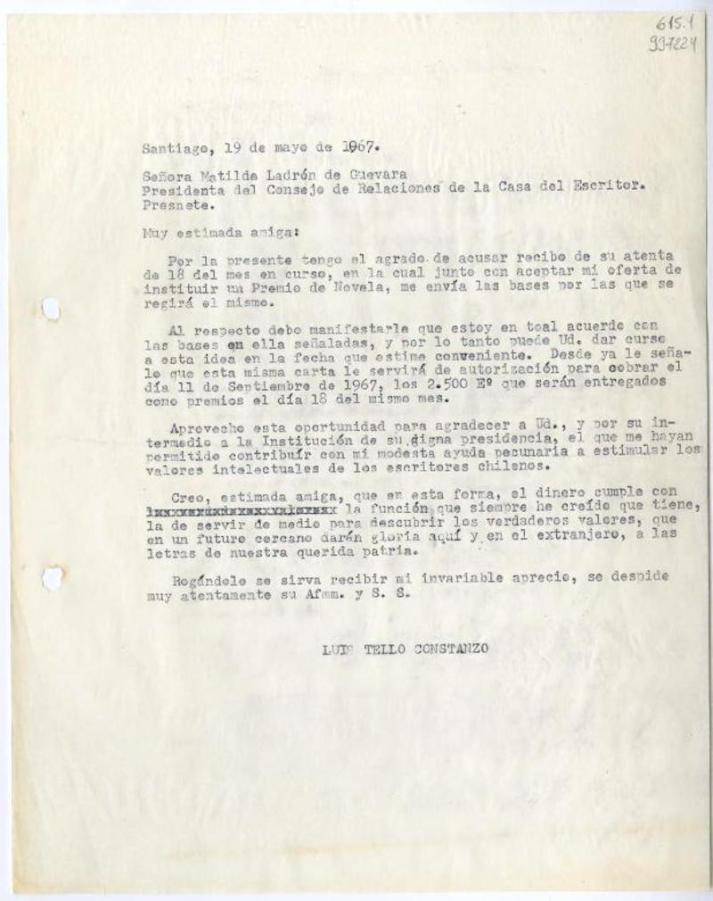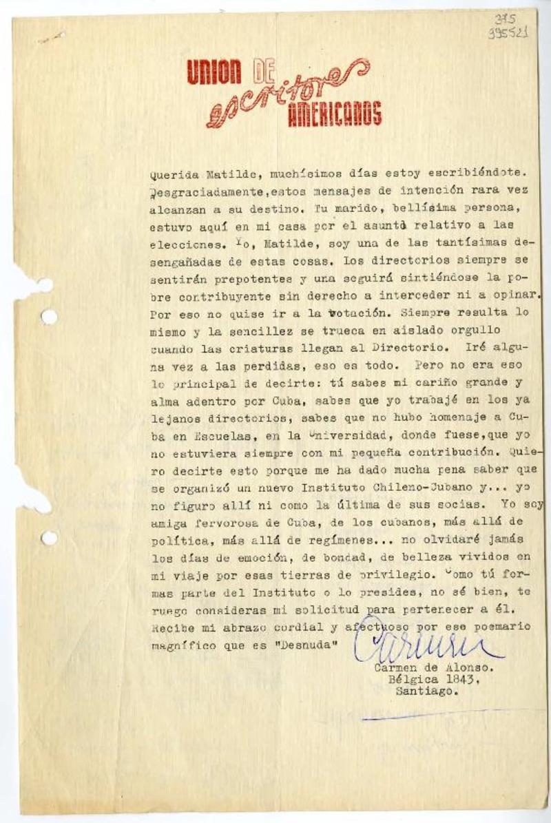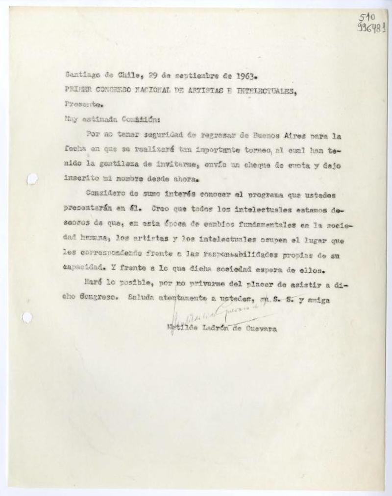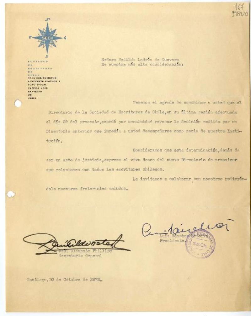 [Carta] 1951 septiembre 26, Santiago, [Chile] [a] Matilde Ladrón de Guevara [manuscrito] Carlos Préndez Saldías, Presidente ; Benjamín Morgado, Secretario.