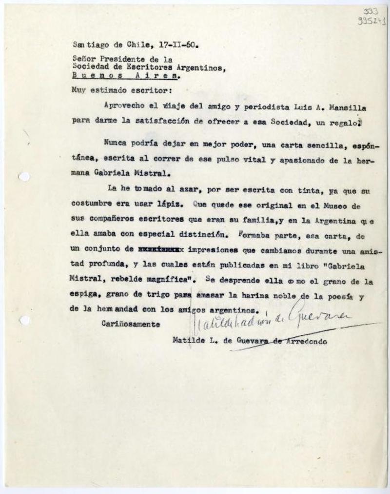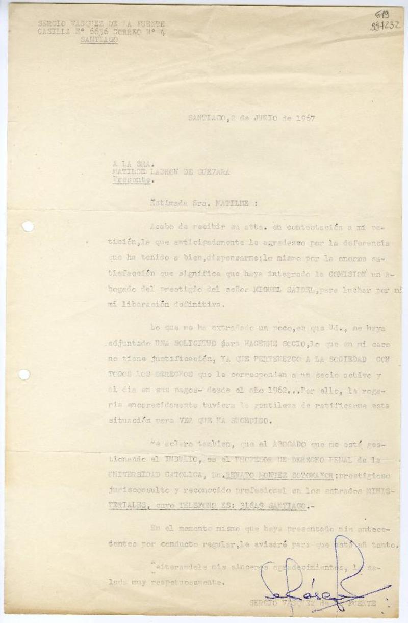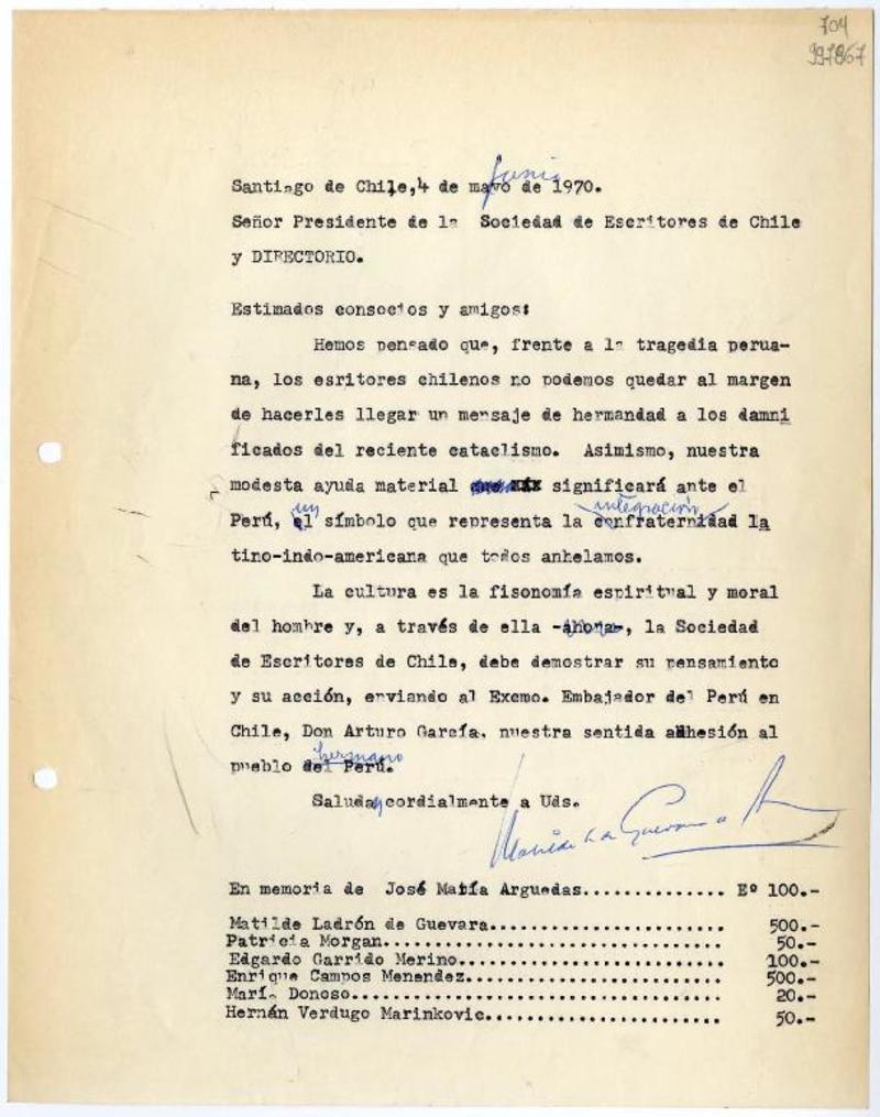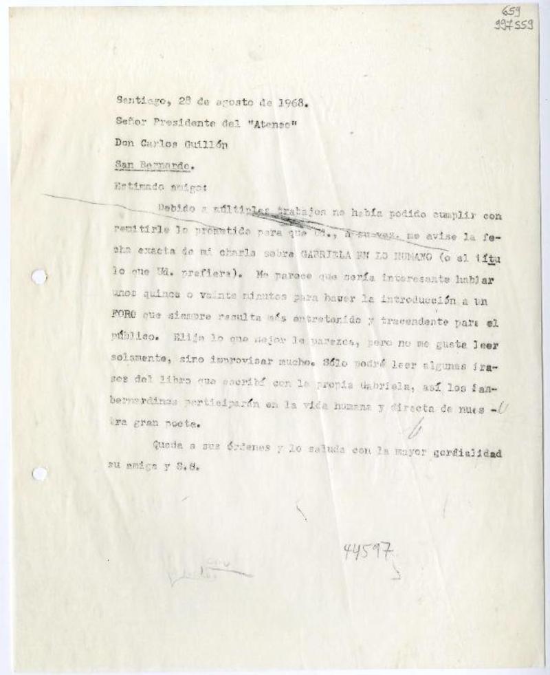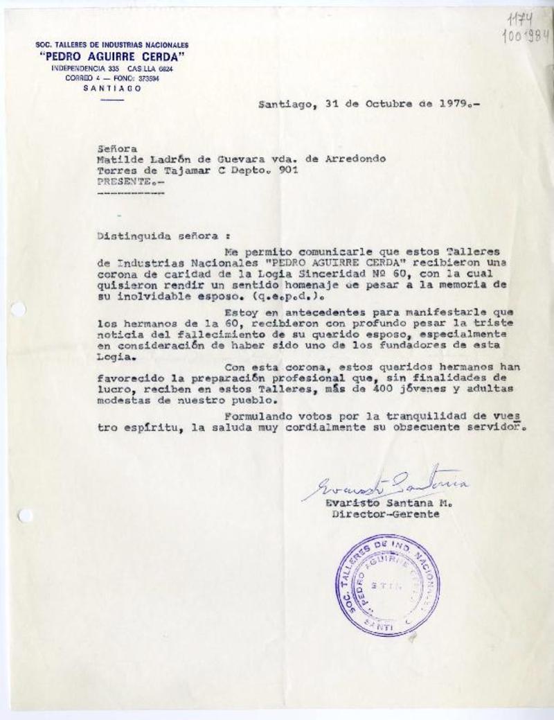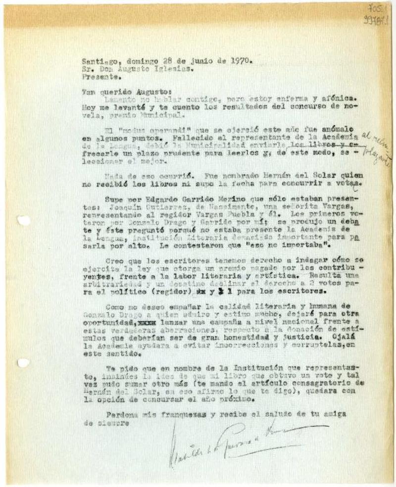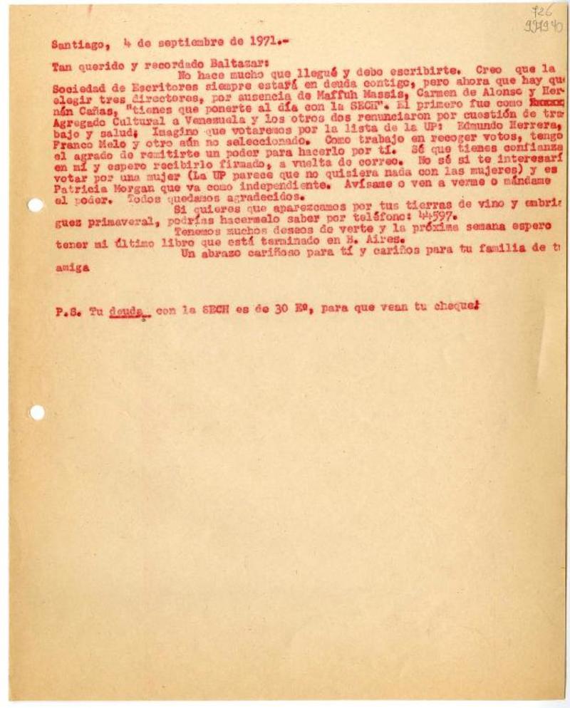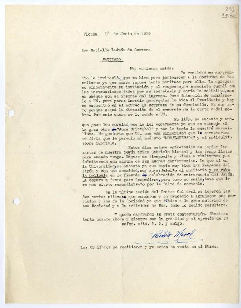 [Carta] 1951 septiembre 26, Santiago, [Chile] [a] Matilde Ladrón de Guevara [manuscrito] Carlos Préndez Saldías, Presidente ; Benjamín Morgado, Secretario.