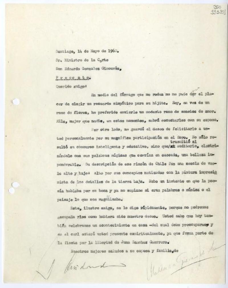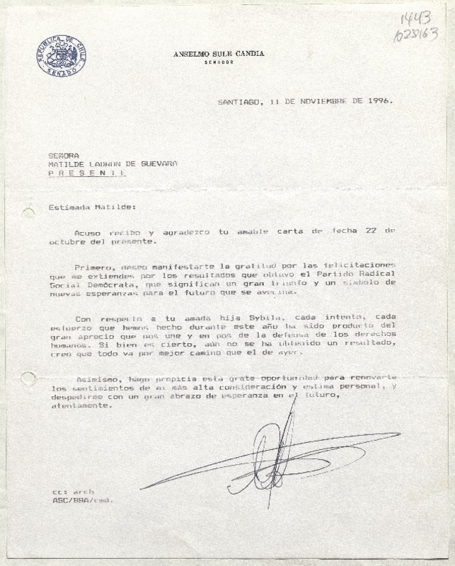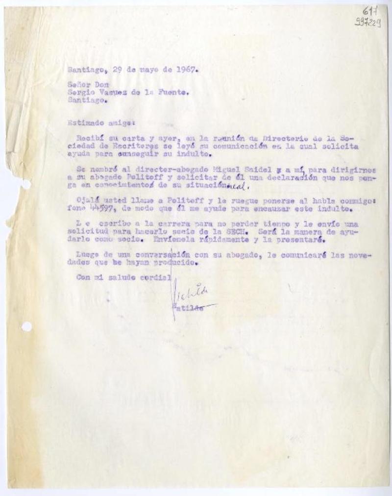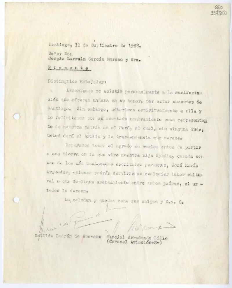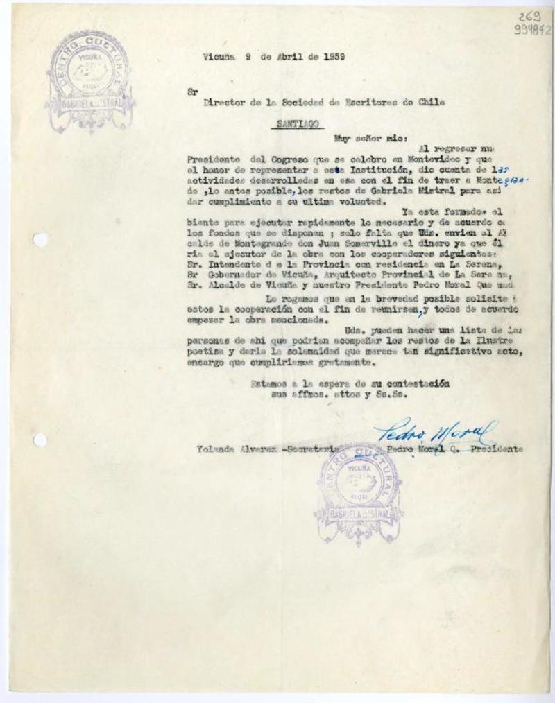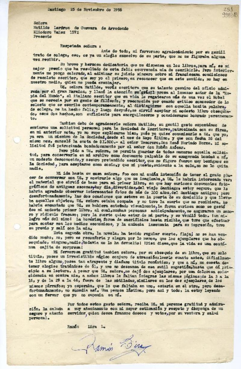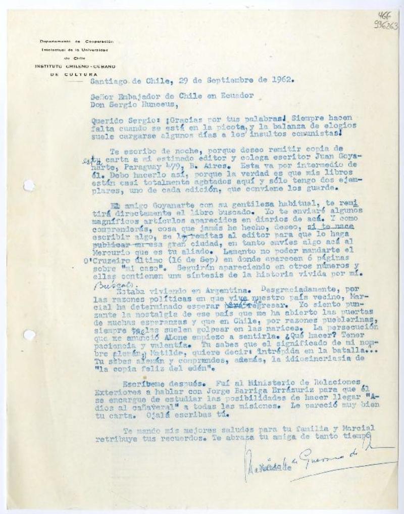 [Carta] 1951 septiembre 26, Santiago, [Chile] [a] Matilde Ladrón de Guevara [manuscrito] Carlos Préndez Saldías, Presidente ; Benjamín Morgado, Secretario.
